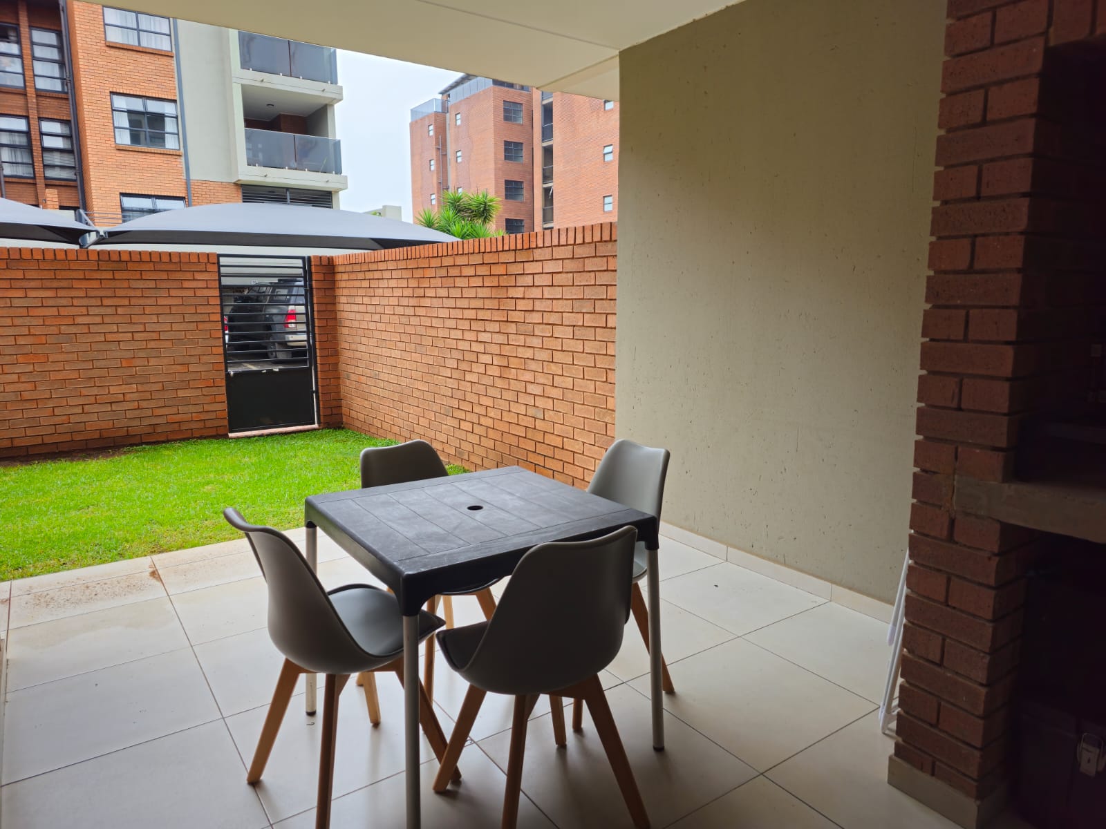 Open the sliding doors to your private covered patio, complete with a built-in braai and access from both the lounge and the main bedroom — the perfect setting for weekend get-togethers or quiet morning coffees. The surrounding green lawn adds a touch of nature, ideal for children, pets, or unwinding outdoors.