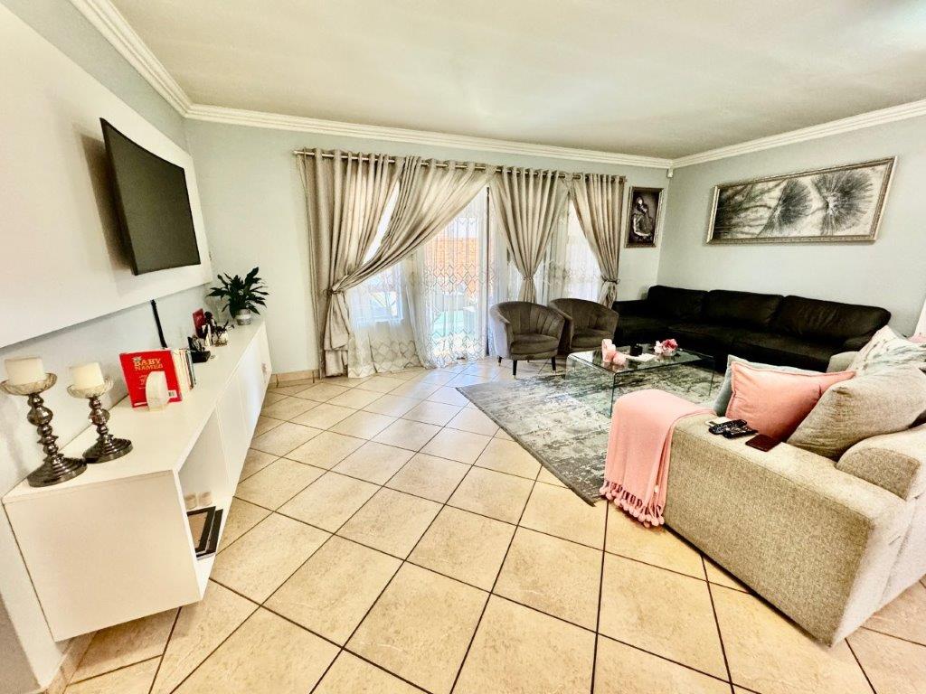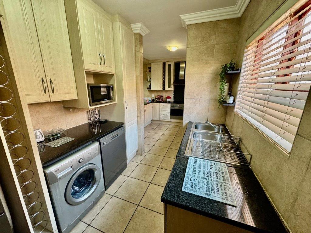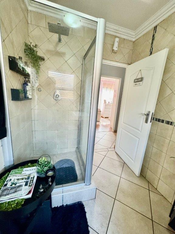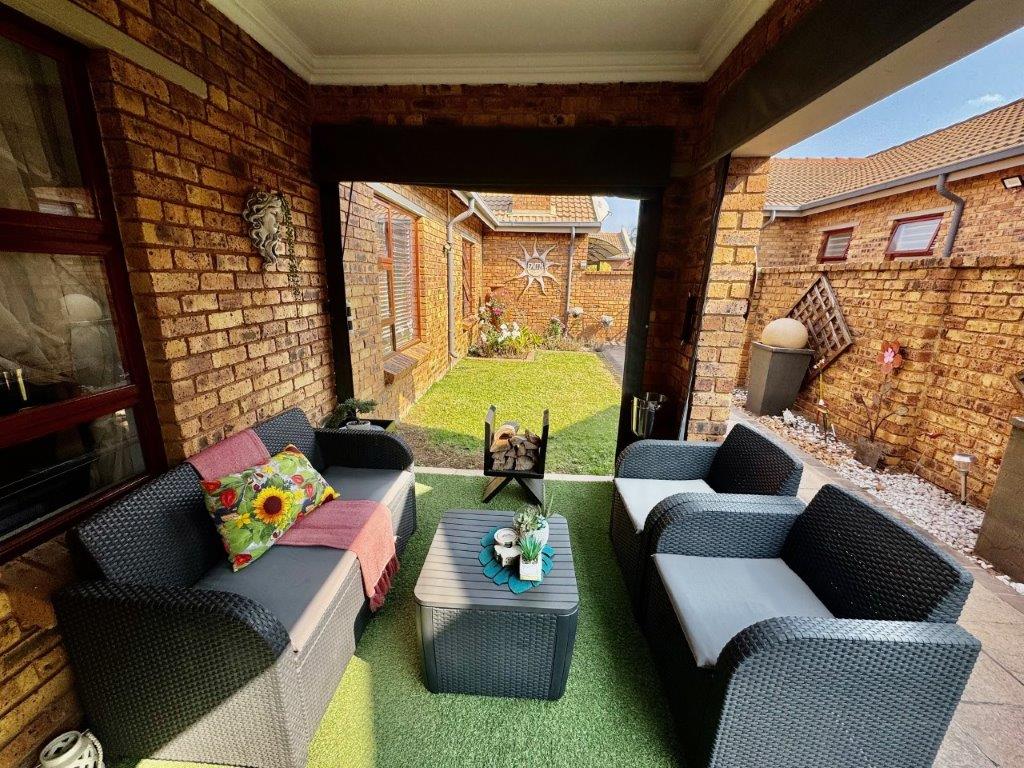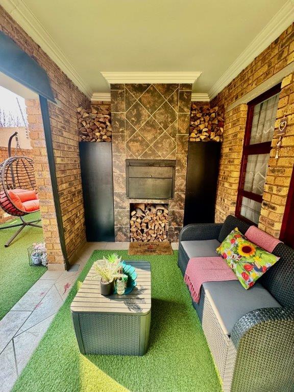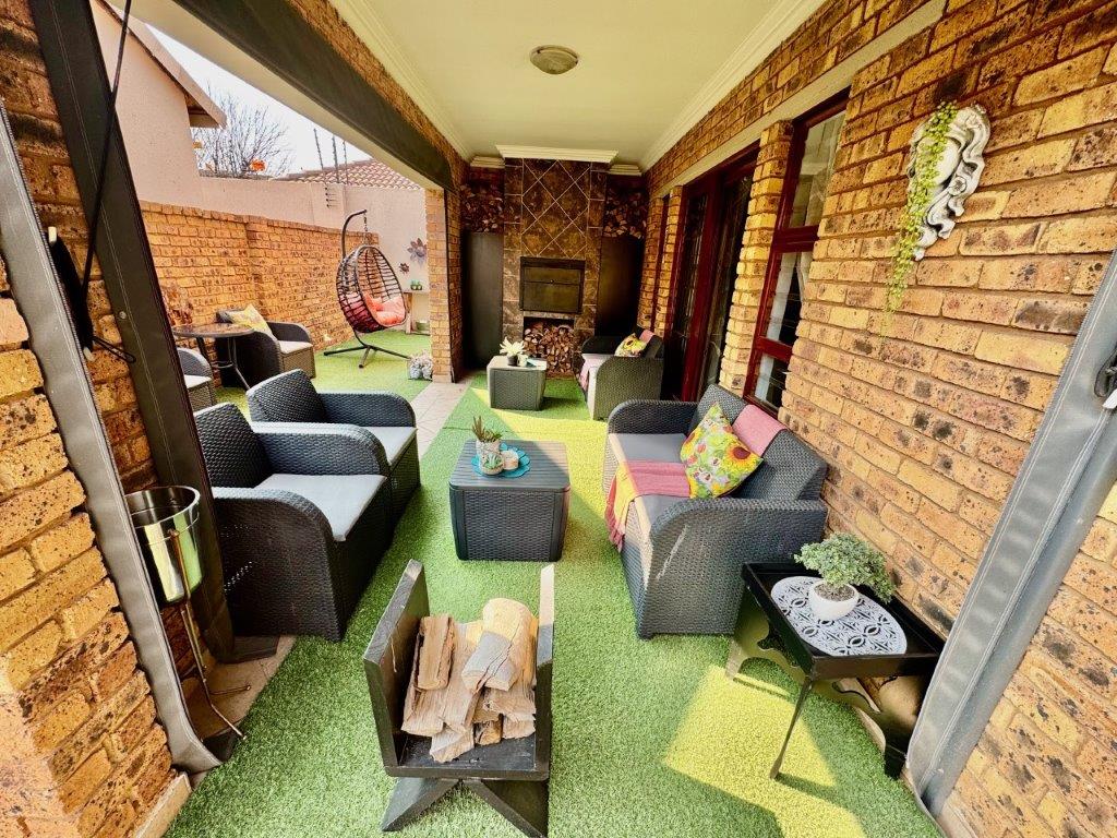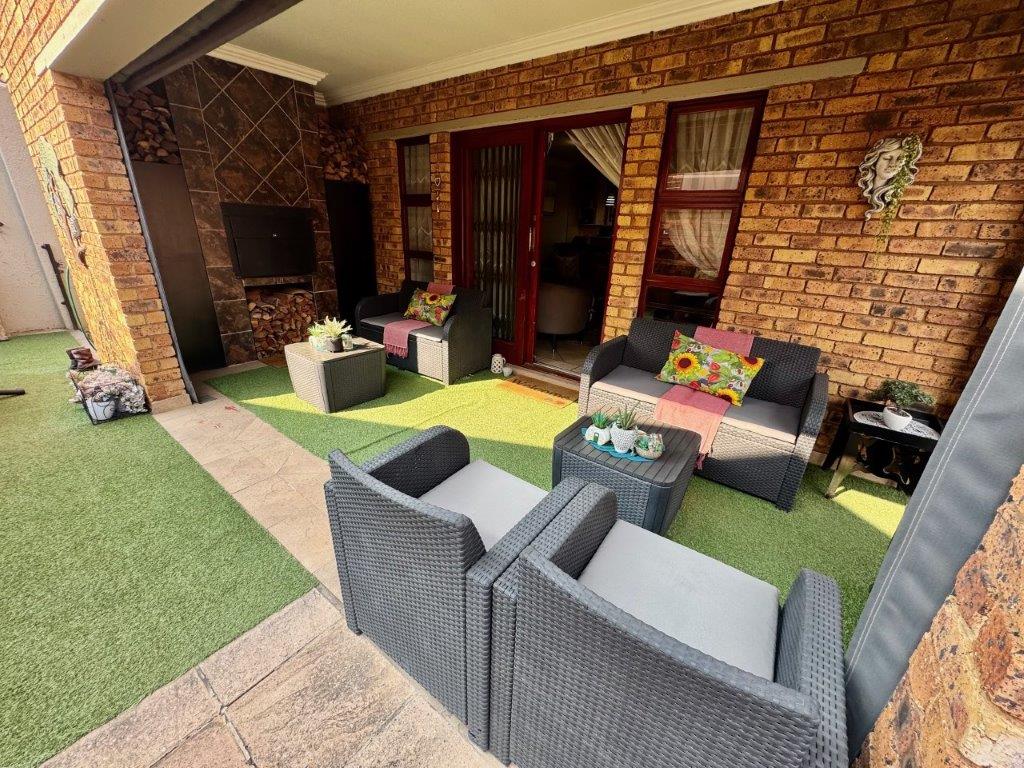 The large lounge flows seamlessly to a covered patio with a built-in braai and a manicured private garden – perfect for entertaining. A newly installed awning adds extra comfort and shade.