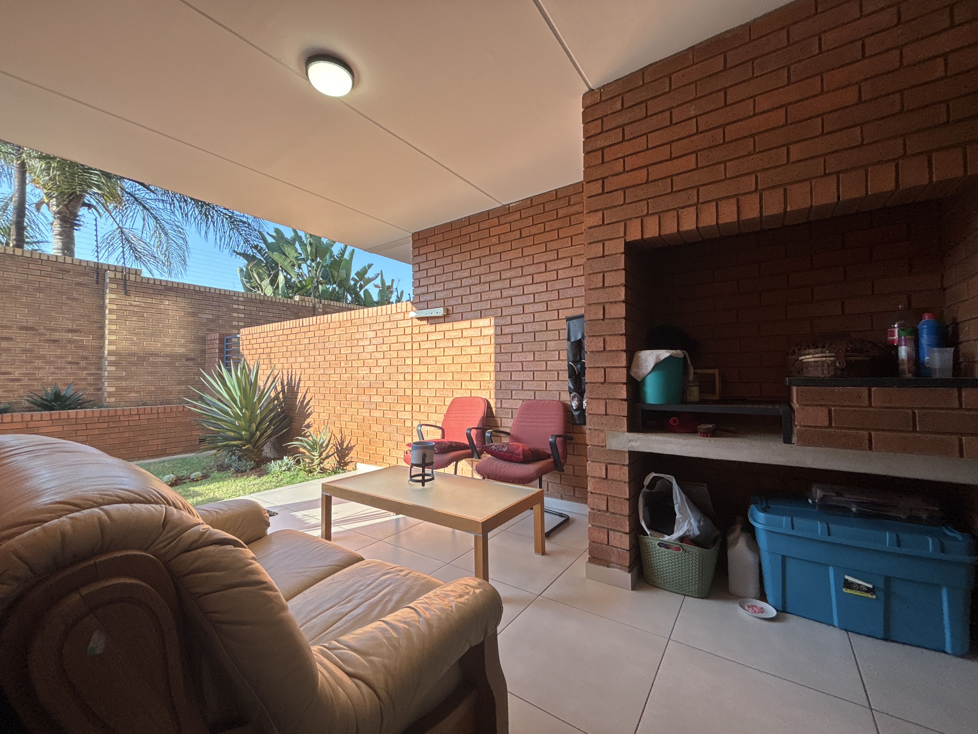 A covered patio with built-in braai, opening onto a large private garden – perfect for family gatherings and outdoor enjoyment