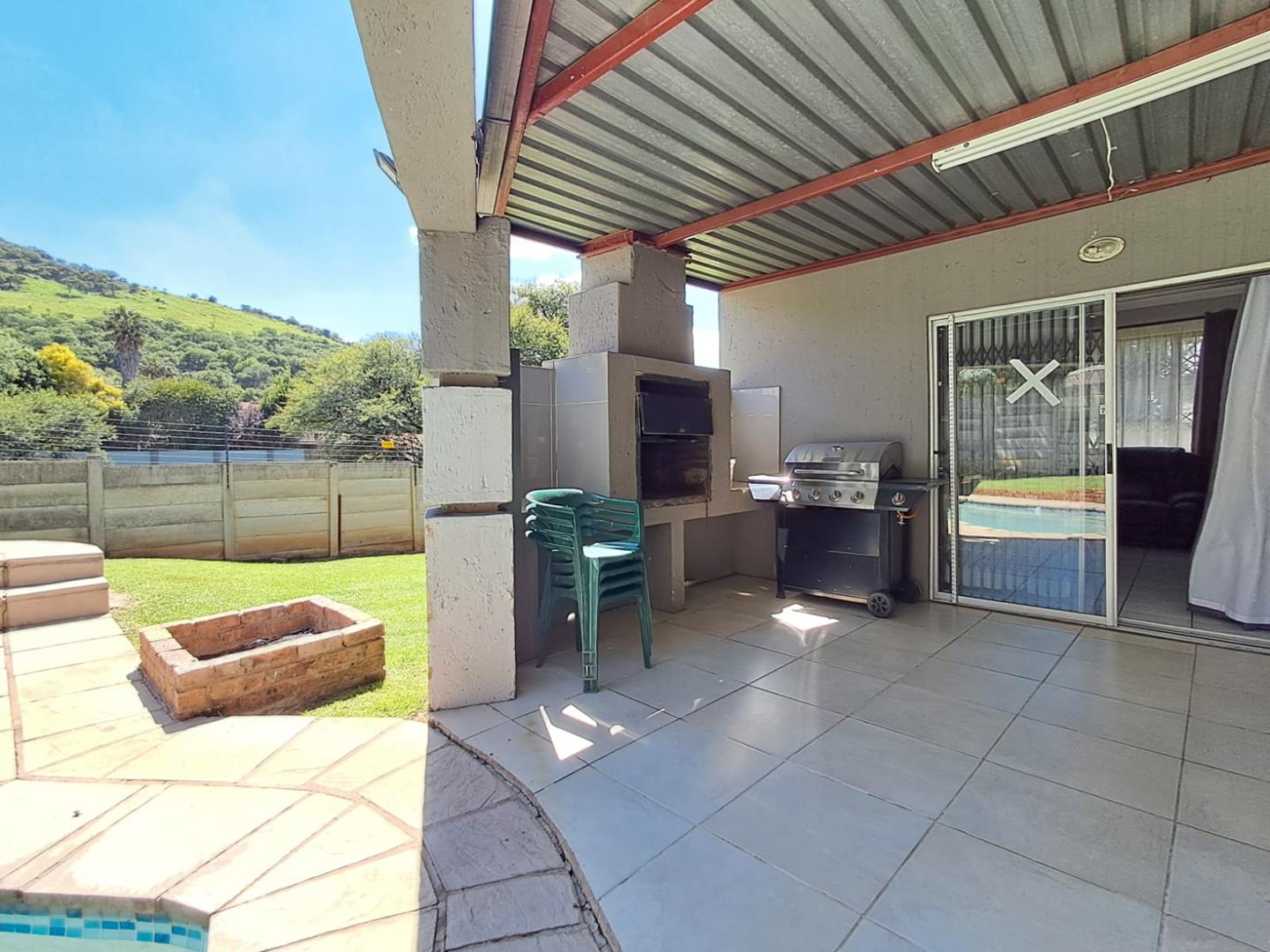 The fully fitted kitchen is a culinary enthusiast's paradise, featuring a gas stove and an integrated laundry area for added convenience. Cozy up by the fireplace in the lounge, or entertain guests in style under the covered entertainment area, complete with a built-in braai.