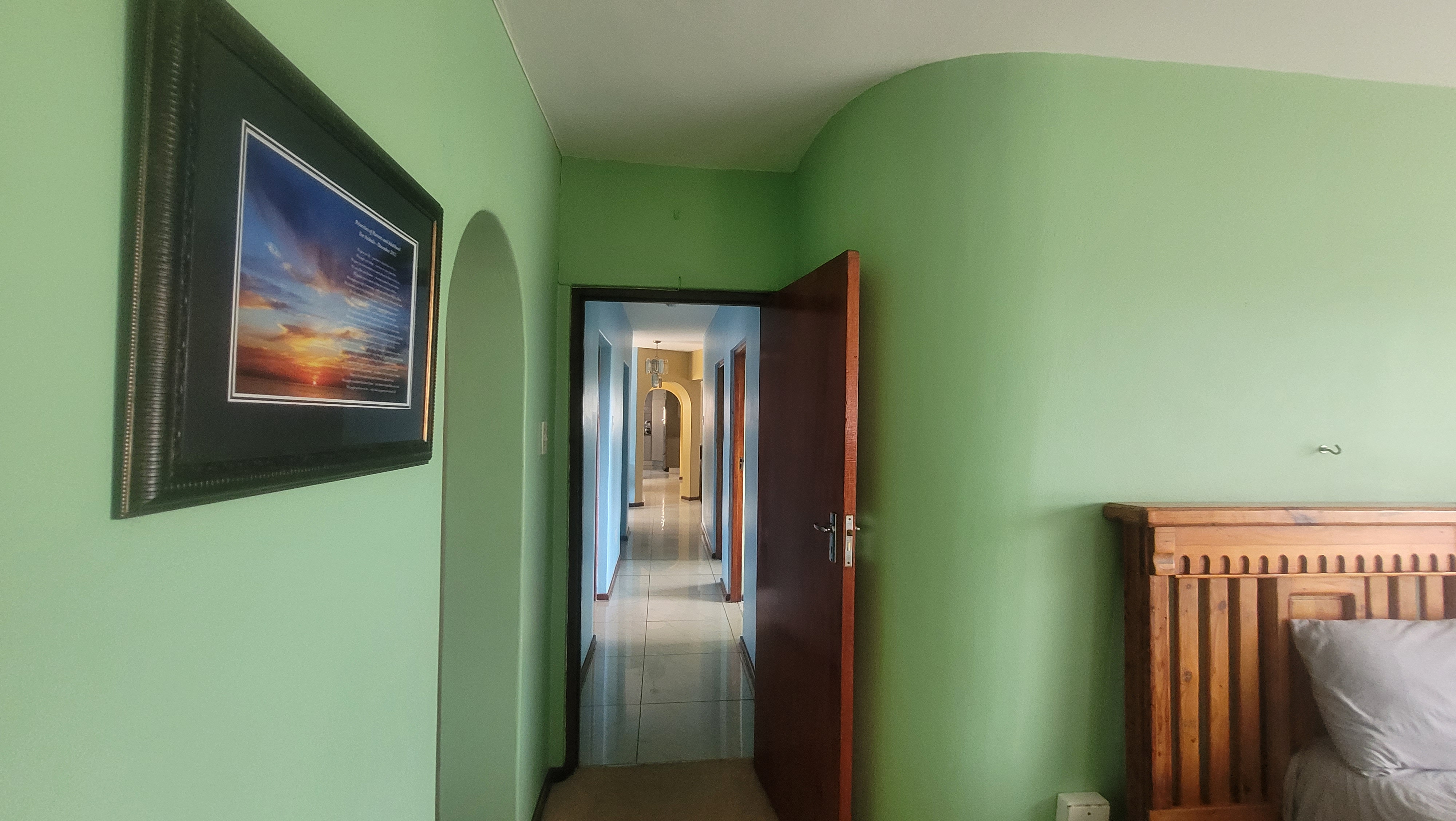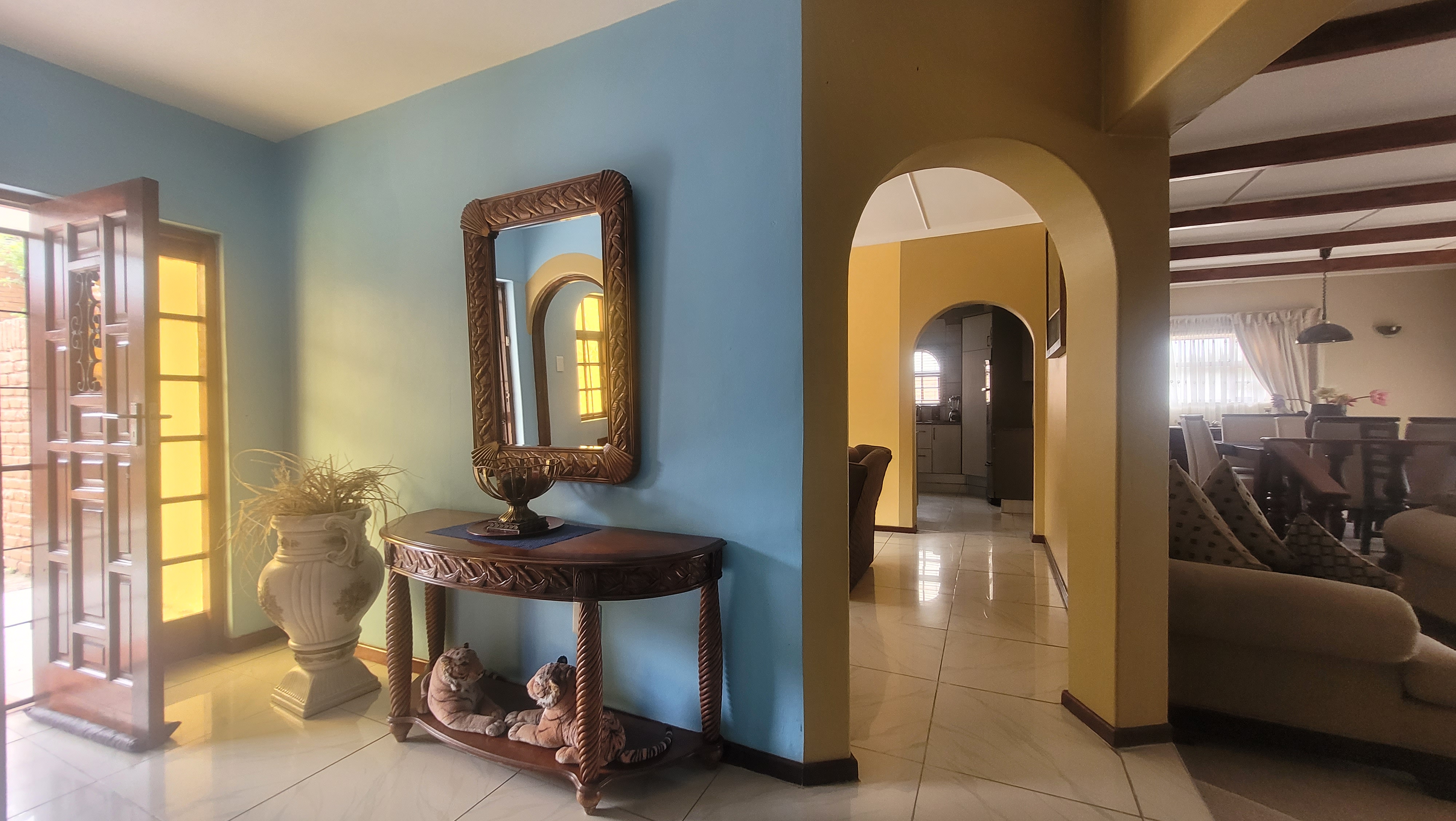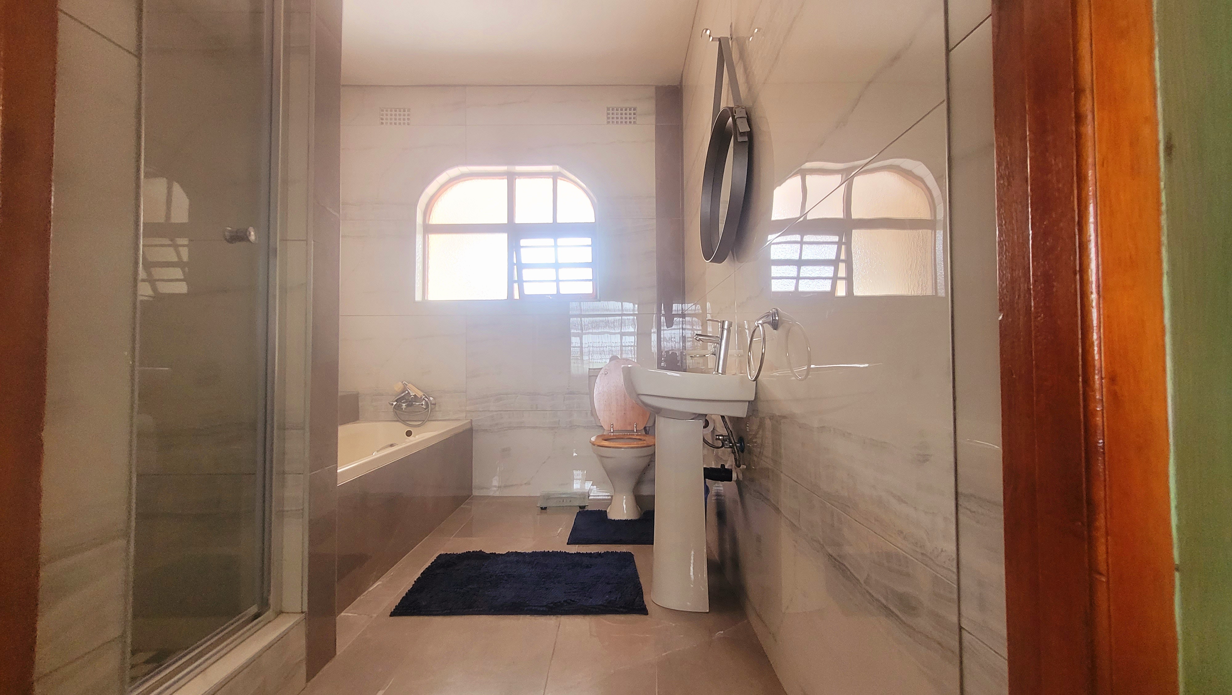 To the right down the passage, find 4 bedrooms, one of which is ensuite and boasts a walk-in closet. There is a family bathroom and a separate guest toilet for the other bedrooms. All other bedrooms are fitted with built-in wardrobes.