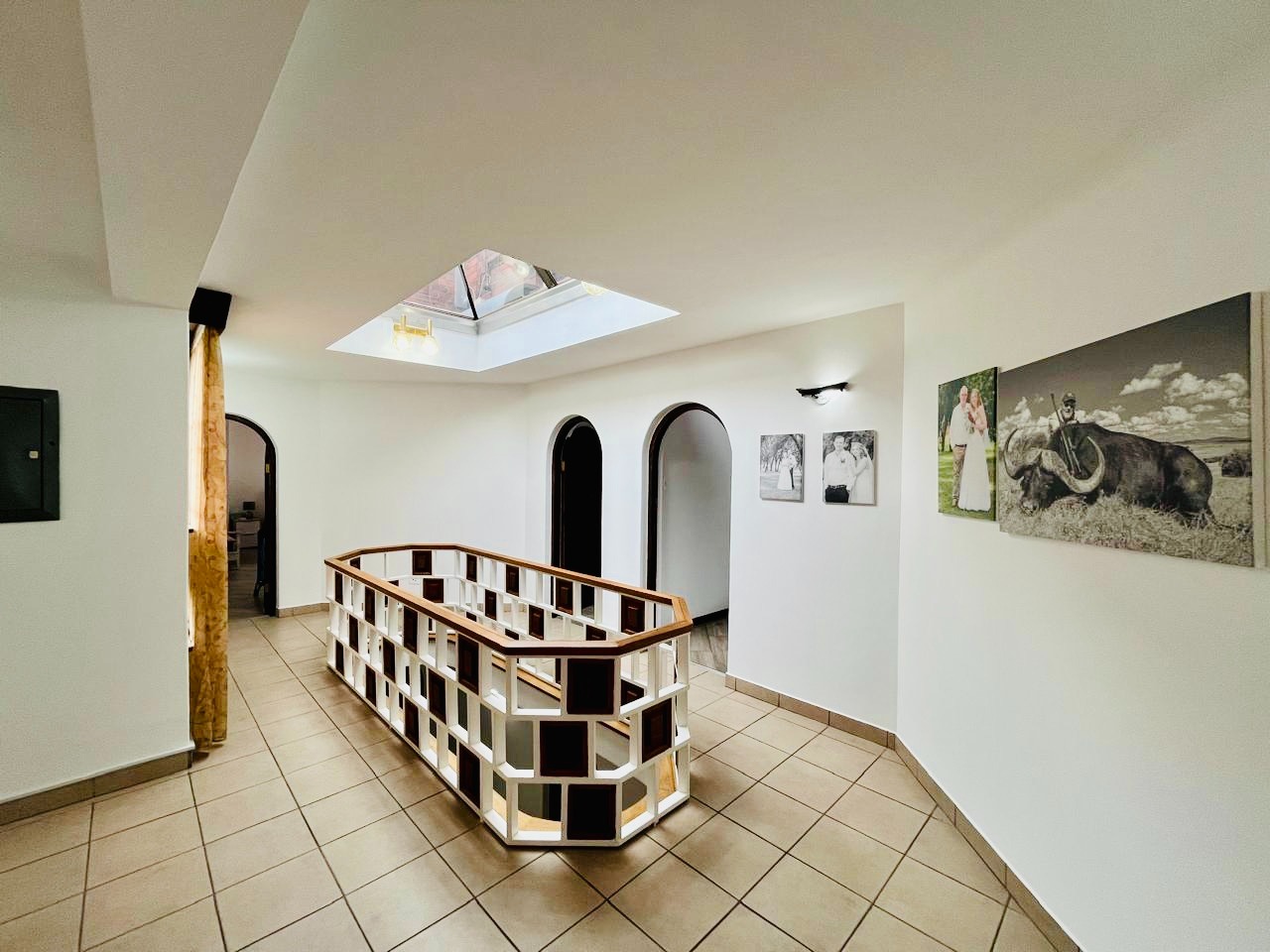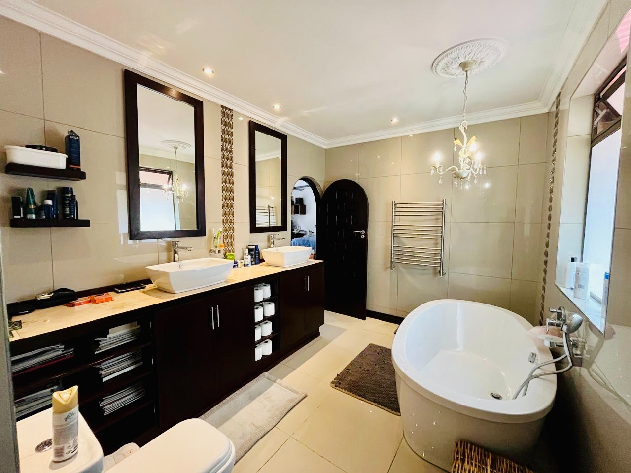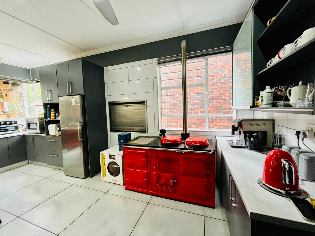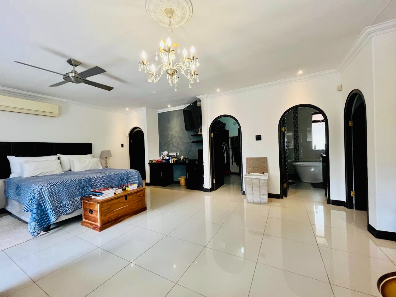 The exceptionally large kitchen is a culinary enthusiast's dream, complete with a scullery, pantry, and additional space for refrigeration and storage. It boasts a built-in braai, an AGA stove, and a gas stove, catering to diverse cooking preferences. All bedrooms are situated on the upper floor; four share two bathrooms and each includes air conditioning and walk-in cupboards. The master suite is a sanctuary, featuring a private balcony for relaxation, three walk-in cupboards, a safe, and an elegant en-suite bathroom with both a shower and a bath.