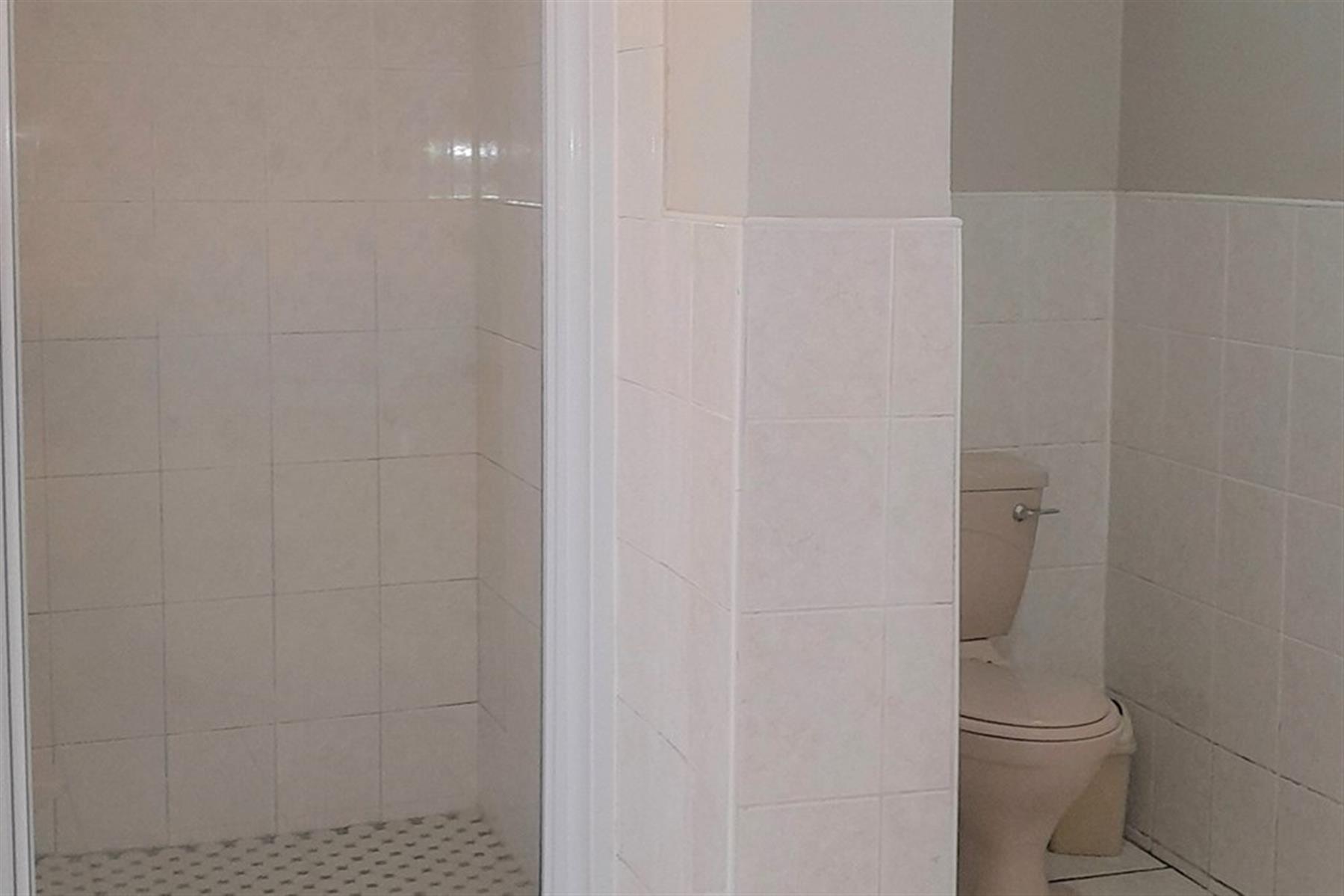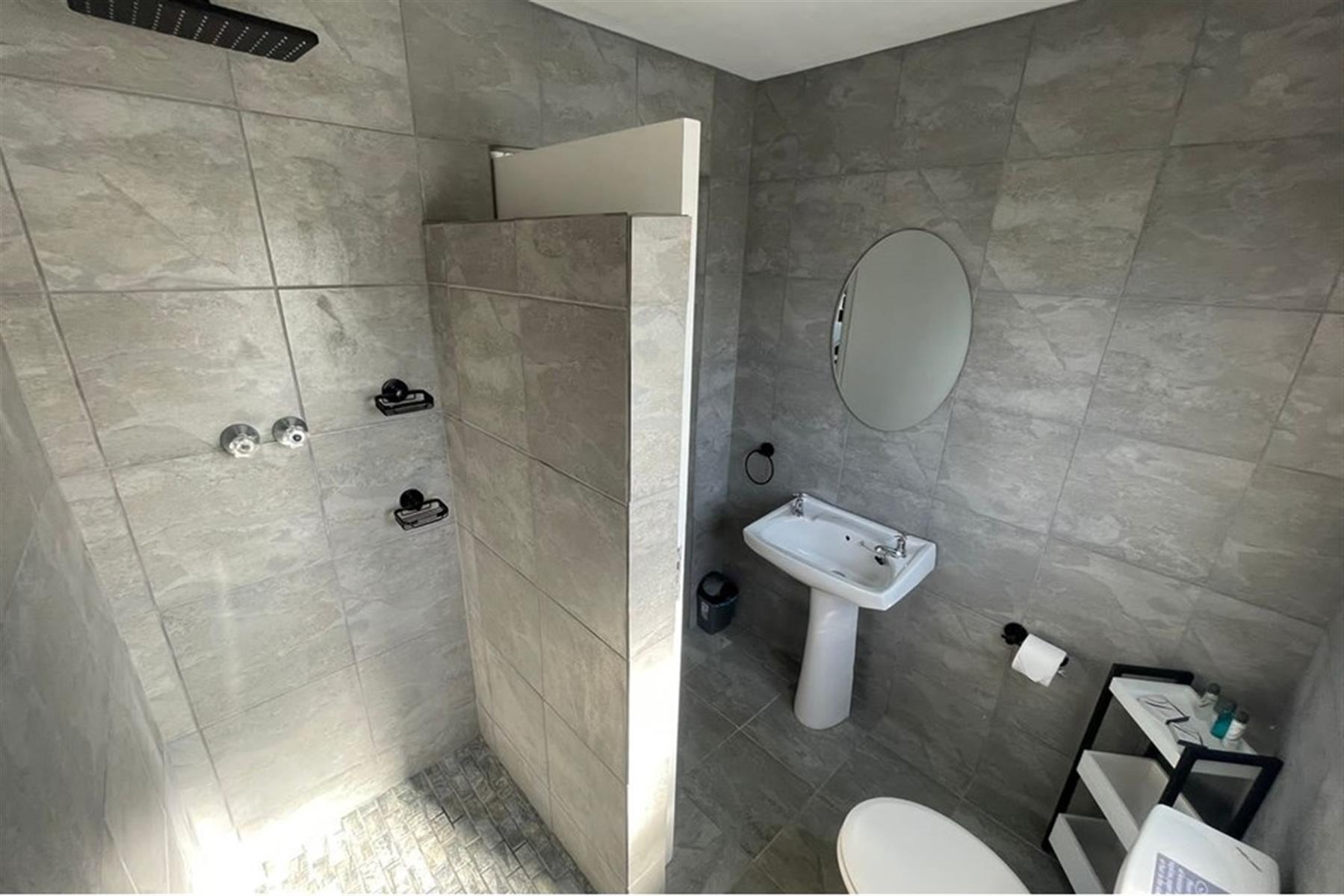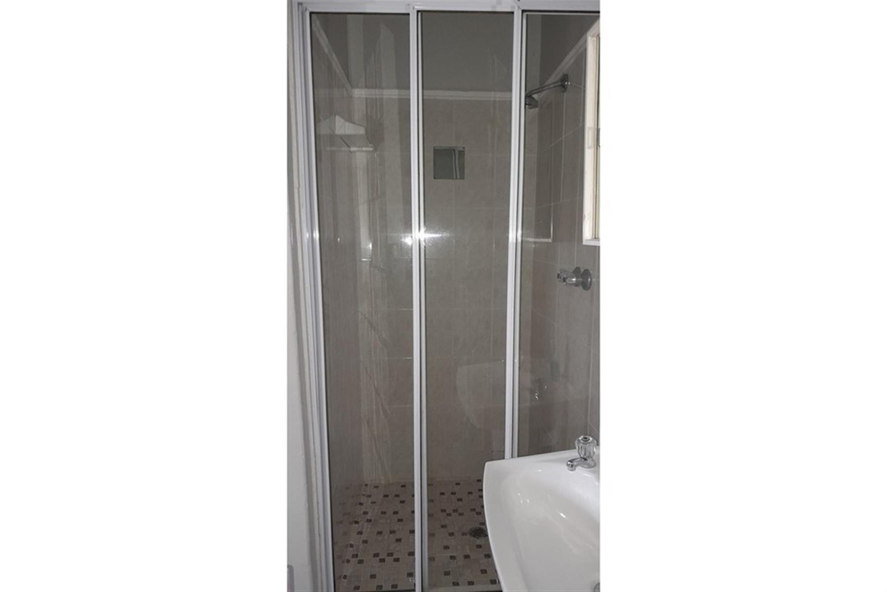 1 bathroom with a shower, basin, and toilet.