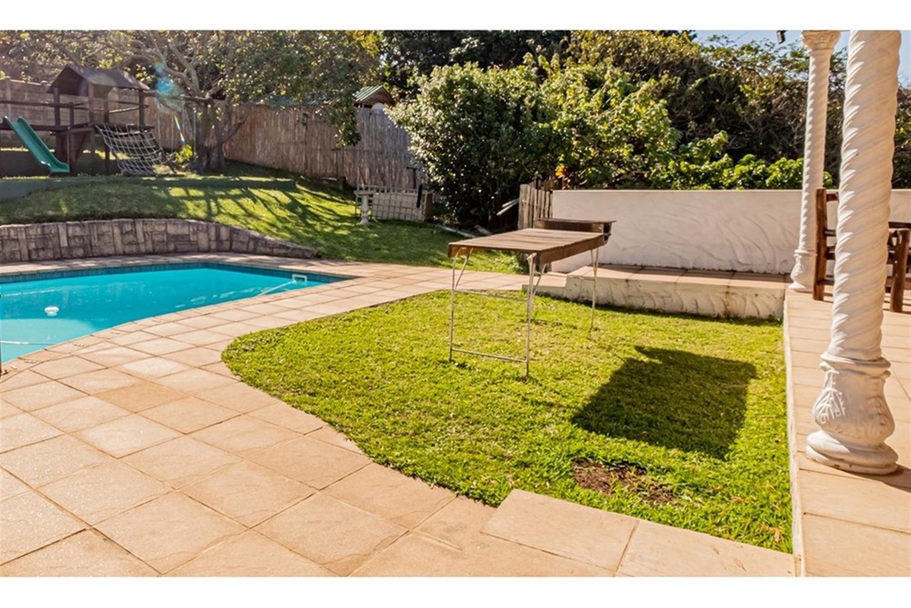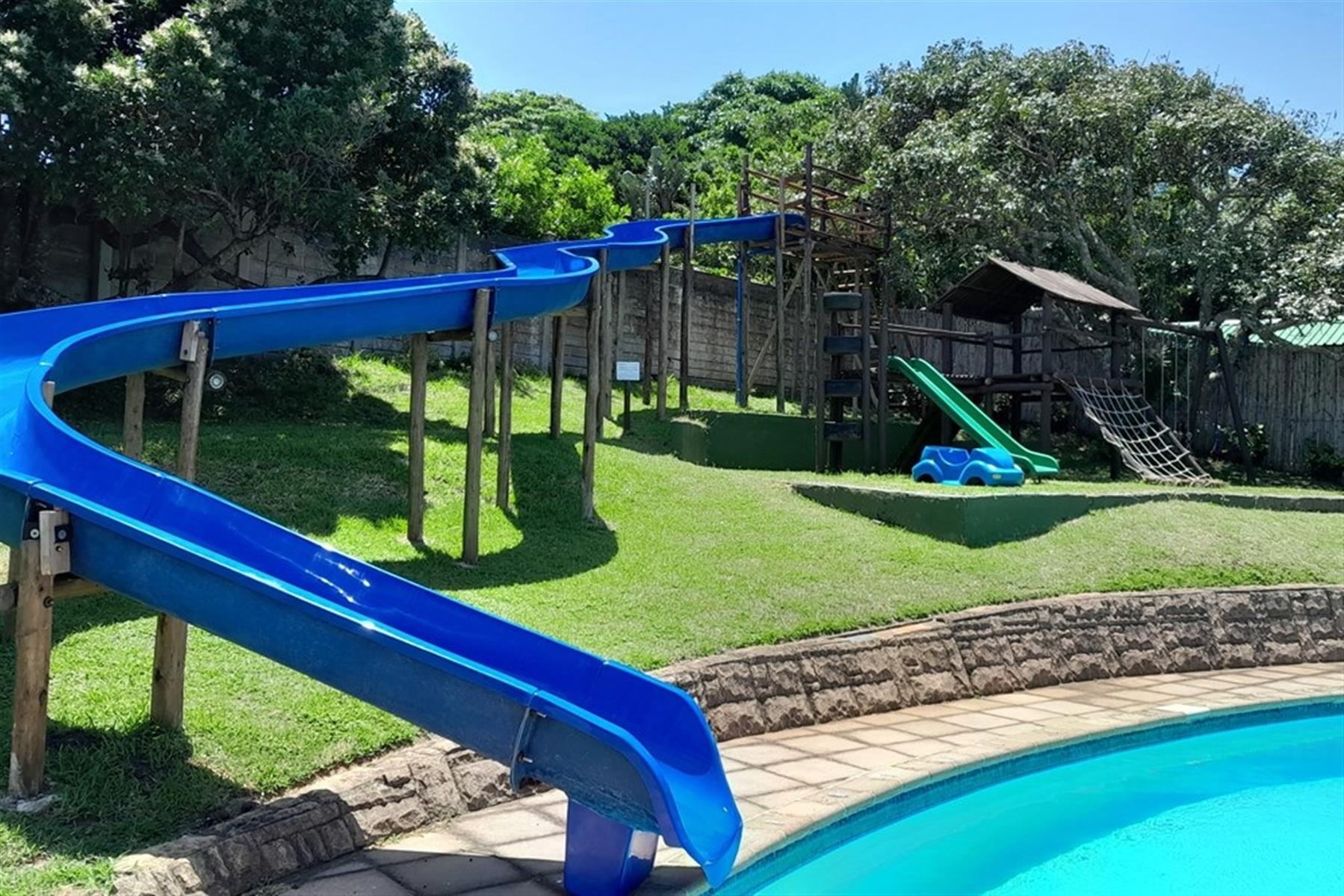 Private garden with a swimming pool and jungle gym for family fun.