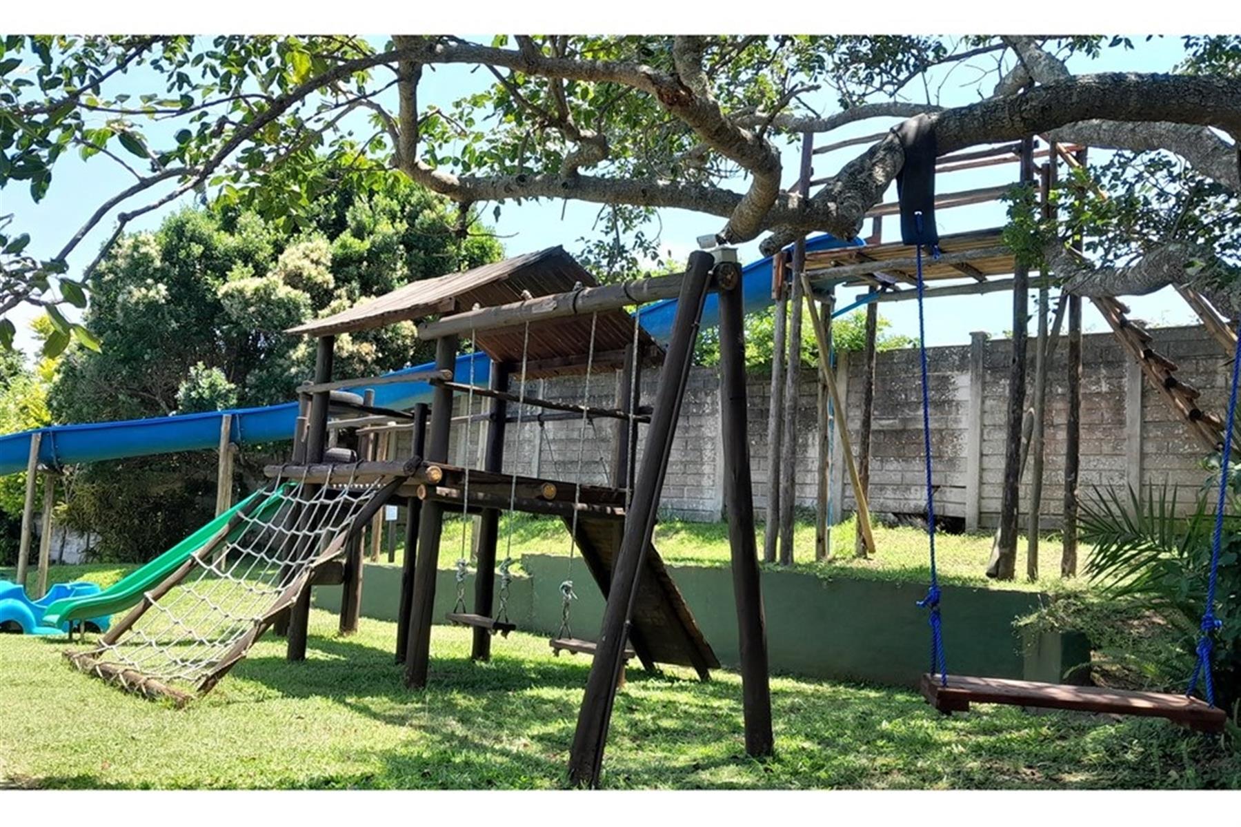 A private garden with a swimming pool and jungle gym play area, creating a safe and fun environment for children.