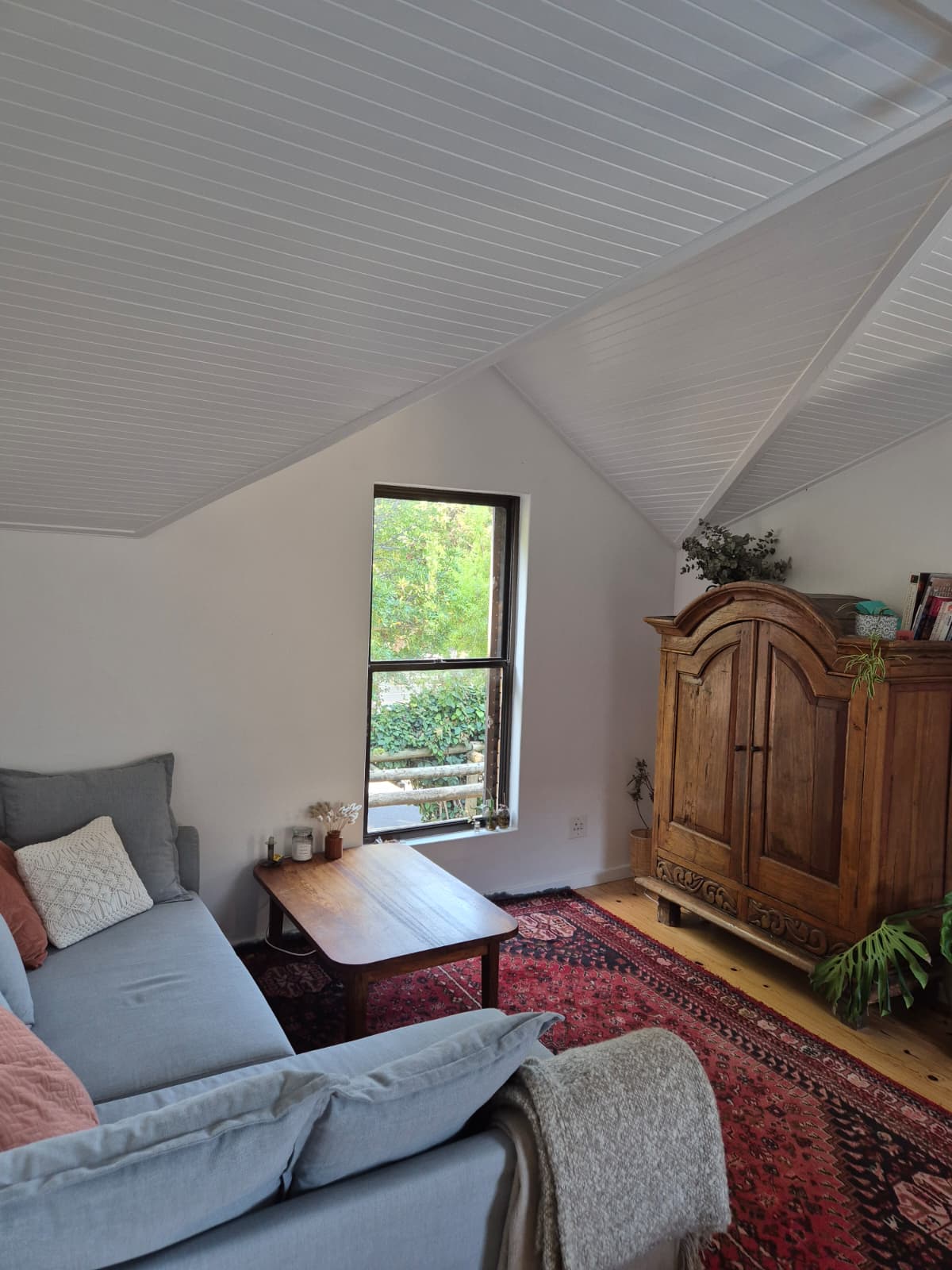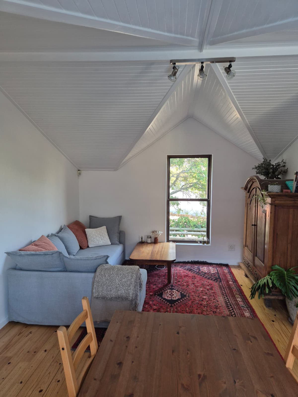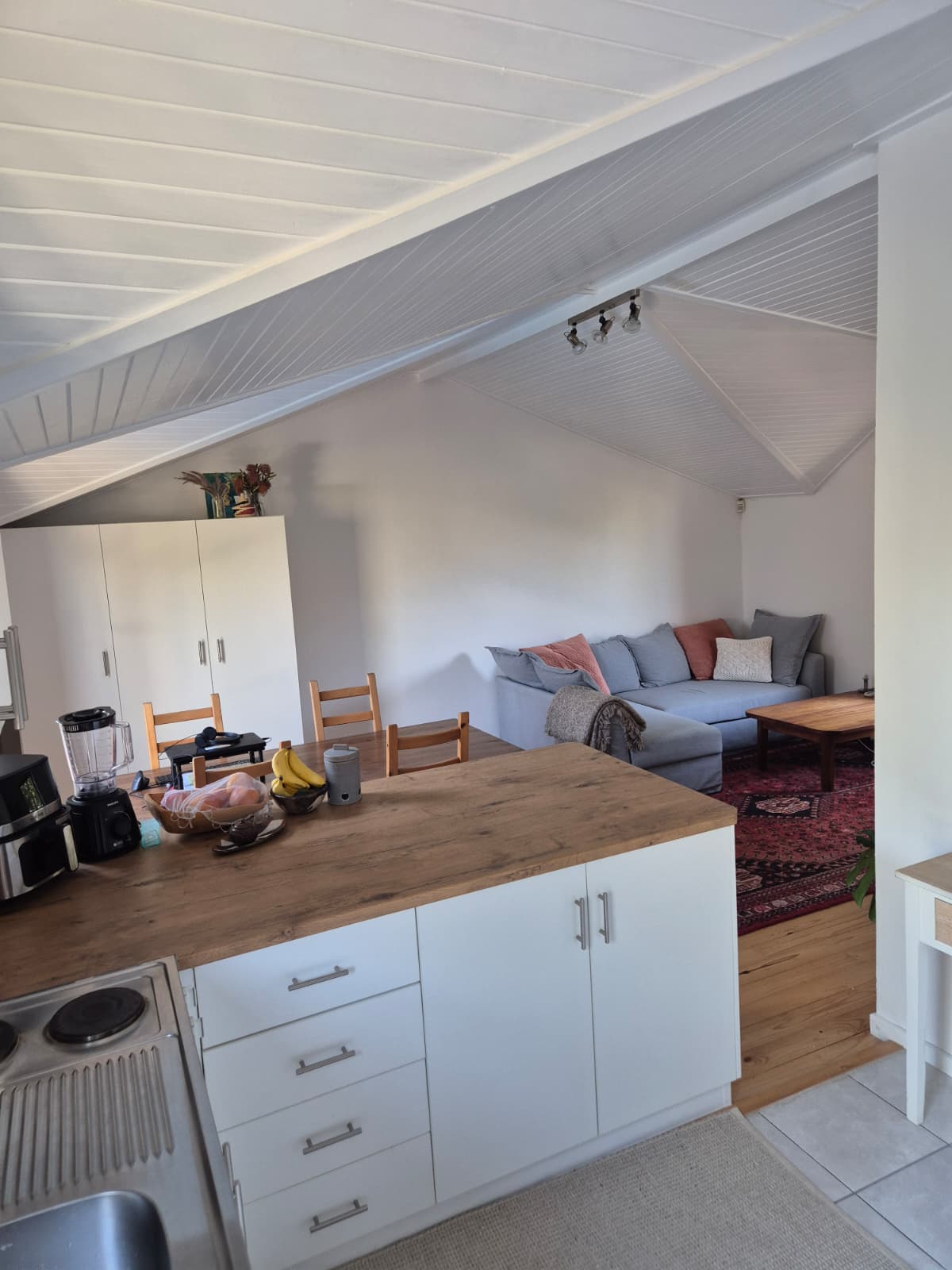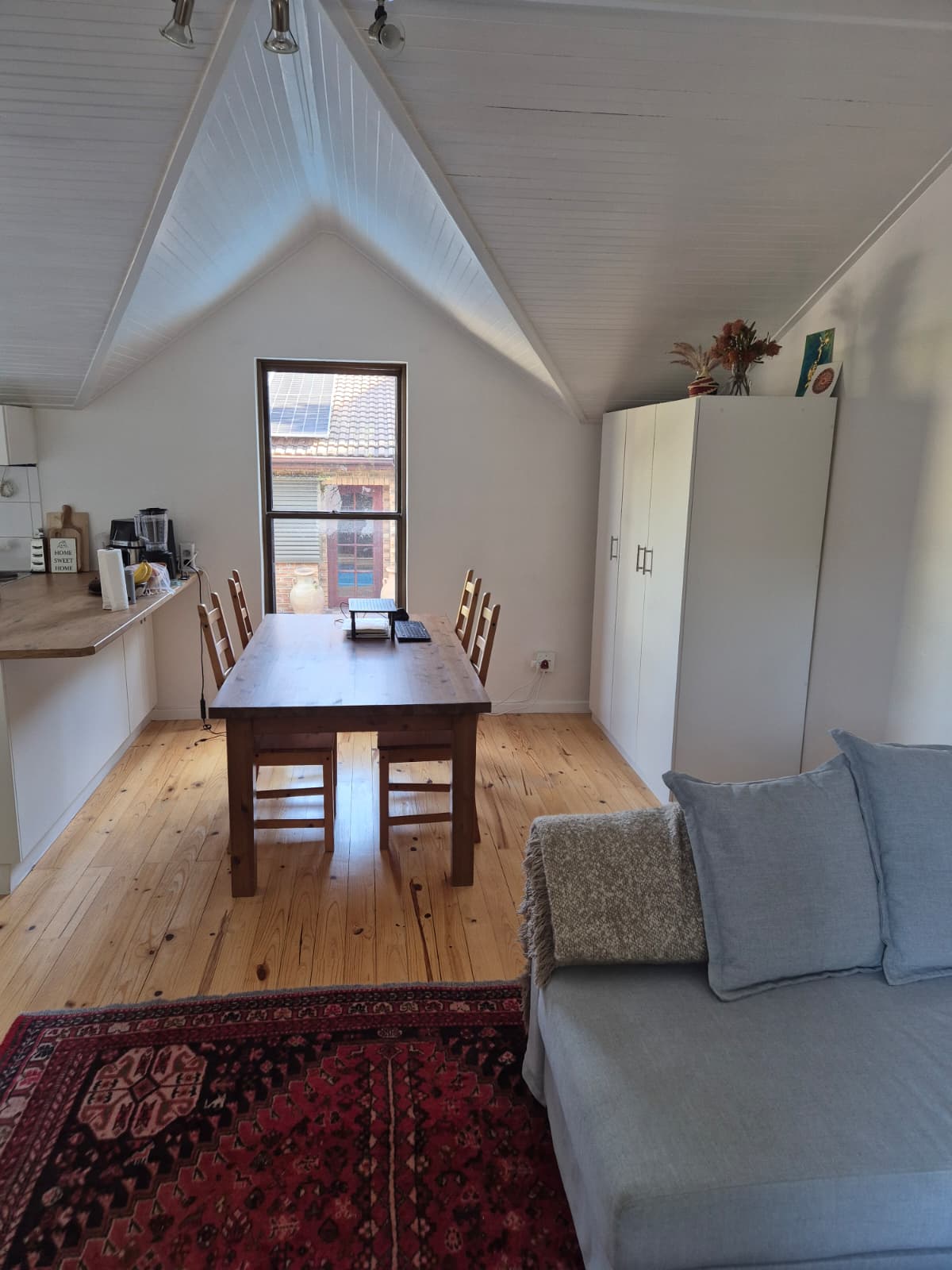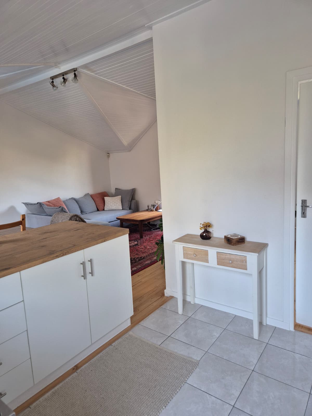 Upon entering, you are welcomed into a bright, open-plan living area that maximizes space and natural light. Large windows flood the room with sunshine, creating a warm and inviting atmosphere, while vaulted ceilings enhance the sense of openness and airiness. Ample cupboard space ensures easy, clutter-free living.