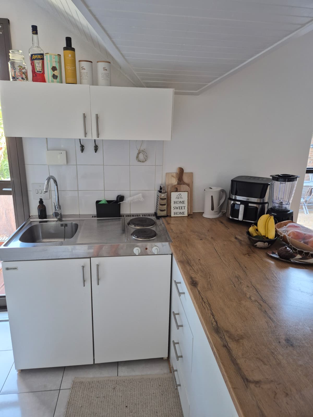 The fitted kitchen is compact yet functional, featuring a two-plate hob, under-counter fridge, and microwave—ideal for simple, everyday meal preparation.