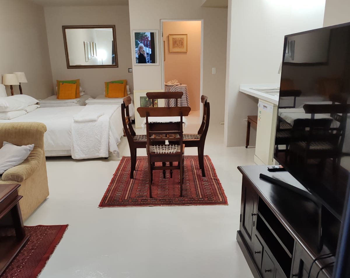 The unit is all open plan with a living room/ dining room/ kitchen and bedroom. The bathroom is separate with a large walk-in shower. There is space for max 4 people.