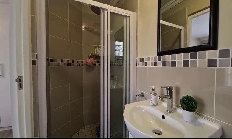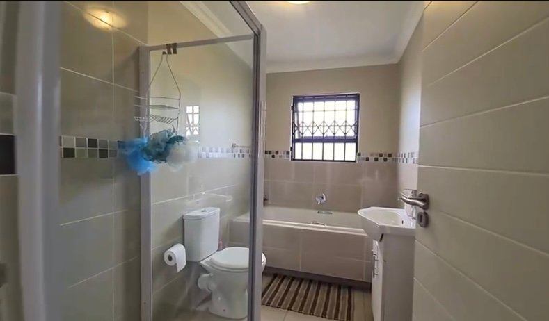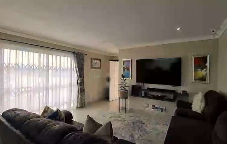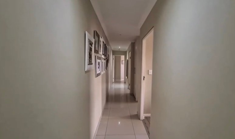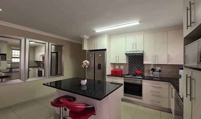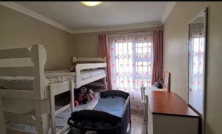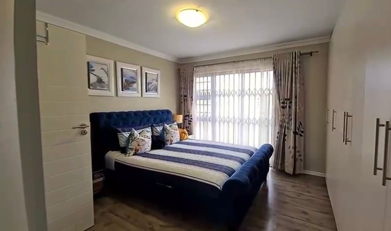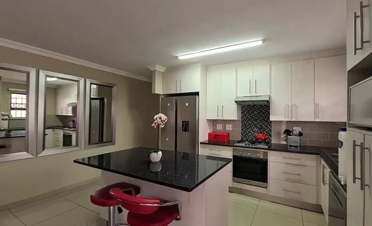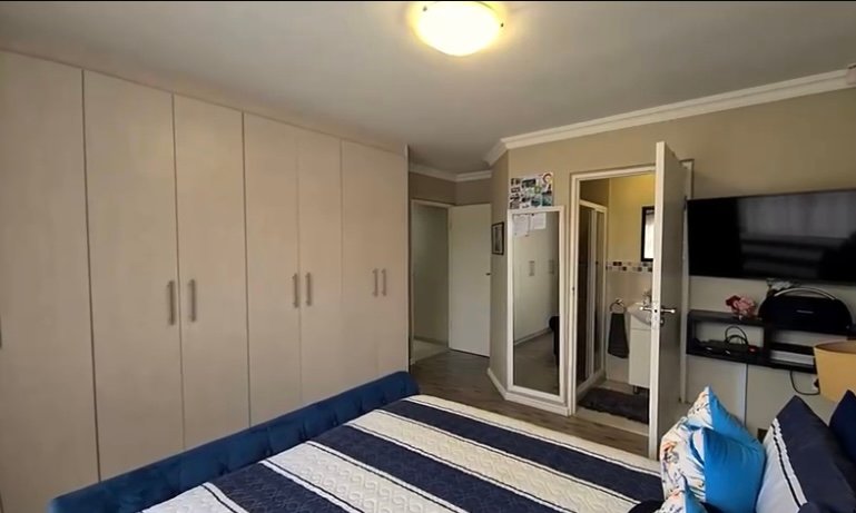 The main bedroom is spacious and boasts an en-suite bathroom and tiled floors. The two additional bedrooms both have built-in cupboards, tiled floors, and share a modern, well-appointed family bathroom.