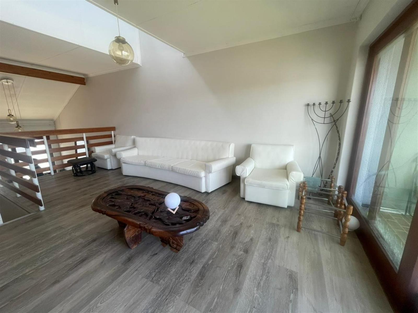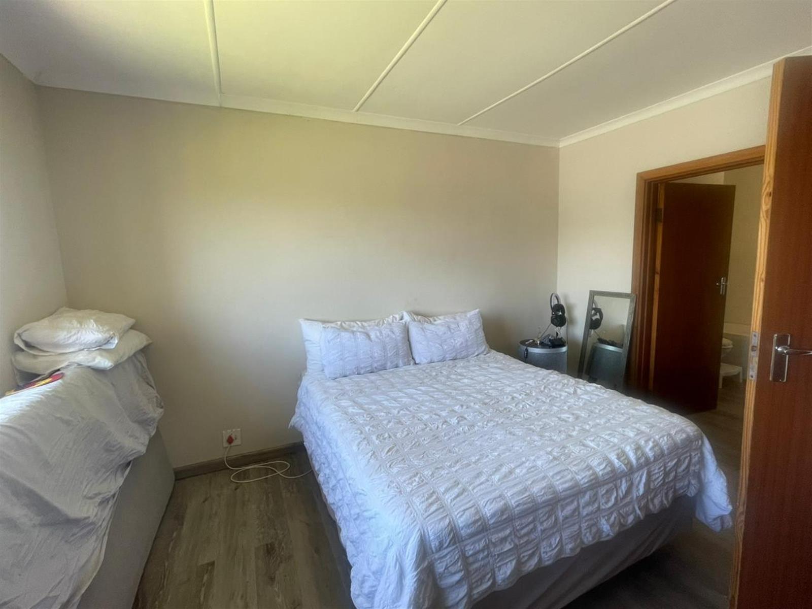 Upstairs, the townhouse offers one spacious bedroom filled with natural light. and a spacious en-suite. The other two bedrooms have built in cupboards and each with a door leading out to the garden area. The additional full bathroom serves the remaining bedrooms, ensuring comfort and privacy for the whole family. A convenient guest cloakroom (half bathroom) is located downstairs.