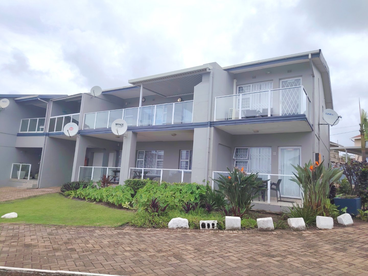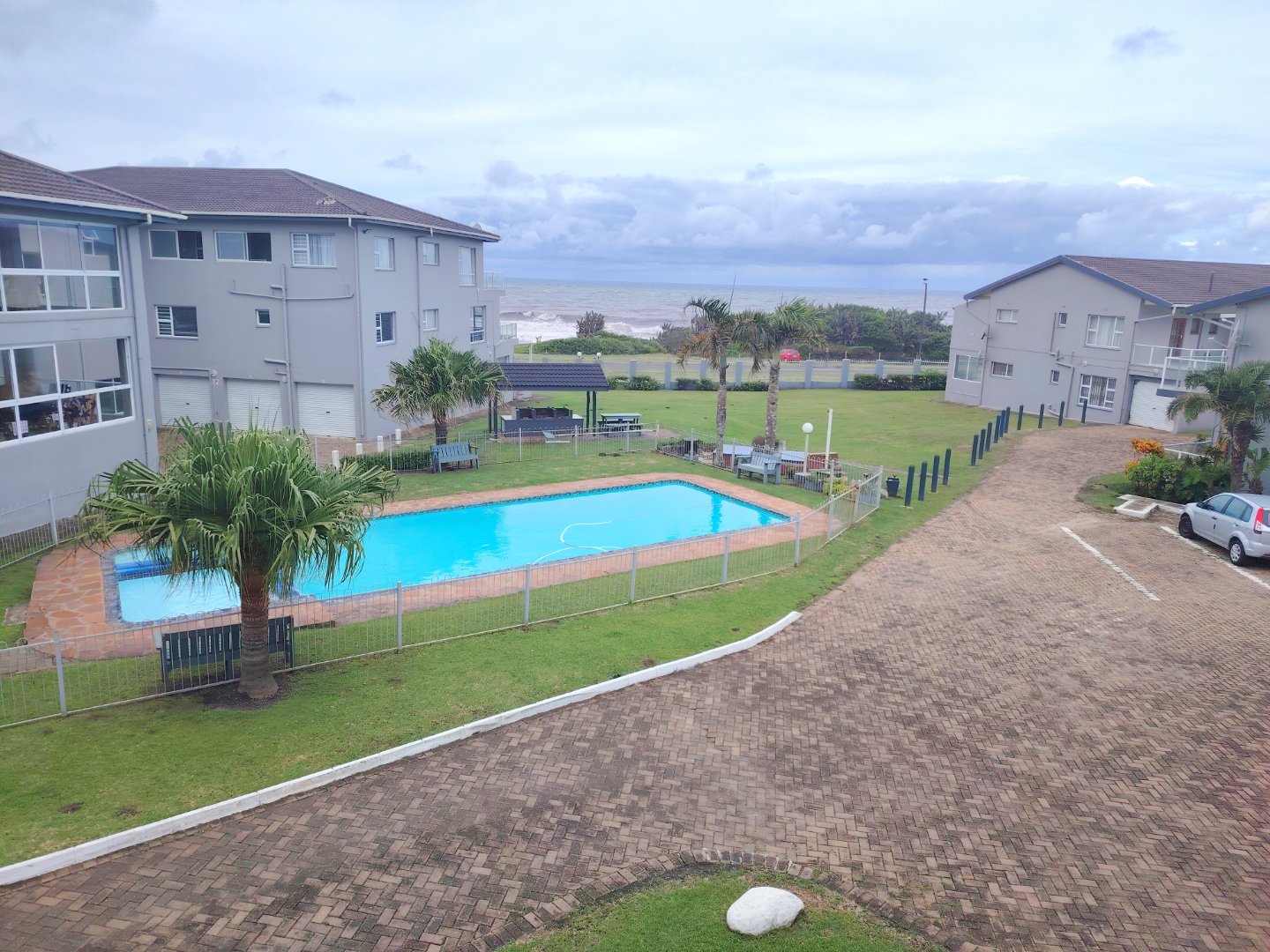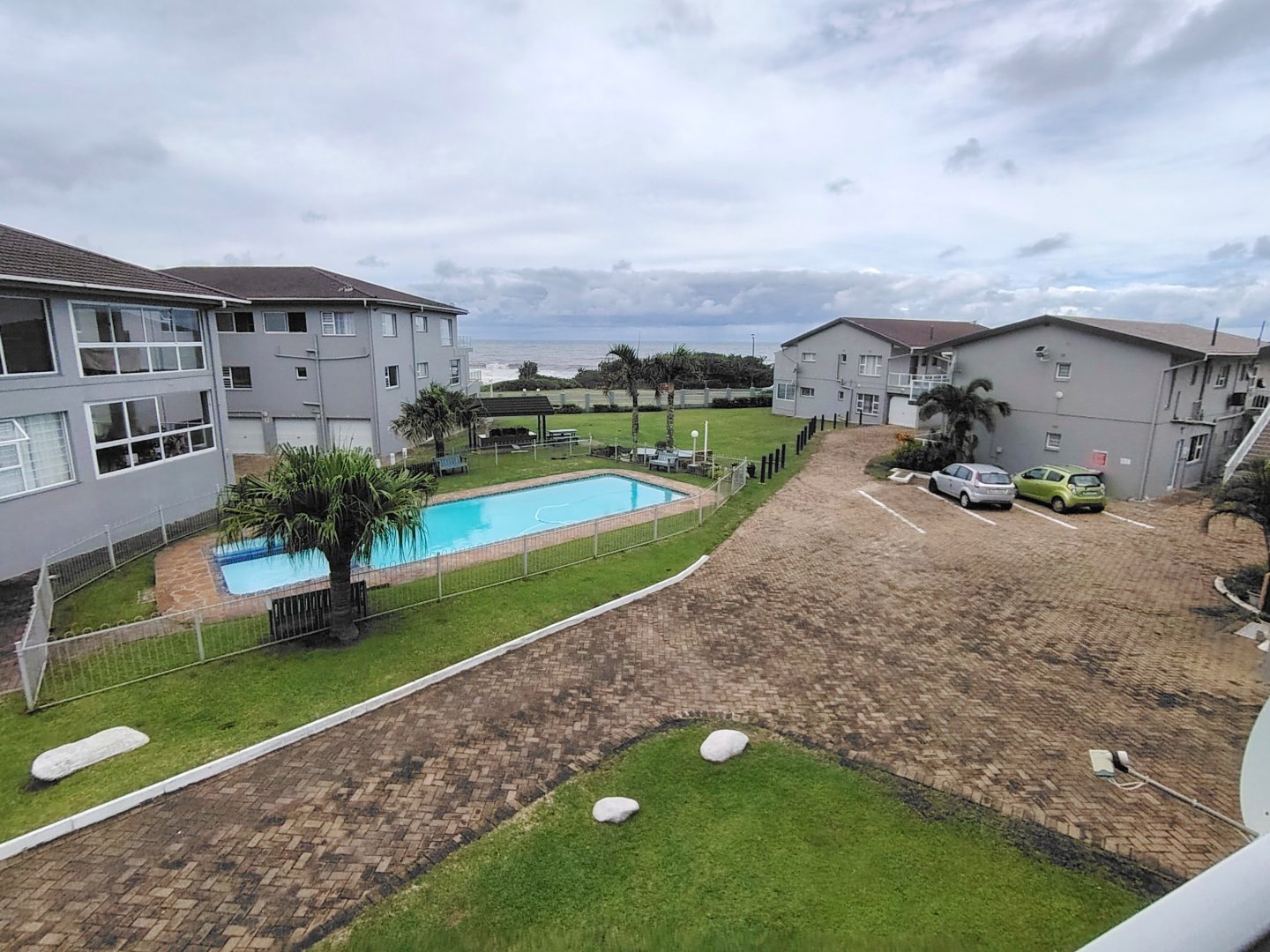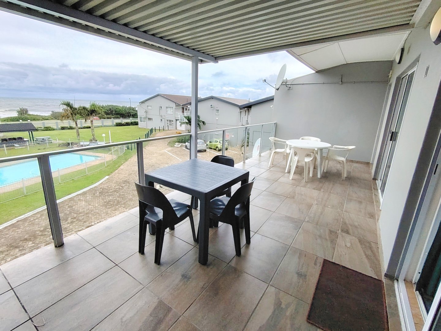 READJUSTED to SELL. Take a walk through the property. Walking sixteen steps to the first floor, when entering the unit the kitchen offers an electrical oven/stove and ample cupboard space. The breakfast nook is overlooking the lounge / dining room area and that flows out onto the balcony with sea view. The main bedroom has built in cupboards, tiled flooring and a double bed - the sliding door opens up onto the shared balcony with a built in braai and sea views. The second bedroom overs the parking area. The unit is spacious and ideal for lock-up-and-go or to live there permanently. The unit is finished. The communal pool will keep the children busy and a bonus is, that the unit is pet friendly. Enjoy a braai on the balcony or breakfast at sunrise. The double garage will ensure that you can park your vehicle and walk where you want to be. The very popular Lilliecrona Boulevard is right in front of the property - connecting Uvongo to Manaba Beach - where you can take your children and dogs for a walk.