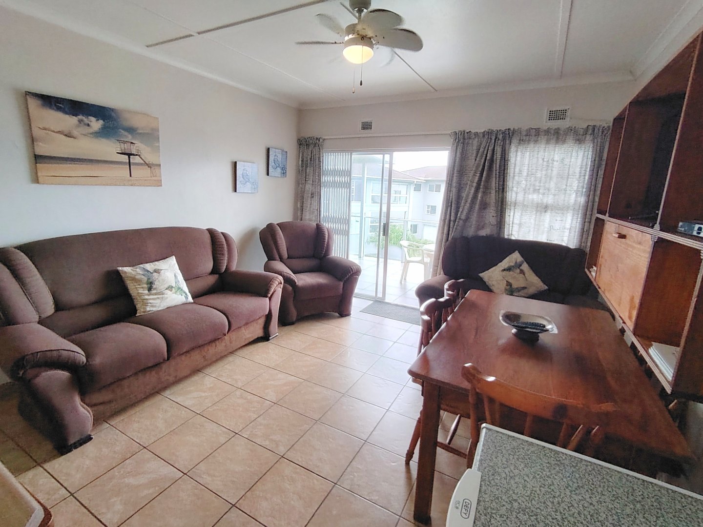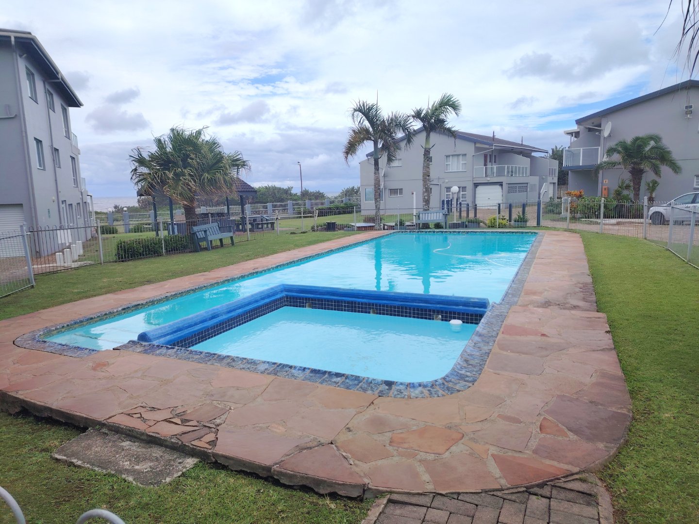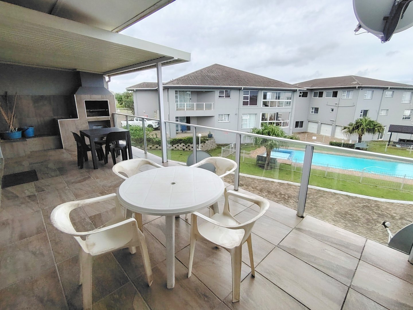 READJUSTED to SELL. Take a walk through the property. Walking sixteen steps to the first floor, when entering the unit the kitchen offers an electrical oven/stove and ample cupboard space. The breakfast nook is overlooking the lounge / dining room area and that flows out onto the balcony with sea view. The main bedroom has built in cupboards, tiled flooring and a double bed - the sliding door opens up onto the shared balcony with a built in braai and sea views. The second bedroom overs the parking area. The unit is spacious and ideal for lock-up-and-go or to live there permanently. The unit is finished. The communal pool will keep the children busy and a bonus is, that the unit is pet friendly. Enjoy a braai on the balcony or breakfast at sunrise. The double garage will ensure that you can park your vehicle and walk where you want to be. The very popular Lilliecrona Boulevard is right in front of the property - connecting Uvongo to Manaba Beach - where you can take your children and dogs for a walk.