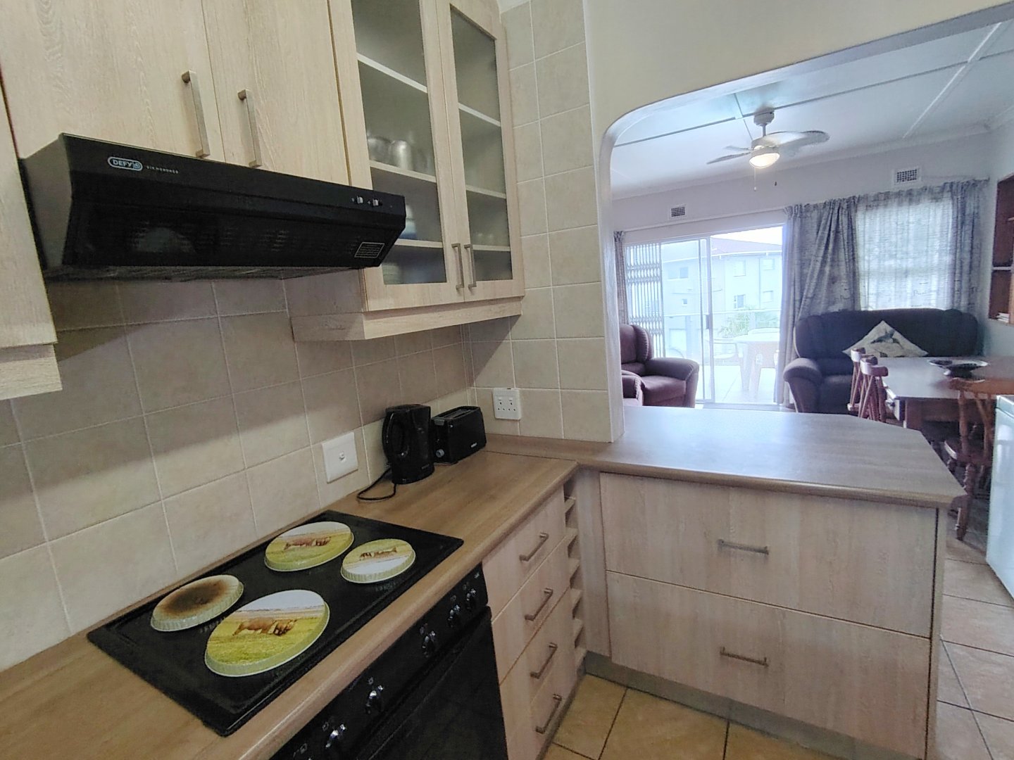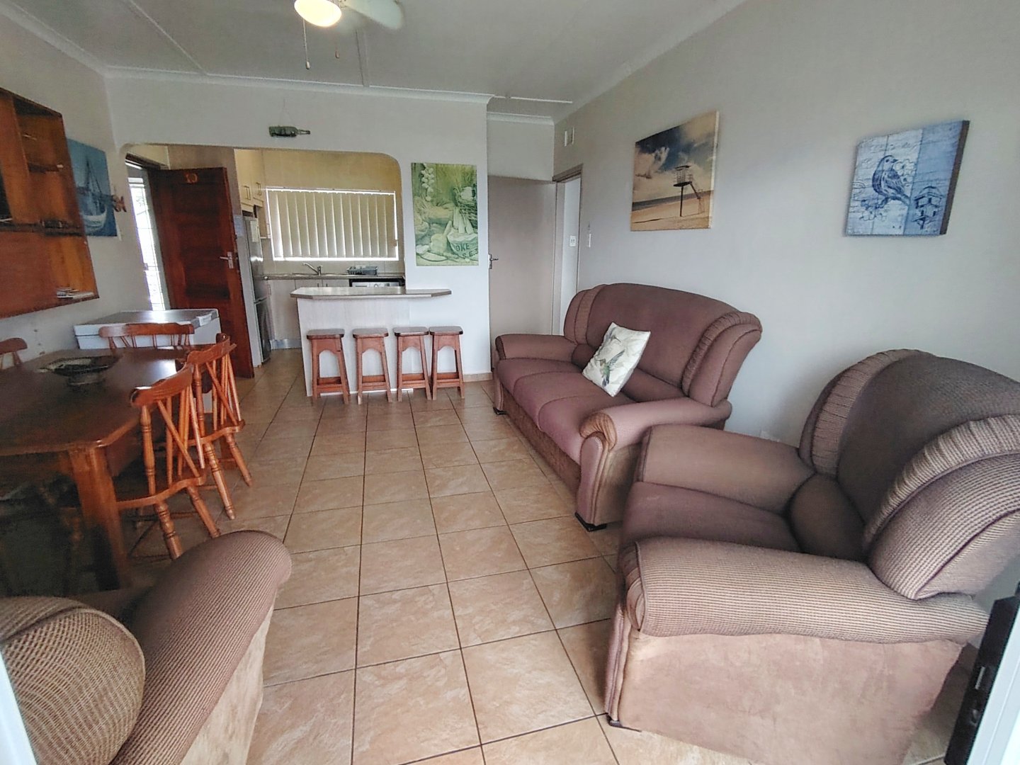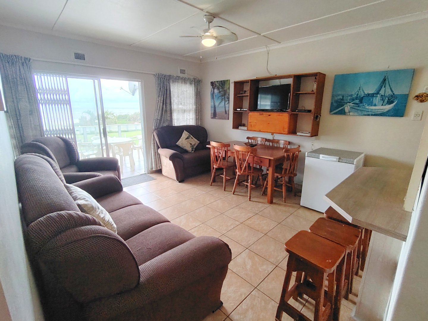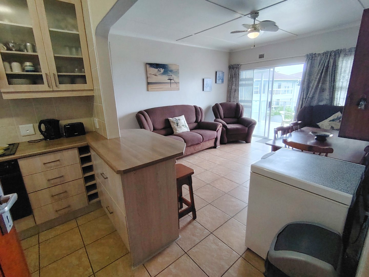 READJUSTED to SELL. Take a walk through the property. Walking sixteen steps to the first floor, when entering the unit the kitchen offers an electrical oven/stove and ample cupboard space. The breakfast nook is overlooking the lounge / dining room area and that flows out onto the balcony with sea view. The main bedroom has built in cupboards, tiled flooring and a double bed - the sliding door opens up onto the shared balcony with a built in braai and sea views. The second bedroom overs the parking area. The unit is spacious and ideal for lock-up-and-go or to live there permanently. The unit is finished. The communal pool will keep the children busy and a bonus is, that the unit is pet friendly. Enjoy a braai on the balcony or breakfast at sunrise. The double garage will ensure that you can park your vehicle and walk where you want to be. The very popular Lilliecrona Boulevard is right in front of the property - connecting Uvongo to Manaba Beach - where you can take your children and dogs for a walk.