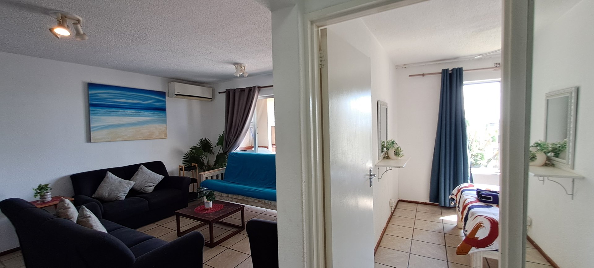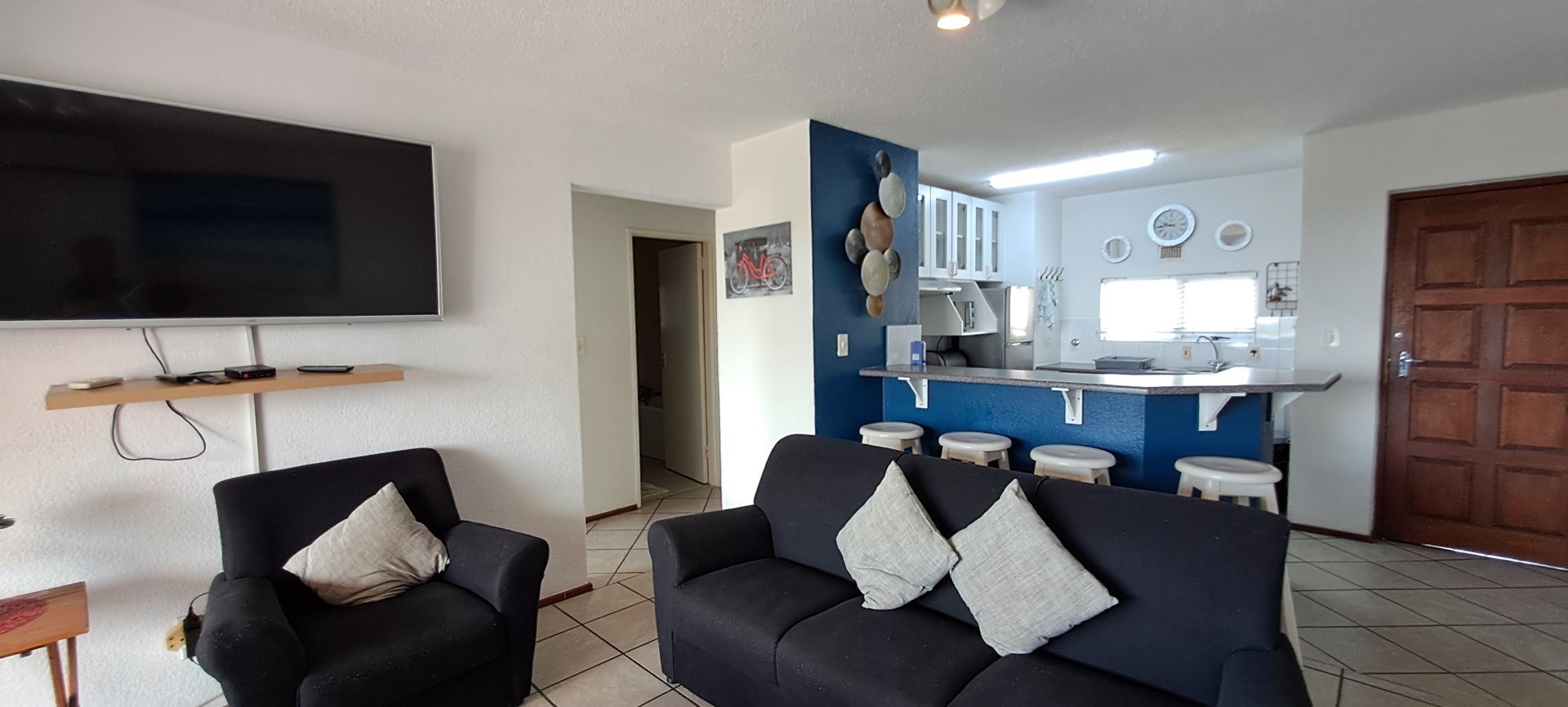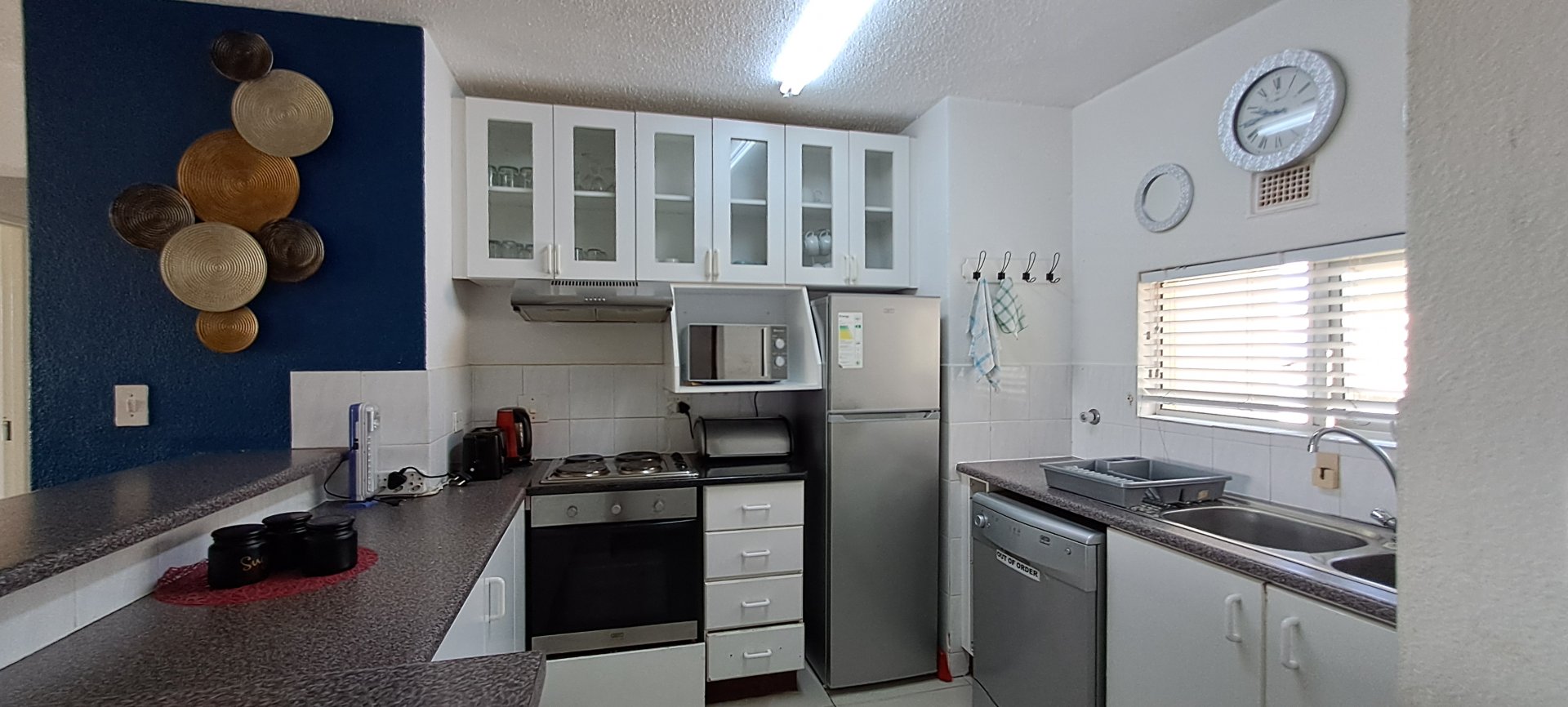 This particular unit stands out for its convenient first floor position, offering slight sea views and close proximity to covered parking. The apartment has an open-plan kitchen and lounge area designed for relaxed coastal living. The kitchen is fully equipped with built-in cupboards and a breakfast nook, flowing seamlessly into the living space and out onto the covered patio with gas braai — the ideal spot to relax after a day at the beach.