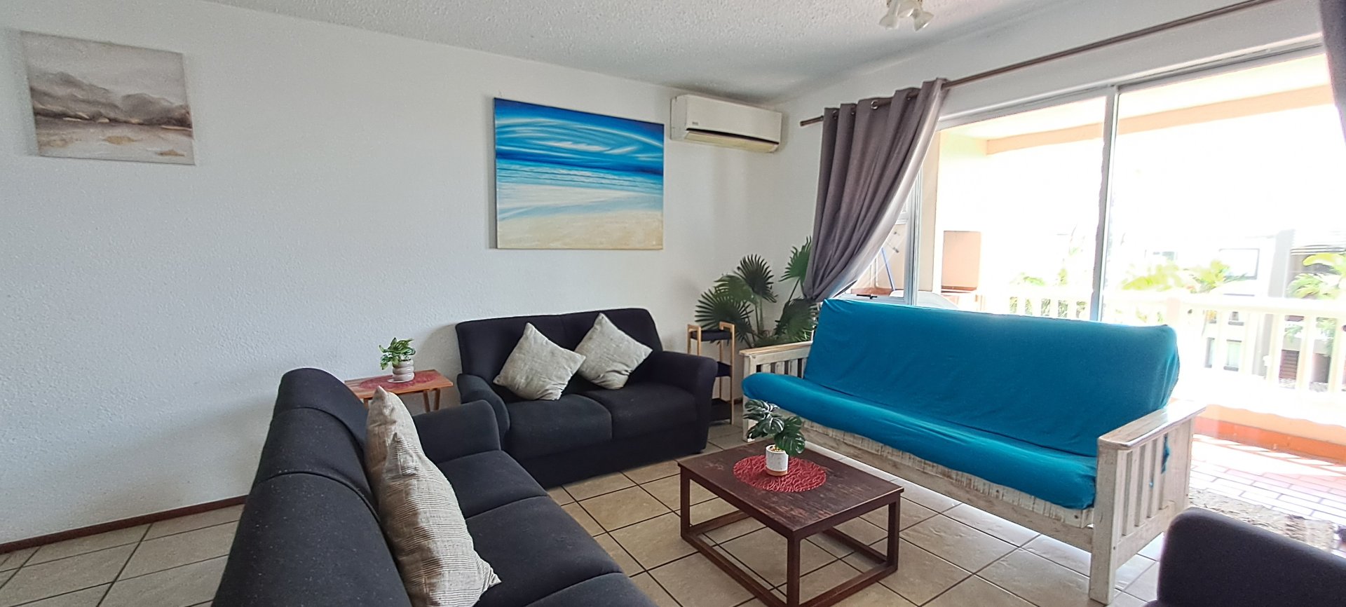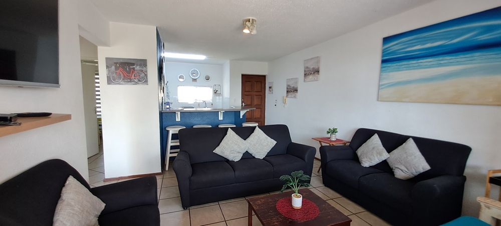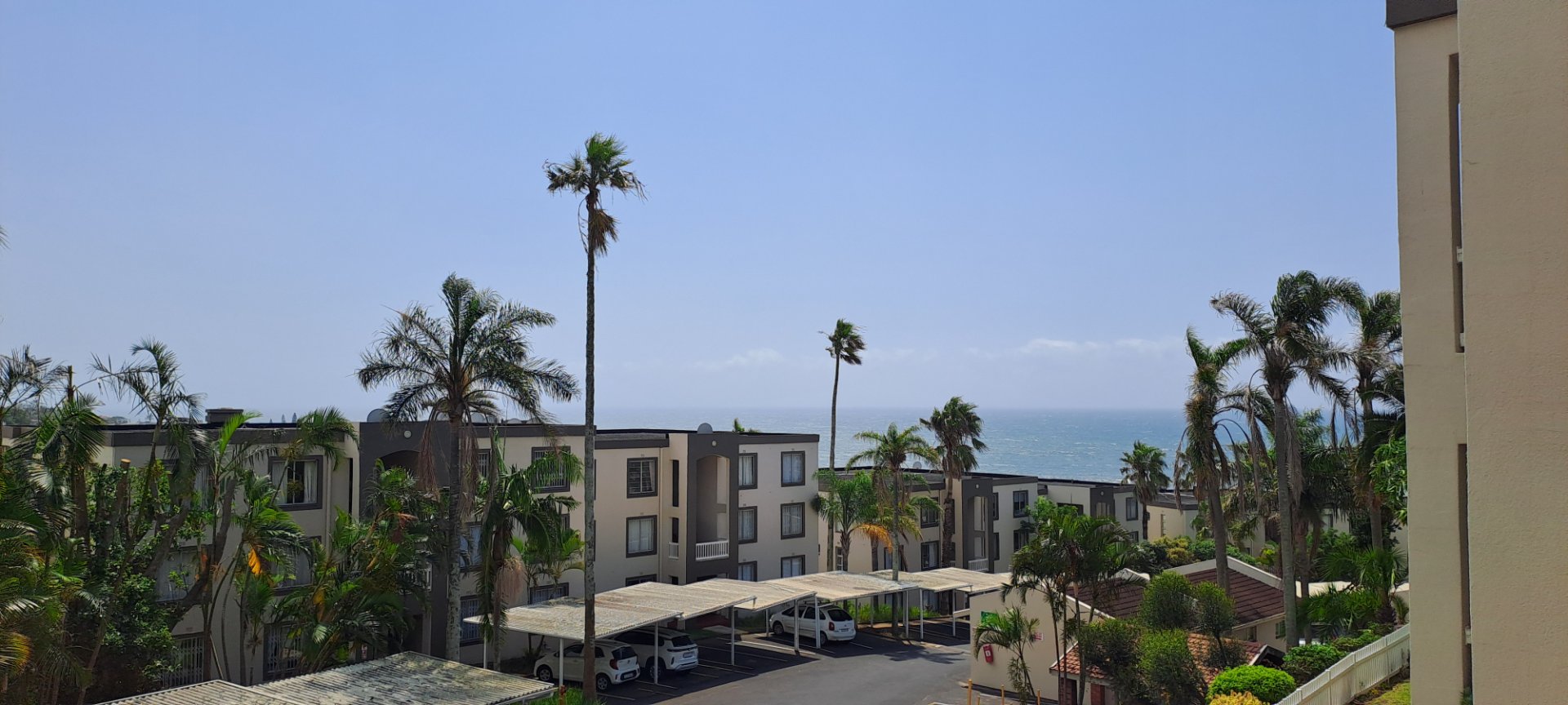 This particular unit stands out for its convenient first floor position, offering slight sea views and close proximity to covered parking. The apartment has an open-plan kitchen and lounge area designed for relaxed coastal living. The kitchen is fully equipped with built-in cupboards and a breakfast nook, flowing seamlessly into the living space and out onto the covered patio with gas braai — the ideal spot to relax after a day at the beach.