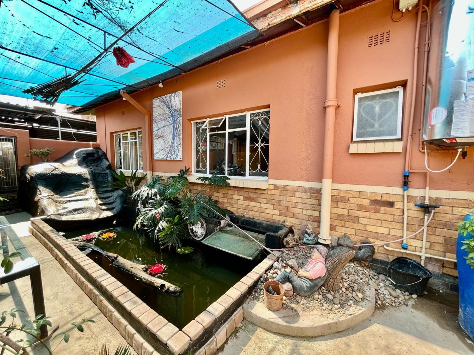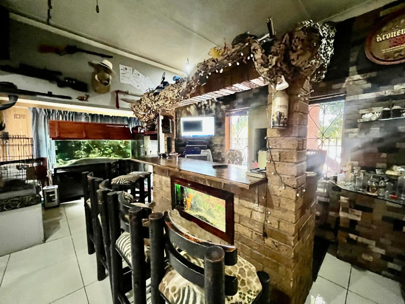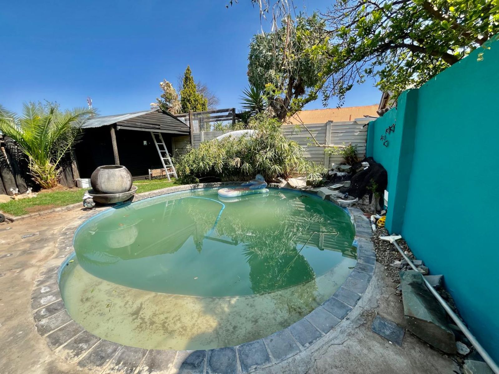 Charming three-bedroom, two-bathroom family home situated in an established and sought-after area. The welcoming lounge features a cosy fireplace, while the entertainment area offers the perfect space for gatherings. The well-appointed kitchen includes ample built-in cupboards, a breakfast nook, under-counter oven with hob, extractor fan, and a convenient scullery. Additional features include a single garage, a carport accommodating up to four vehicles, staff accommodation, and a wendy house. The garden boasts a JoJo tank, a built-in fish tank, and a sparkling swimming pool—ideal for warm summer days. The property is fully fenced and fitted with burglar bars for added security.