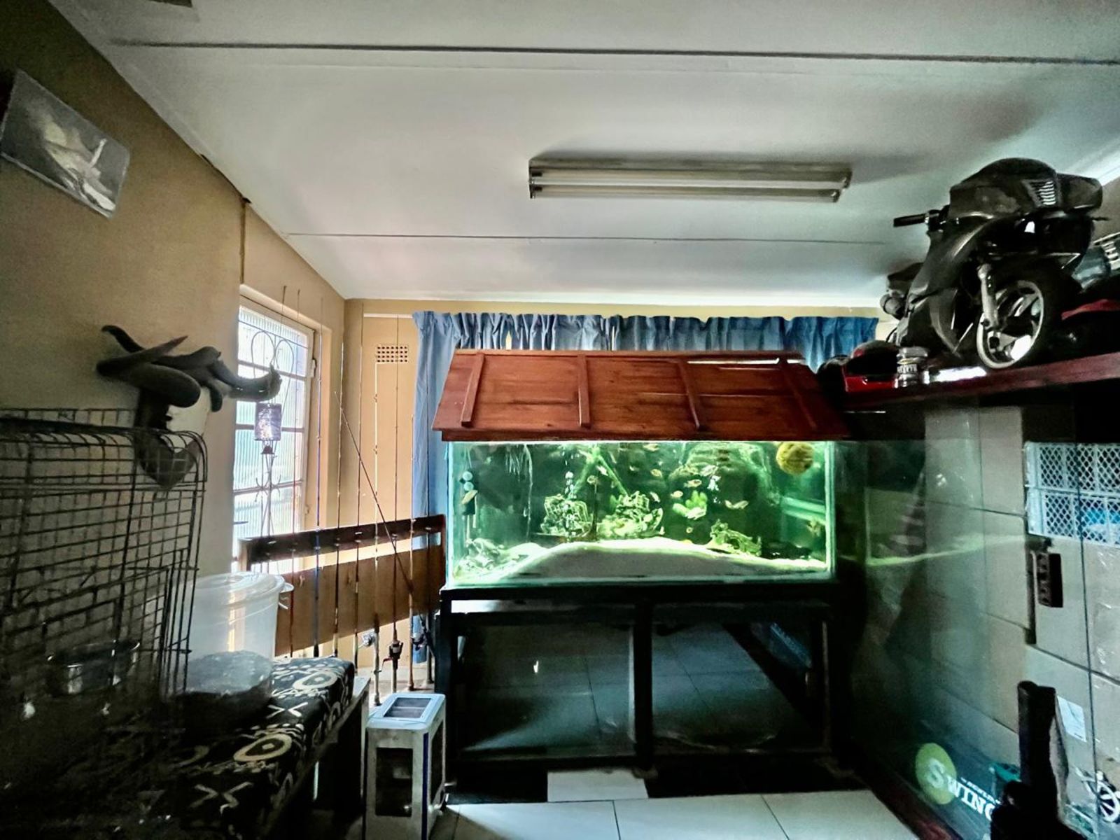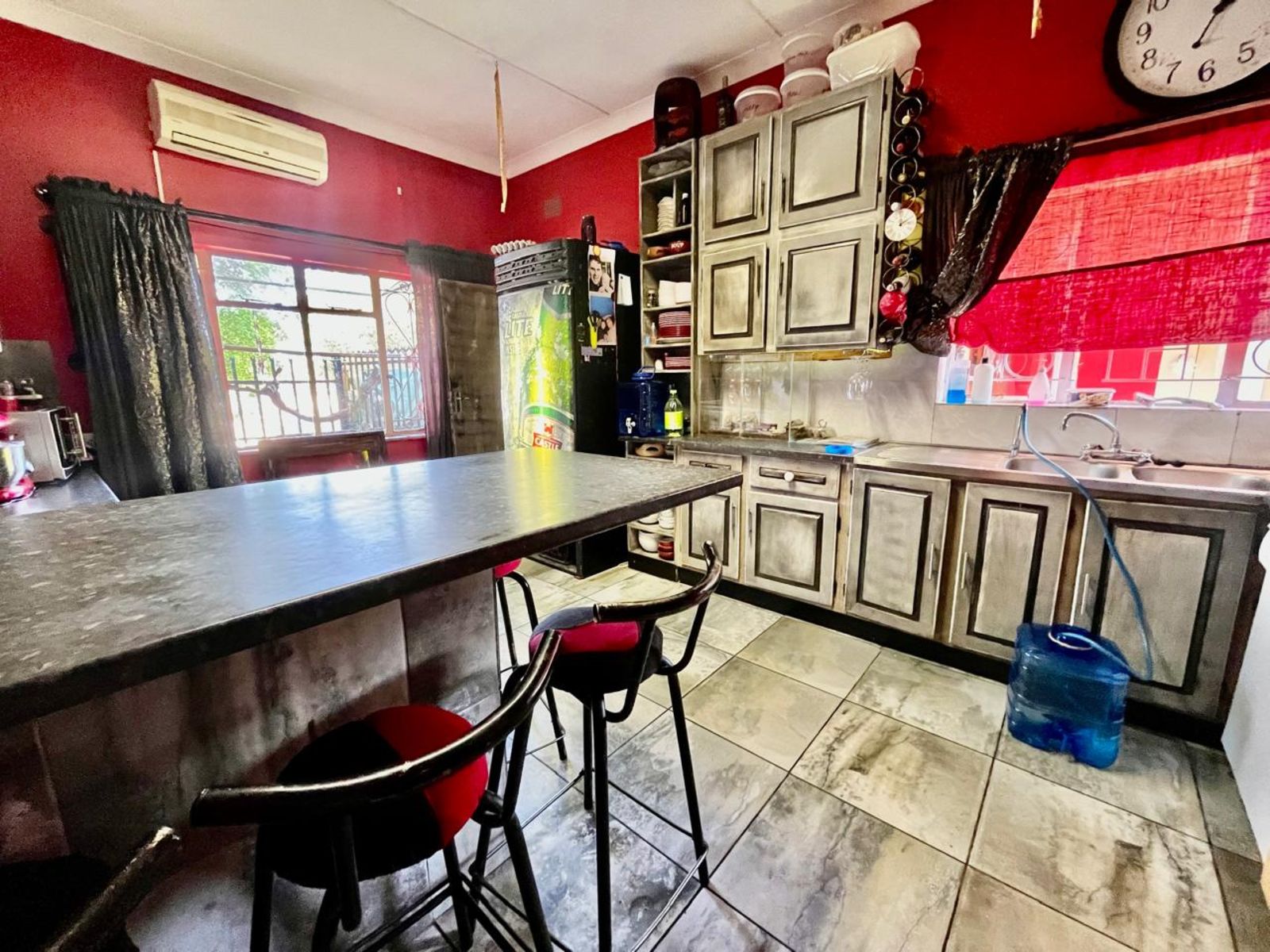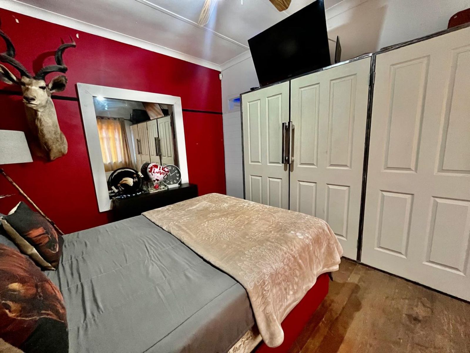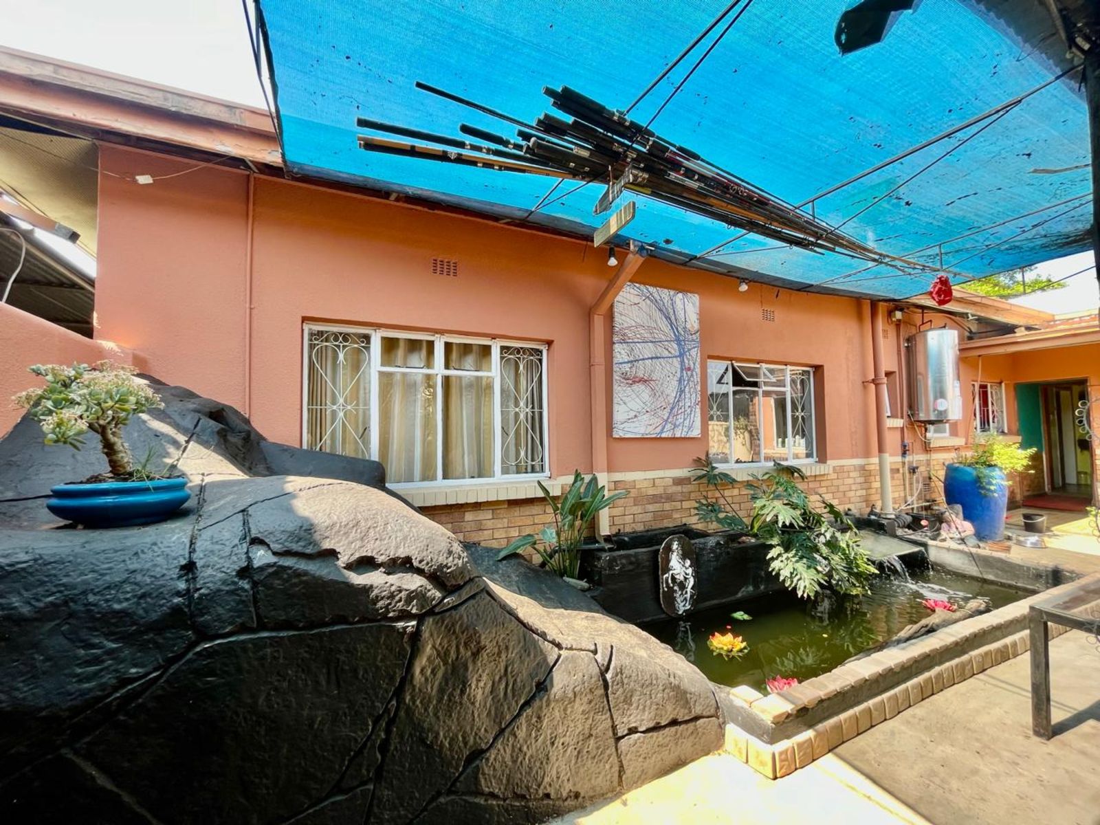 Charming three-bedroom, two-bathroom family home situated in an established and sought-after area. The welcoming lounge features a cosy fireplace, while the entertainment area offers the perfect space for gatherings. The well-appointed kitchen includes ample built-in cupboards, a breakfast nook, under-counter oven with hob, extractor fan, and a convenient scullery. Additional features include a single garage, a carport accommodating up to four vehicles, staff accommodation, and a wendy house. The garden boasts a JoJo tank, a built-in fish tank, and a sparkling swimming pool—ideal for warm summer days. The property is fully fenced and fitted with burglar bars for added security.