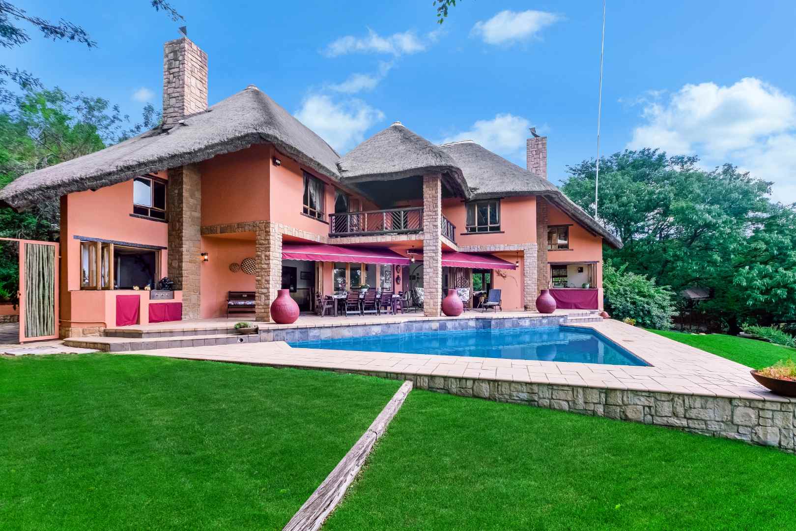 A gorgeous double-volume private formal lounge with a showcase wood burning fireplace is a lovely area which spills onto a double-level wooden deck with a 6 seater jacuzzi. A study is tucked away and is a peaceful space to work quietly with no interruptions. This home encompasses family, friends and creating memories and the open plan family lounge with another wood burning fireplace, dining and fitted pub area is an inviting space to do exactly that - it all opens onto an expansive smart stone patio with a gas braai and cantilever awnings, overlooking the sparkling swimming pool and private terraced garden. The country-style kitchen with granite countertops is the heart of the home, with a centred island/breakfast bar, wood burning fireplace, 5 plate SMEG gas hob with a large ILVE electric oven plus extractor fan, Siemens eye-level oven, serving hatch to patio, double door fridge space, prep bowl, plenty of cupboard space, a separate scullery and laundry that will accommodate all your appliances plus a walk-in pantry. All the living areas downstairs include wooden folding doors that open out onto the patio, pool and boma – creating an indoor/outdoor living experience. The downstairs floor plan is complete with a guest cloakroom off the main entrance and a large guest wing with a bedroom, bathroom, lounge and kitchen - this flatlet enjoys its own entrance and direct access into the home plus covered carport.