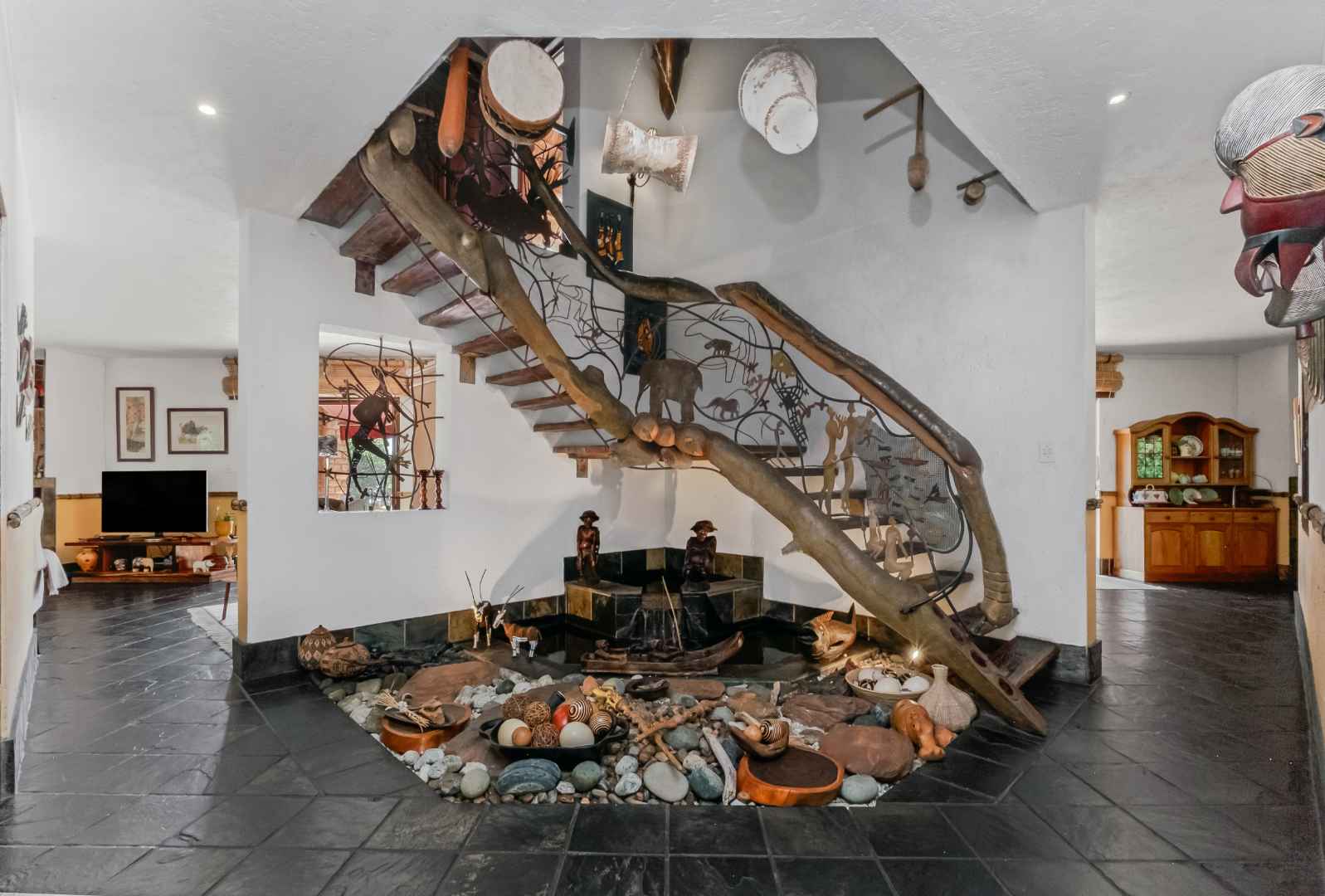 A striking entrance unfolds around a tranquil feature koi pond, where gentle rippling water and graceful fish create an immense sense of calm. Through the bespoke railway sleeper front door you’re welcomed by a striking staircase narrating a bushman dream tale with a handcrafted wooden railing and soothing water feature below adding character and warmth. This home offers high ceilings soaring above with gorgeous lighting, while expensive light-filled spaces bathe in natural sunlight, creating an atmosphere of openness, elegance and effortless charm.