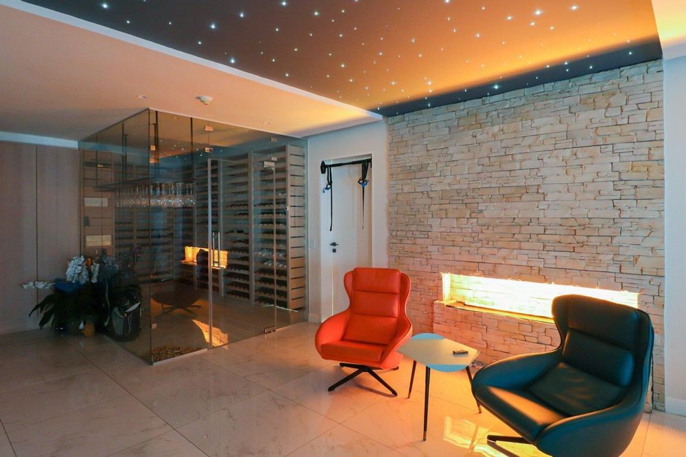 The grand entrance leads to a stunning wine cellar and an open-plan modern living space with a purifying air feature and a starlight ceiling.
