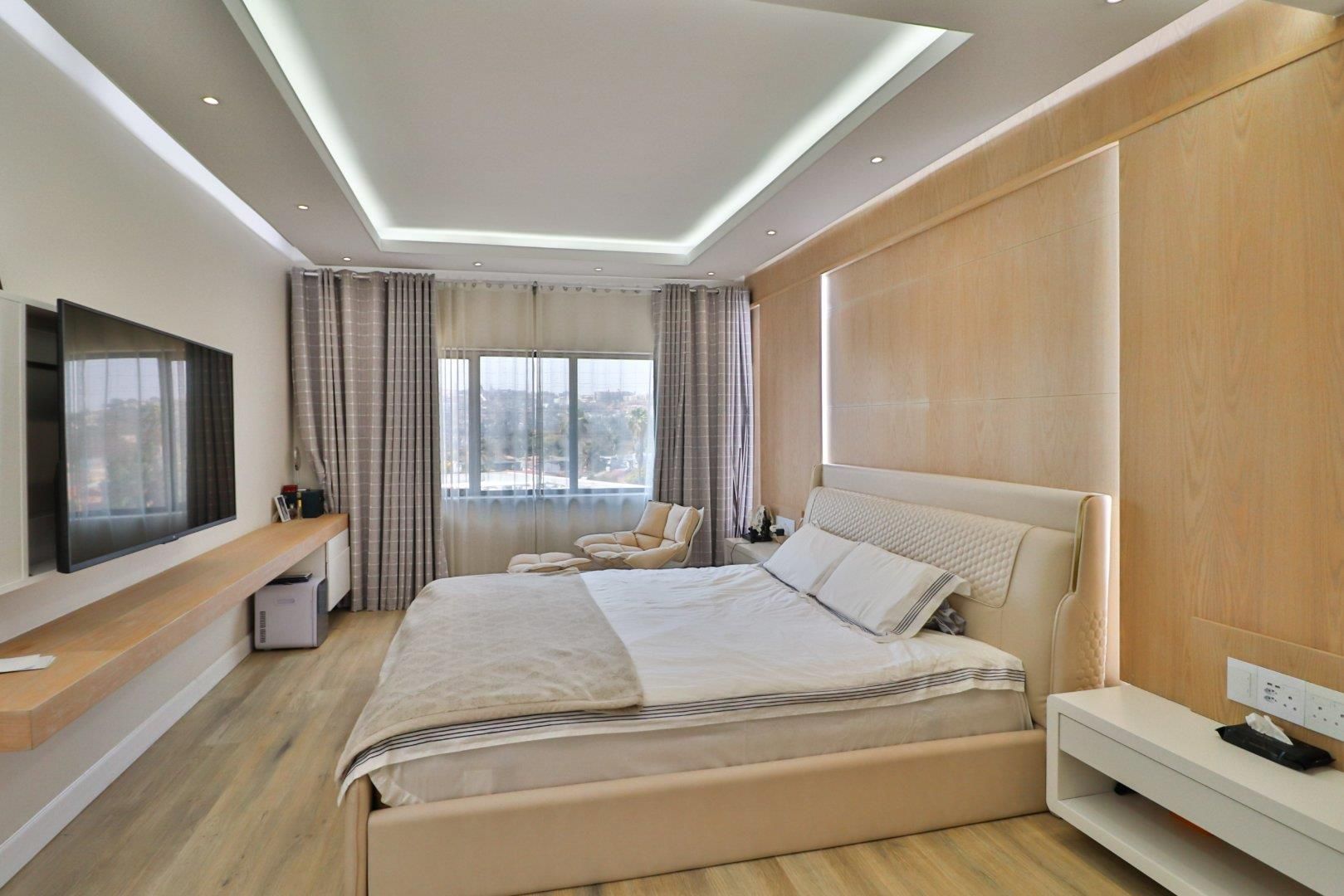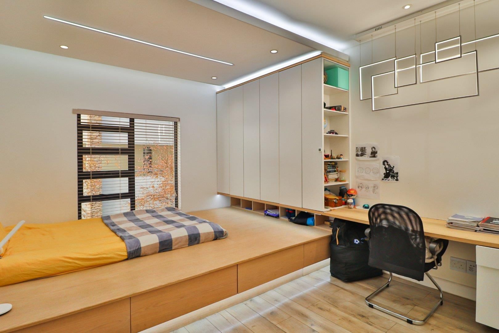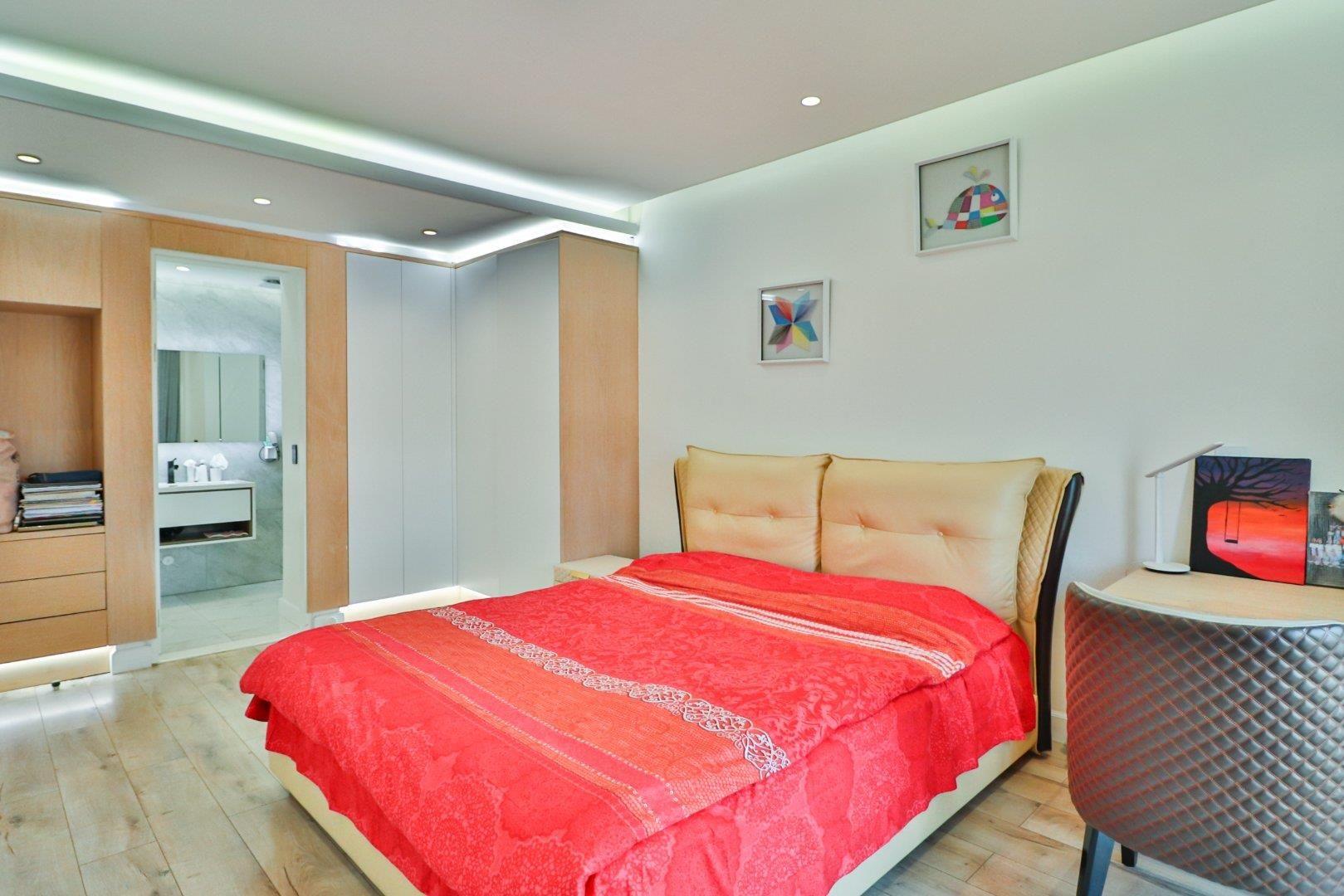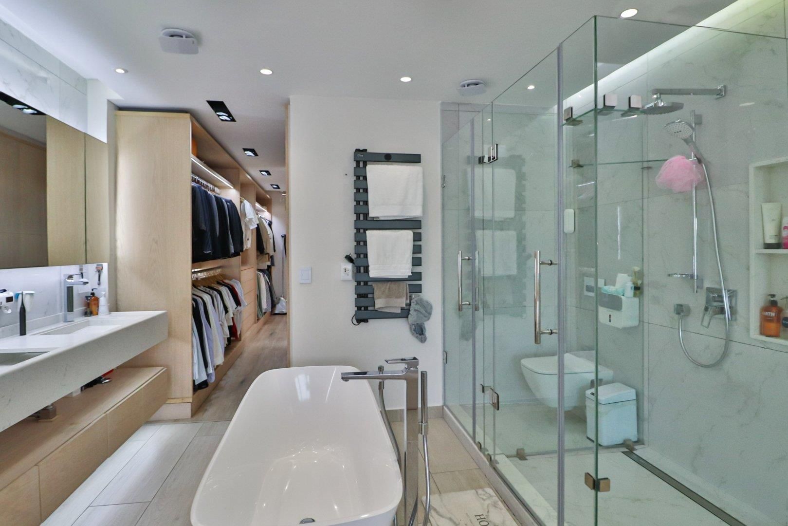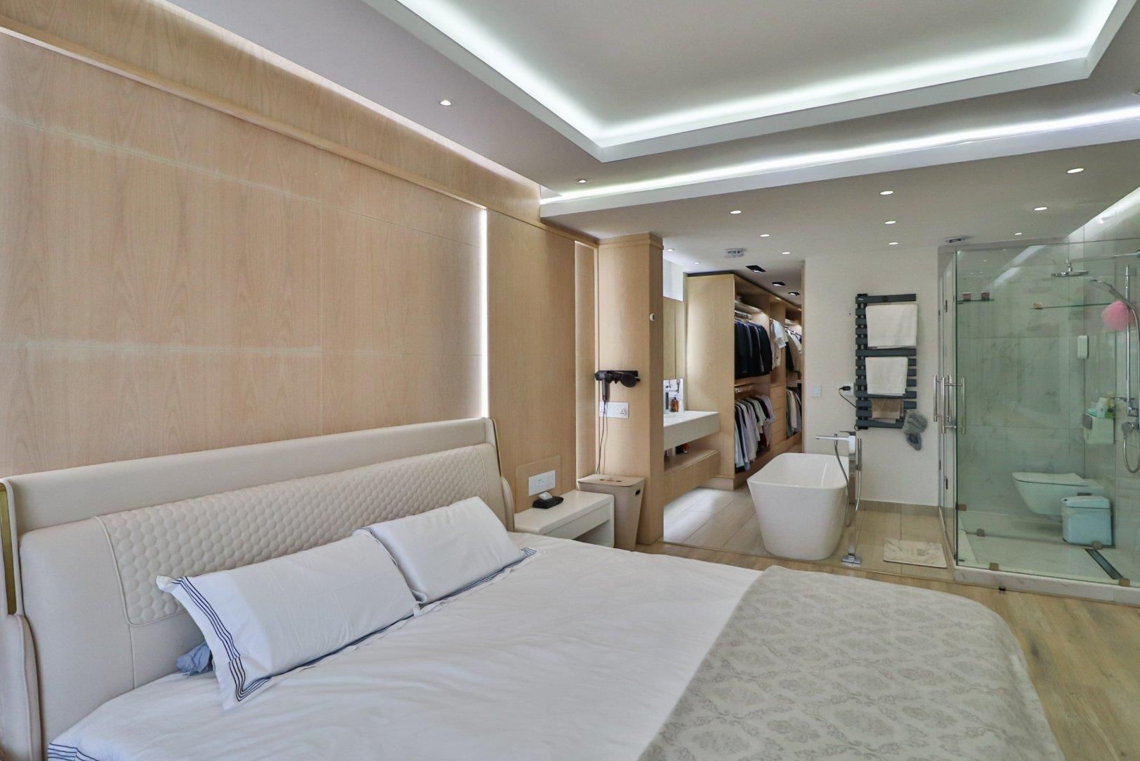 The exquisite master bedroom has an open plan en-suite full bathroom, a walk-in closet, heated towel rails, and an inbuilt clothes rack with a sterilizer. The second and third bedrooms are equally large with wooden flooring, built-in cupboards, and en-suite full bathrooms.