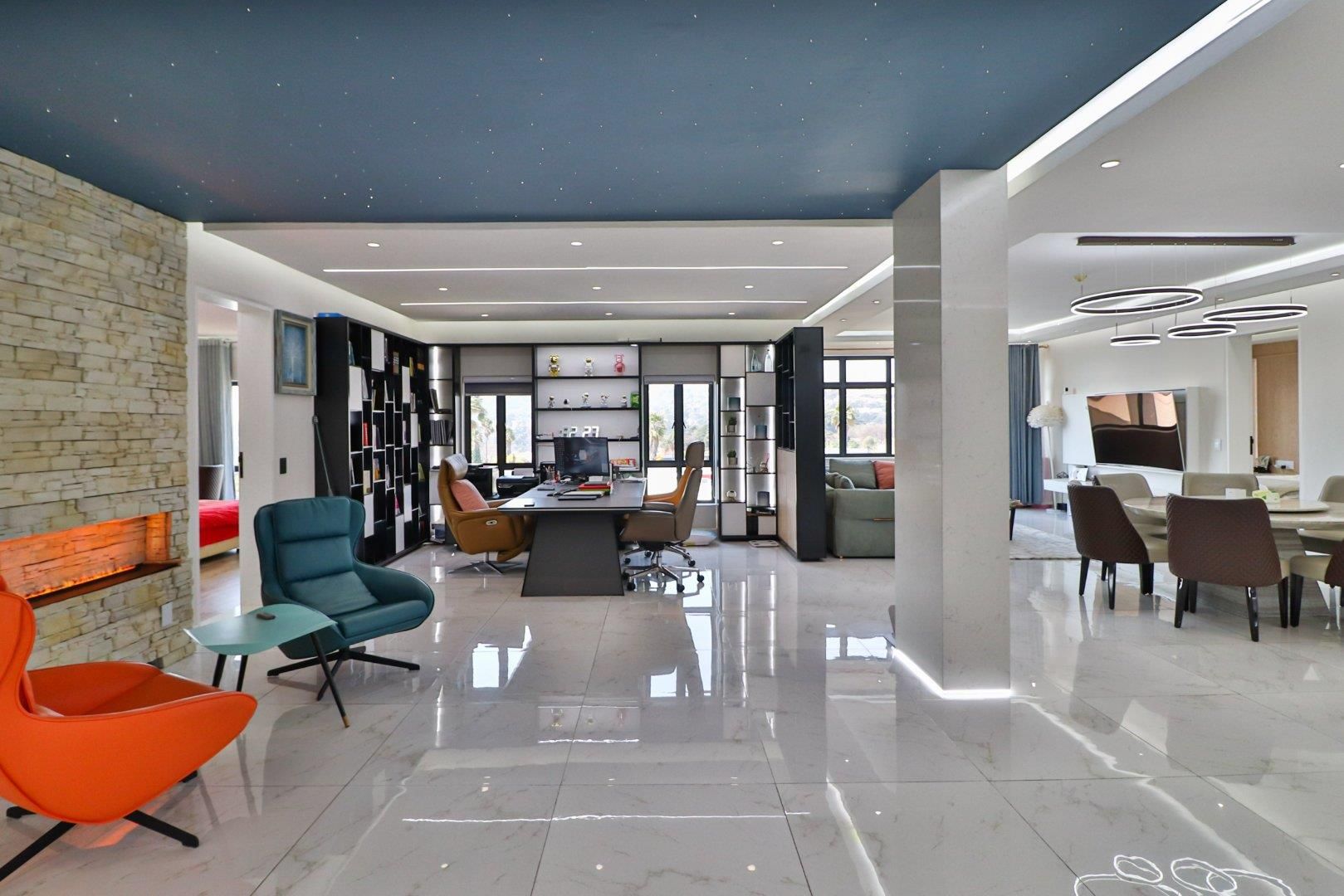 Stylish kitchen with Ceasar stone tops, a breakfast bar, space for a double door fridge/freezer, and lots of cupboard space opens up to an elegant dining room with an 8 seater table with Bentley dining chairs, a beautiful lounge, and a home study or office with stunning built-ins.