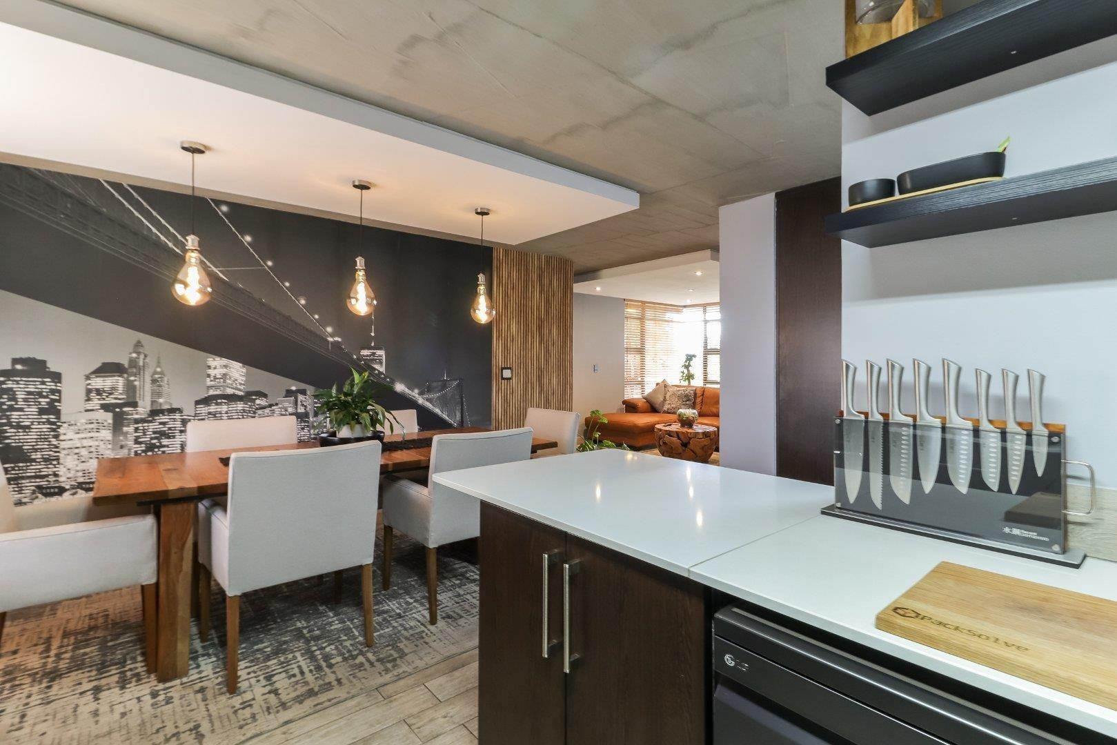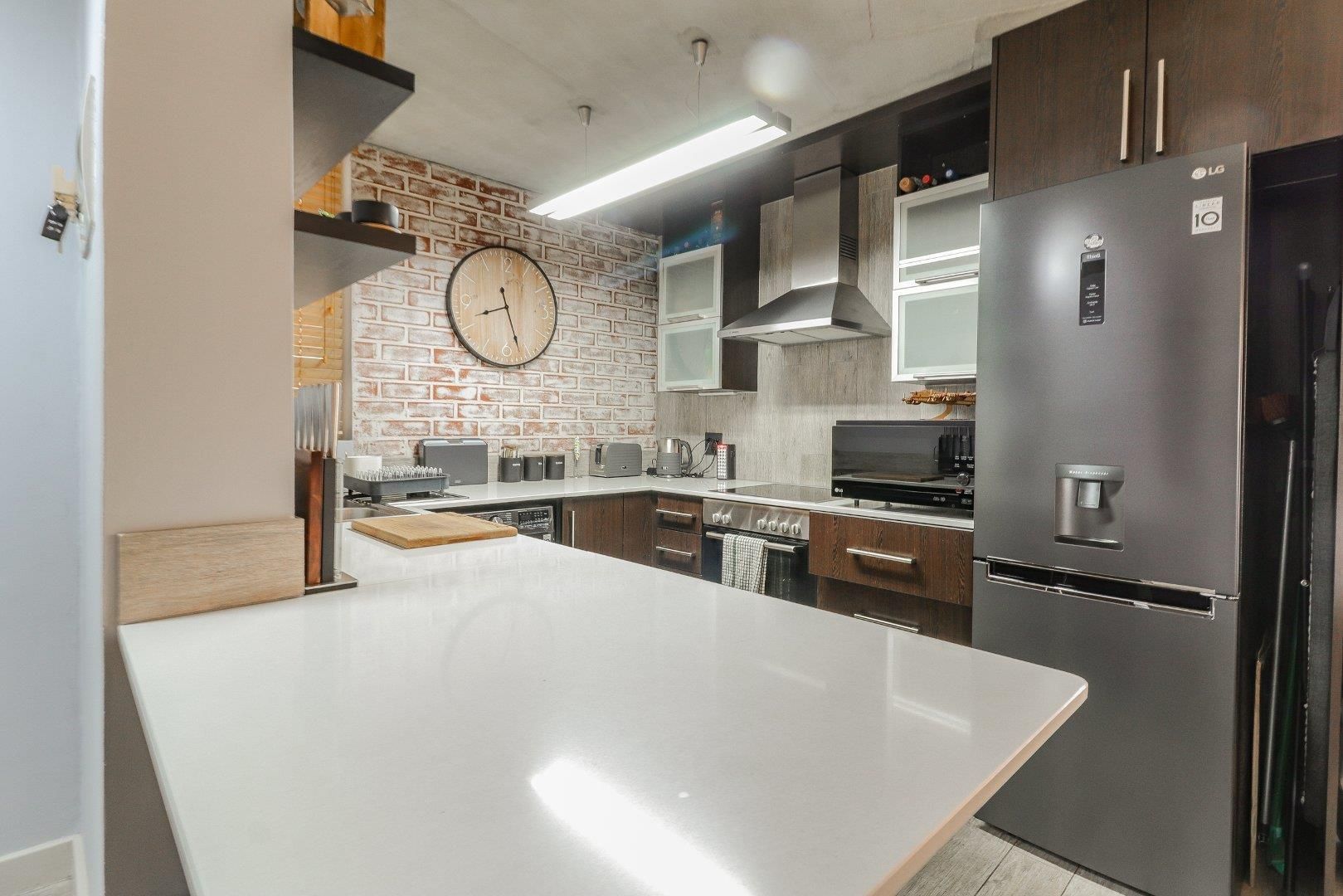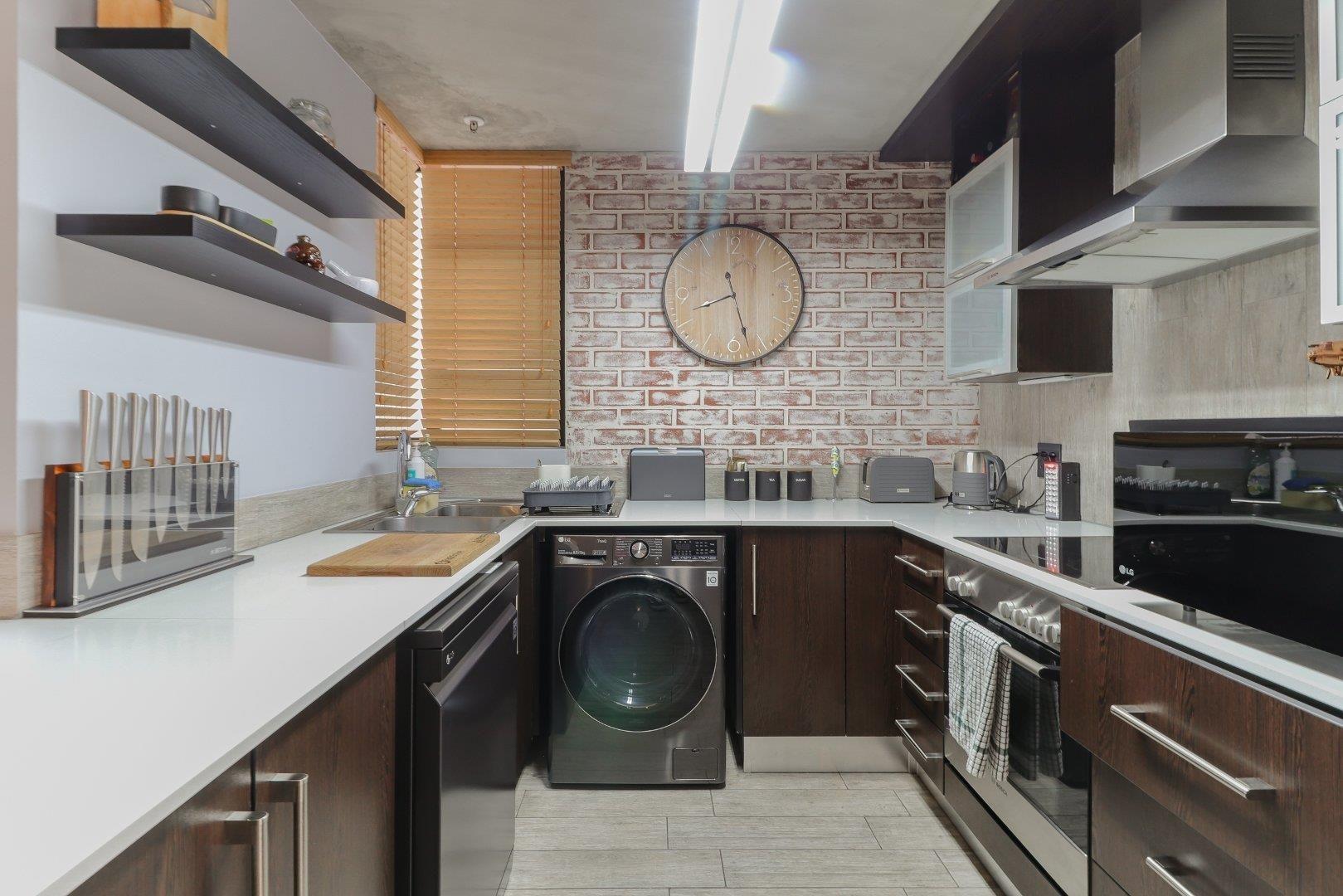 The kitchen is complete with sleek, modern finishes and ample cabinet space, providing both functionality and style.
