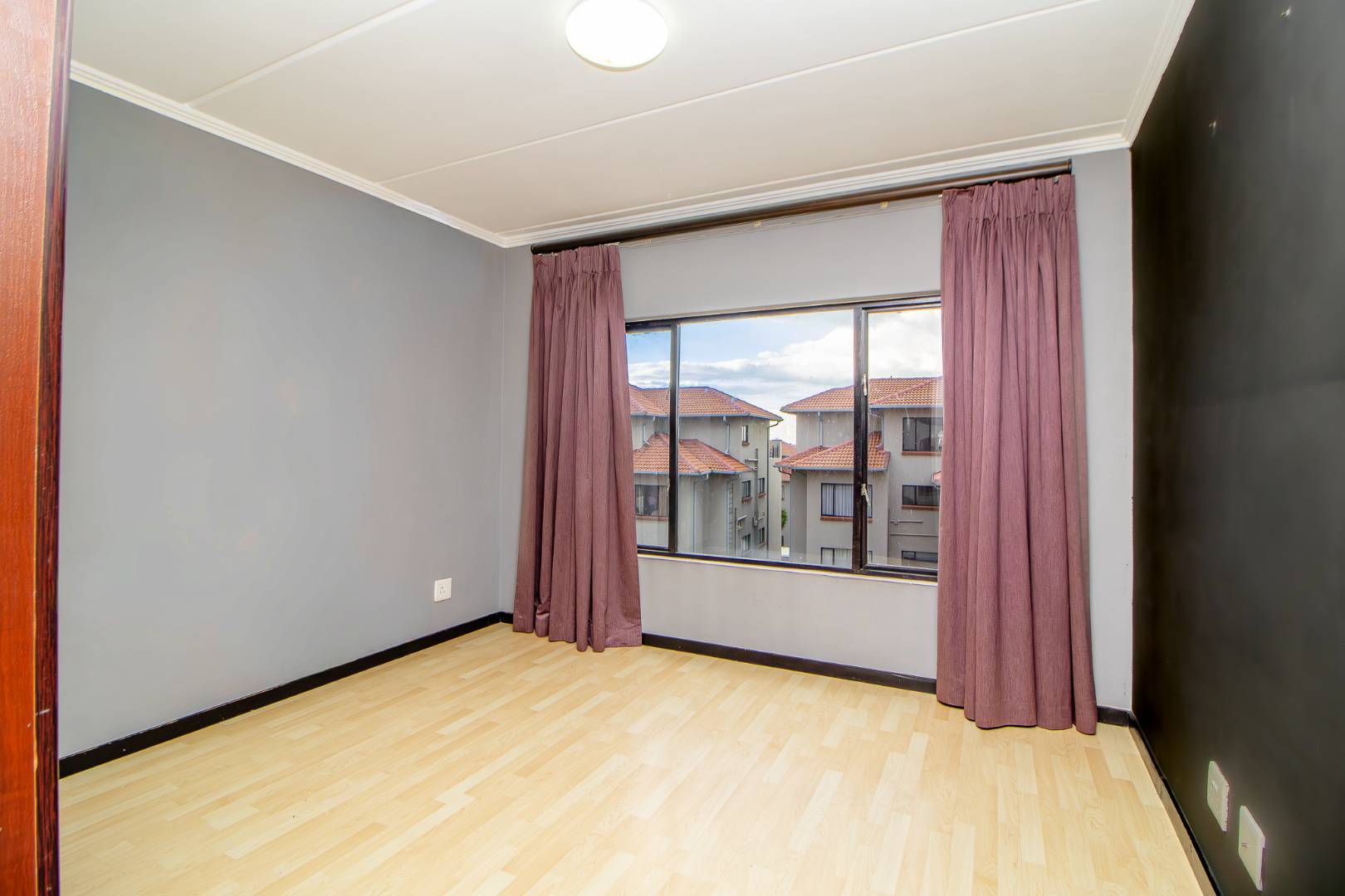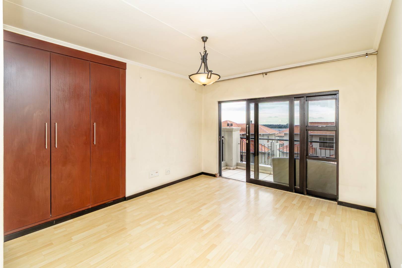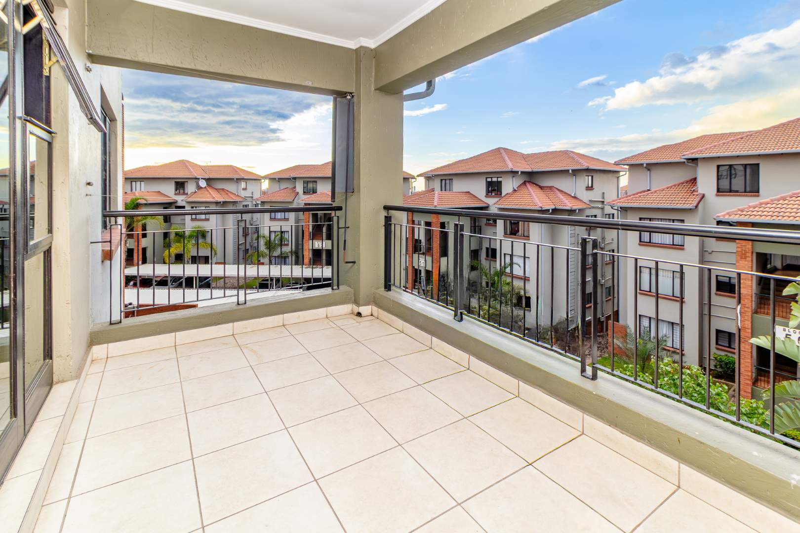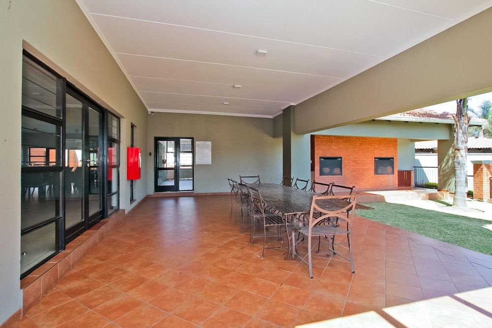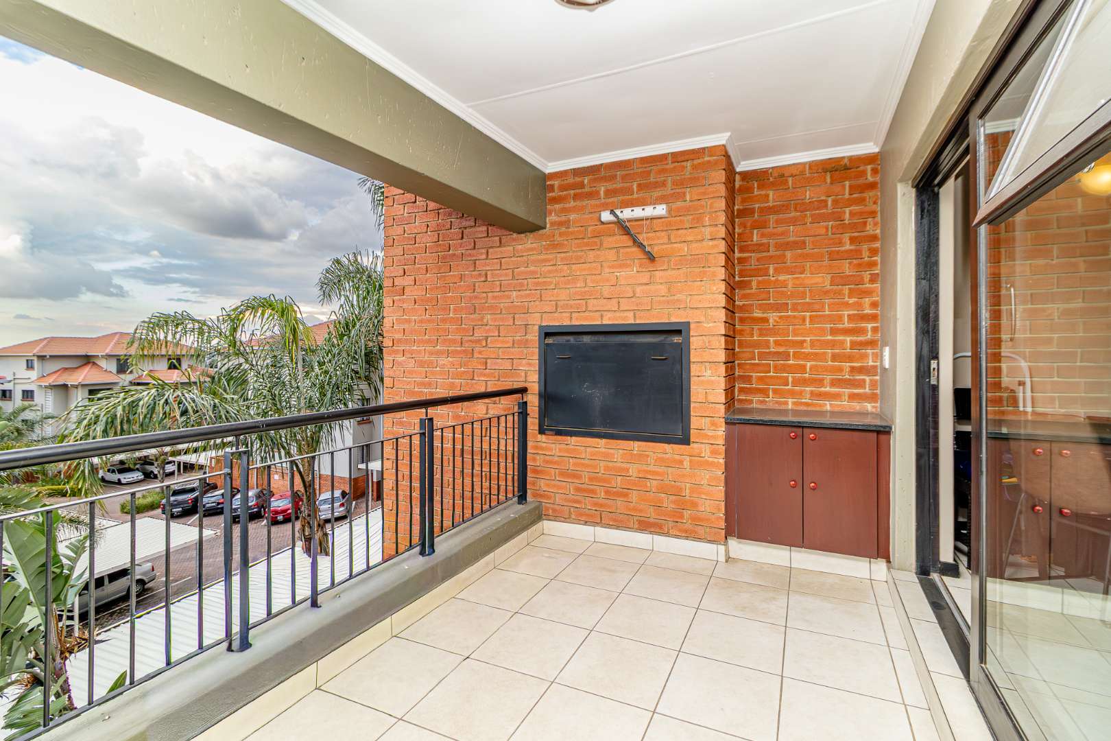 The kitchen accommodates two appliances with sufficient cupboard space, seamlessly flowing into a spacious lounge that opens onto a covered balcony with built-in braai — perfect for relaxed indoor-outdoor living.
