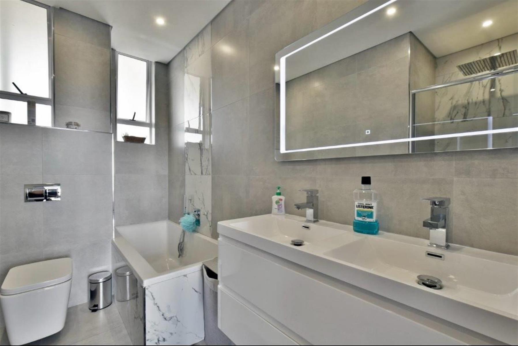 The main bedroom is generous and refined, with a practical walk-in dressing area and built-in dresser, while the sleek en-suite boasts twin basins and a spacious shower and bath with light up mirrors that luminate with touch.