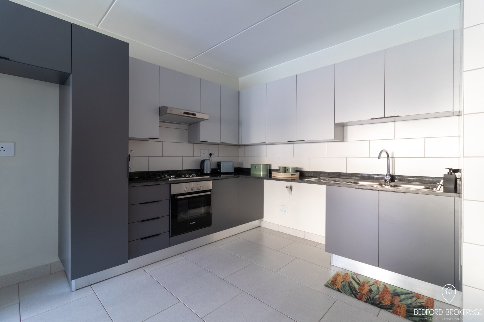 The kitchen Boasts a Bosch gas hob, an electric oven, a double sink, and space for three appliances along with a fridge. The stunning white cupboards and large pantry cupboard offer ample storage and style.