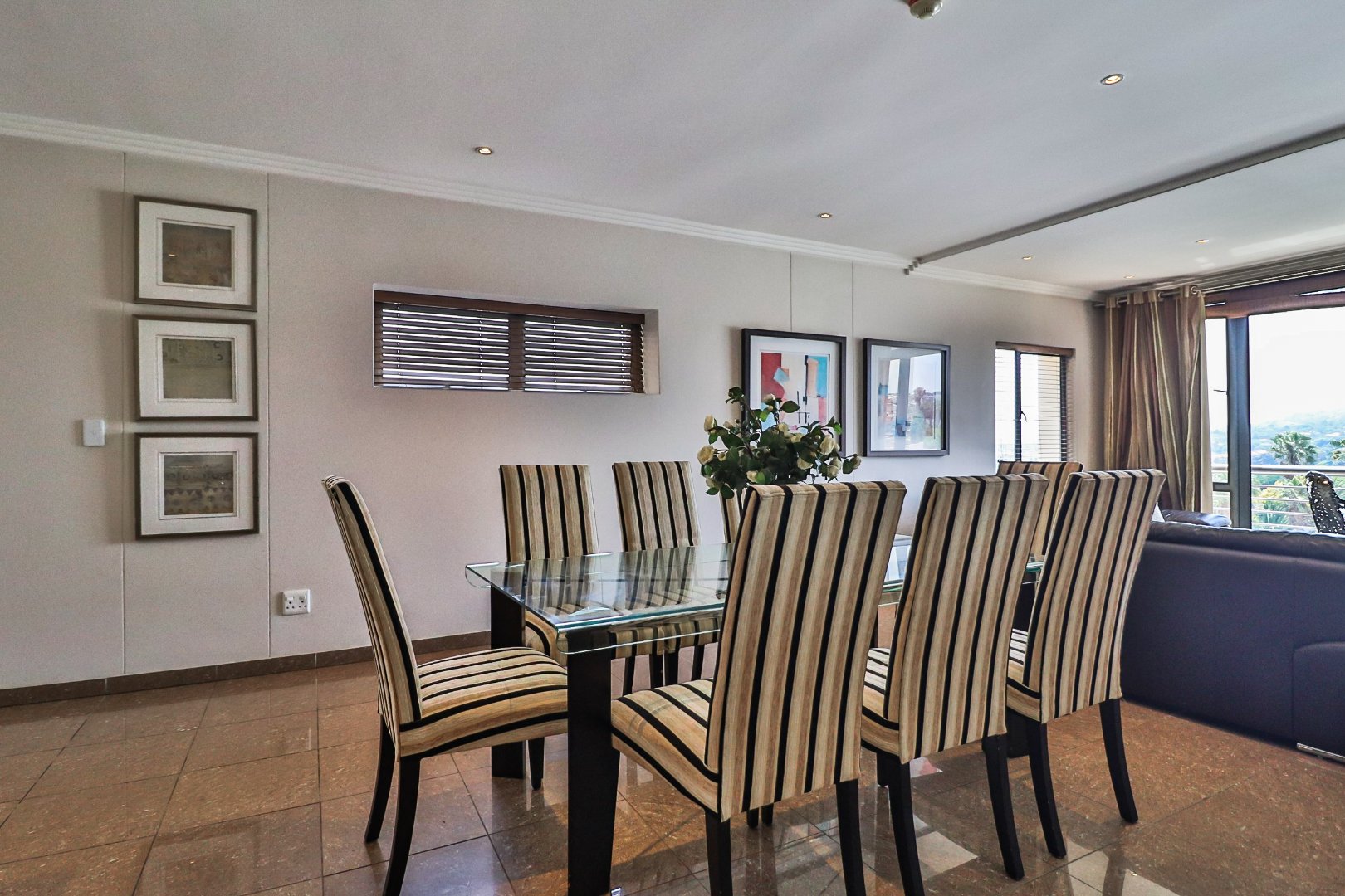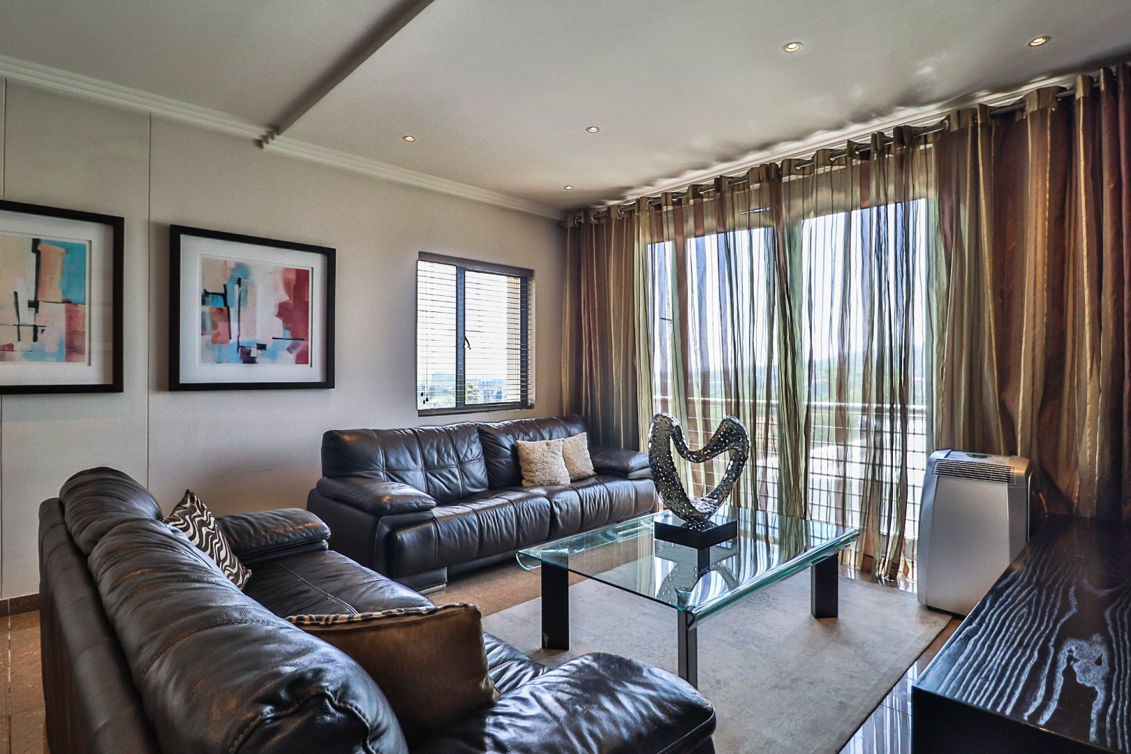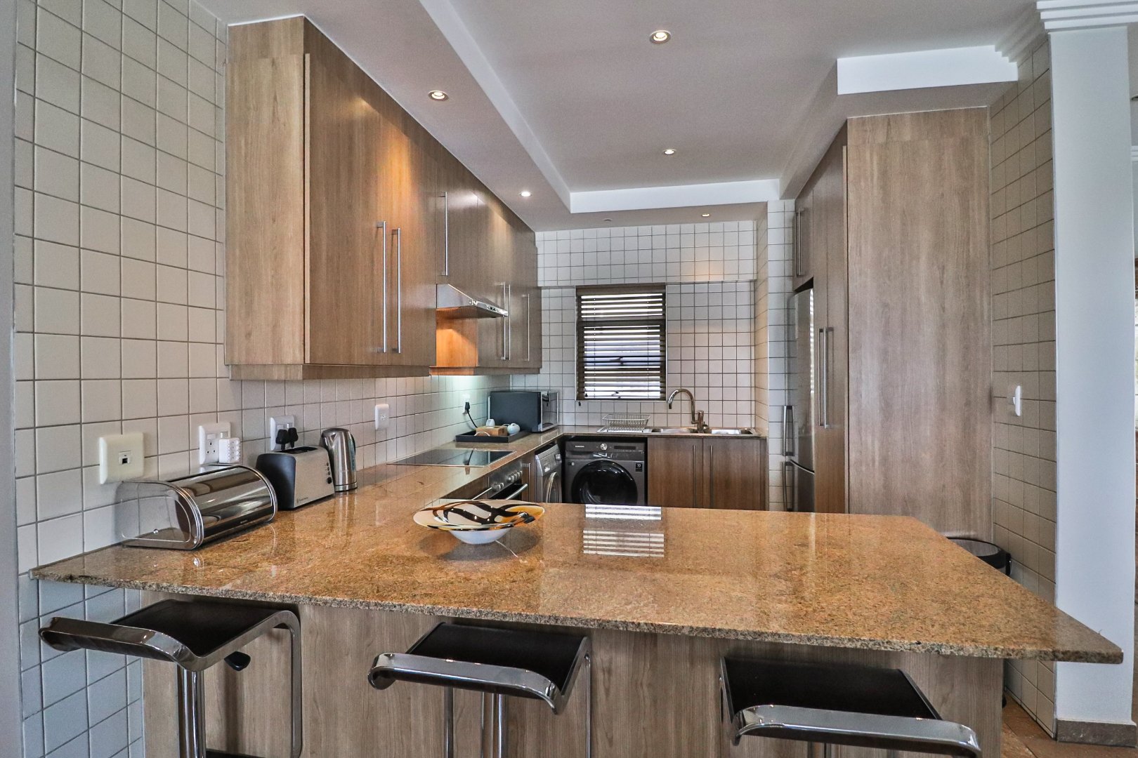 The apartment has an open plan living area with the kitchen and breakfast bar, overlooking the dining room and lounge with amazing views of Bedfordview from a Juliet balcony.