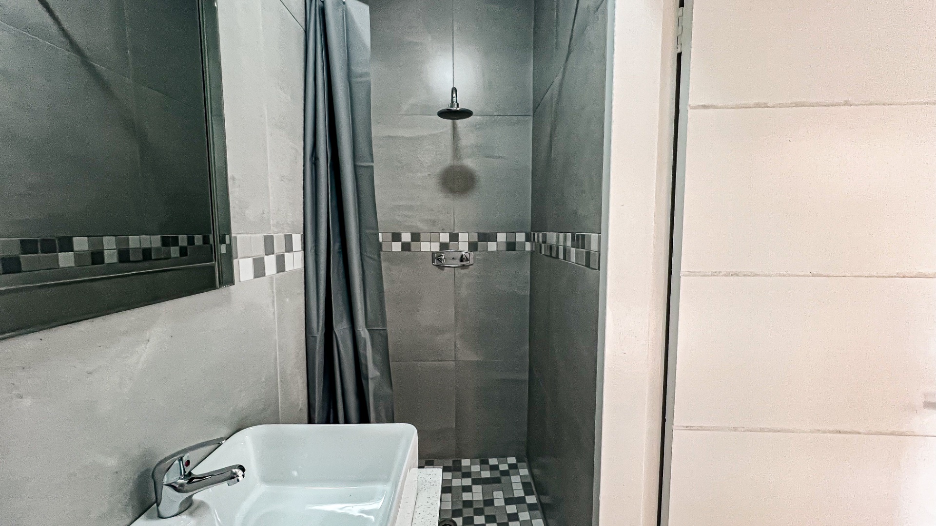 Bathroom has a shower, loo and basin.