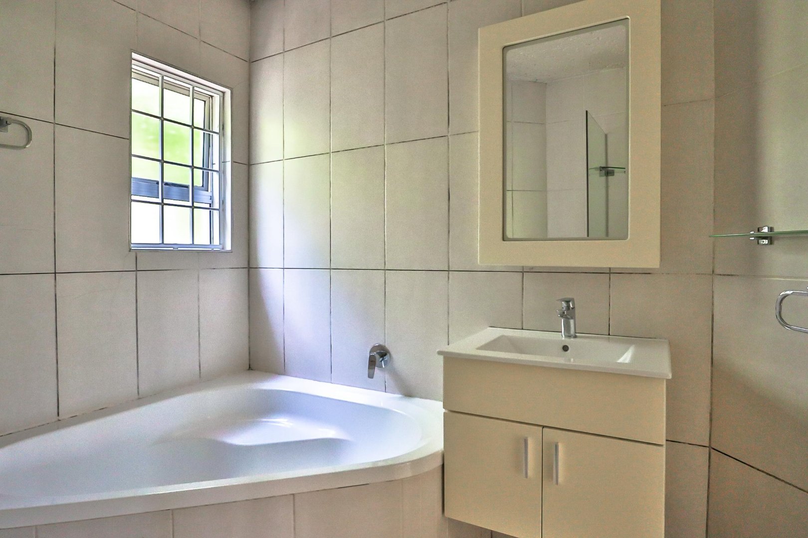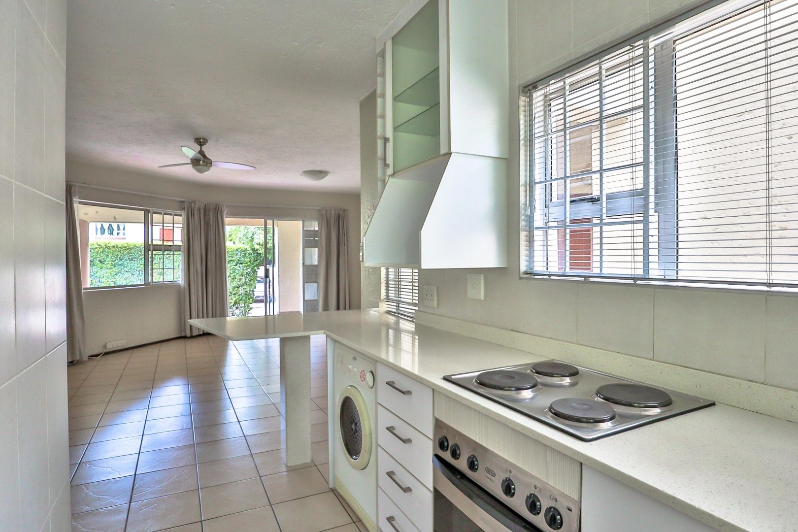 This very neat private garden unit has become available to rent. The kitchen has beautiful cupboards and Ceasar Stone tops. The open plan kitchen leads to the lounge and dining area, which leads onto the very spacious covered patio. The bedroom has lots of cupboards and an en-suite full bathroom with a corner bath and shower.