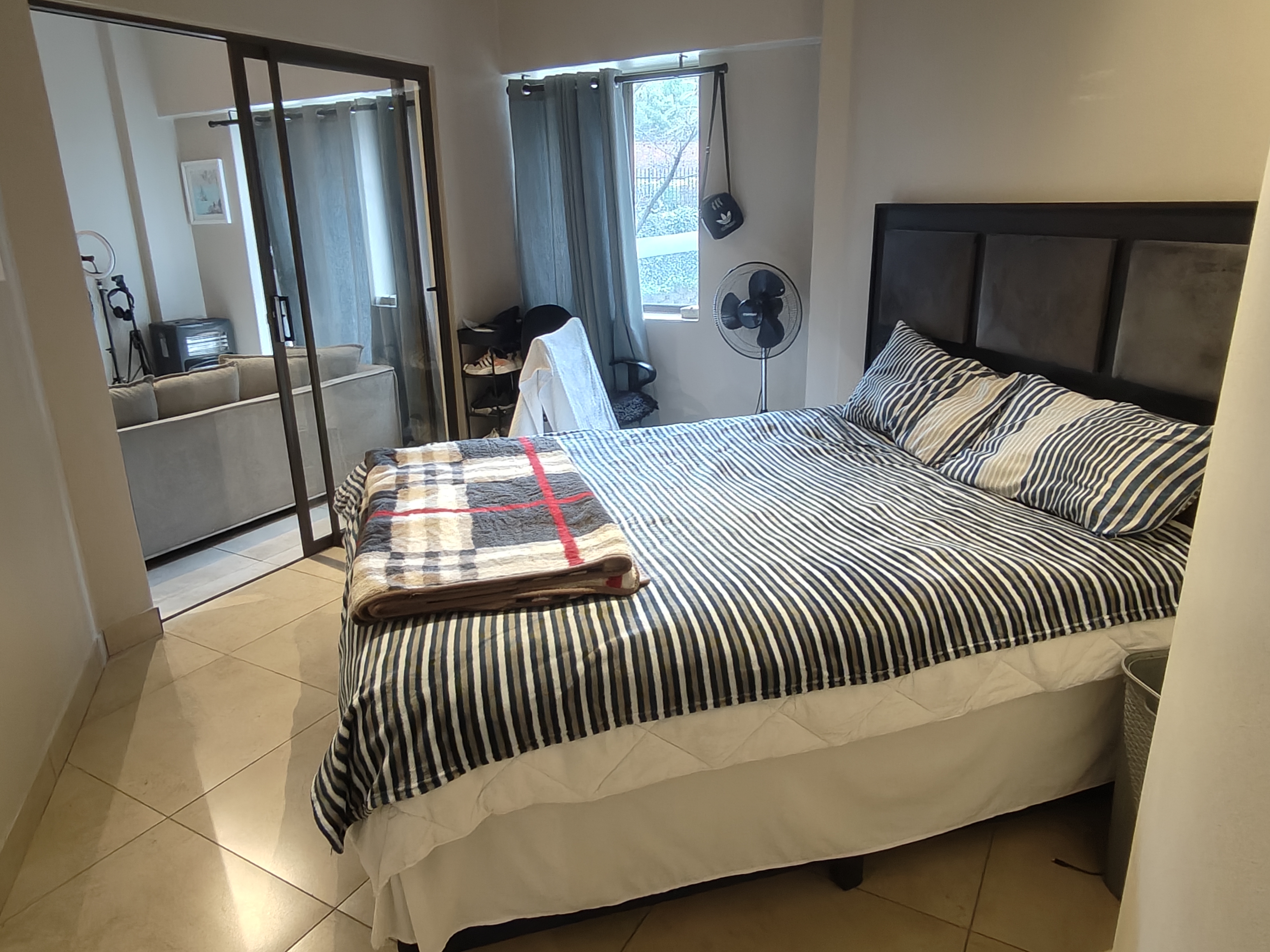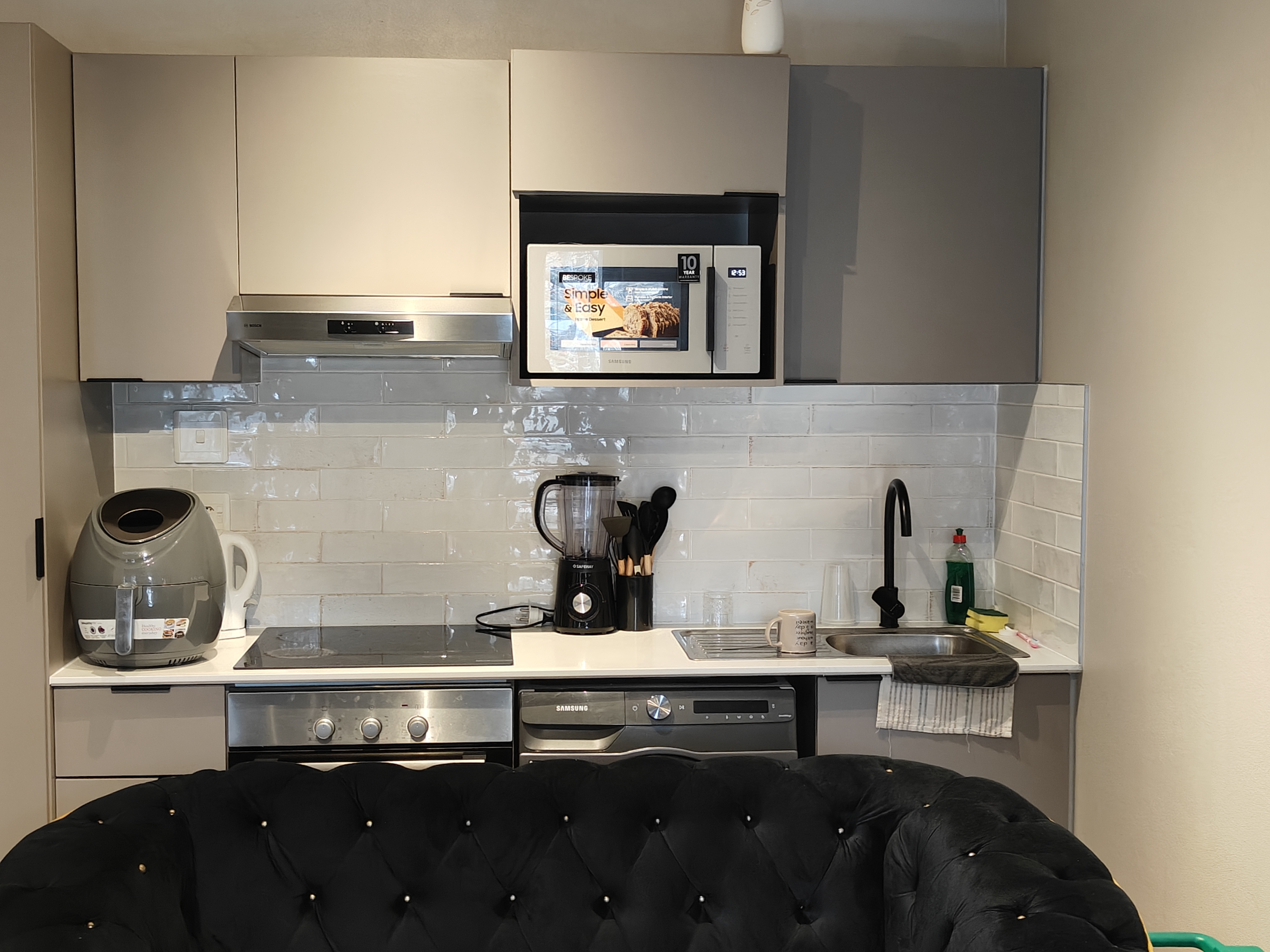 This modern one-bedroom, one-bathroom apartment features a stylish open-plan layout with a sleek kitchen, built-in cupboards, a private balcony, and convenient covered parking.