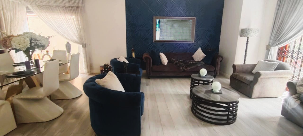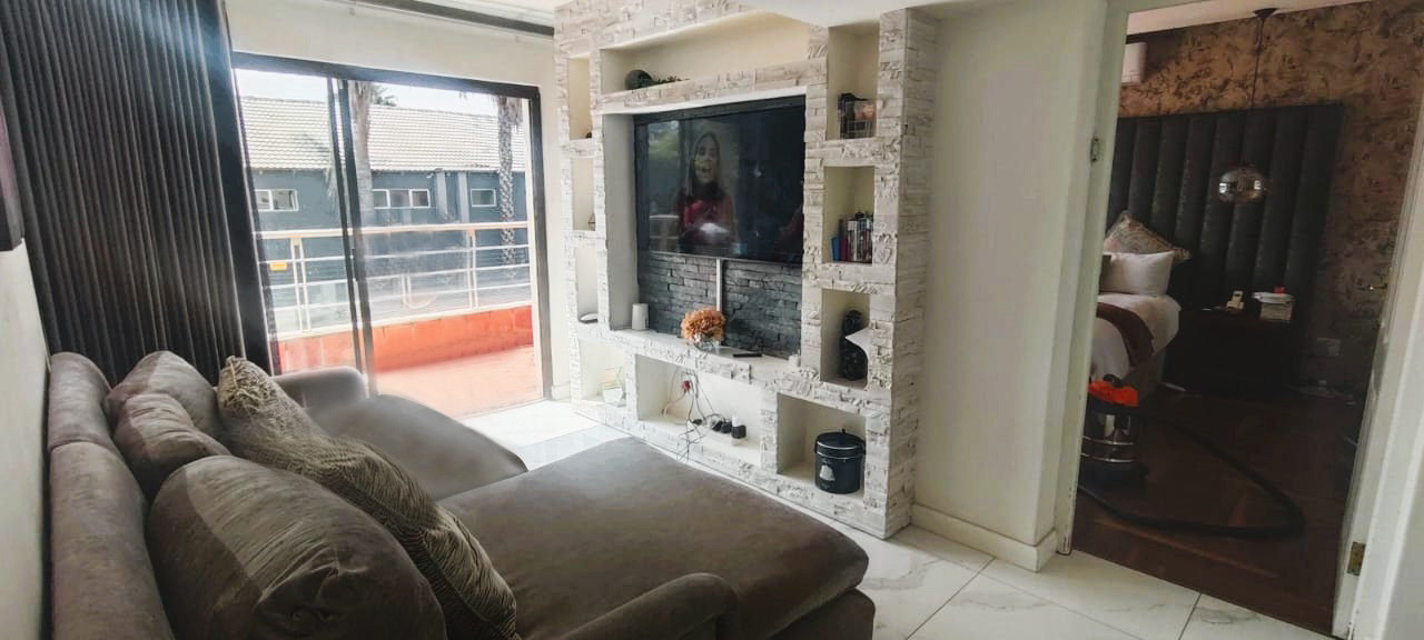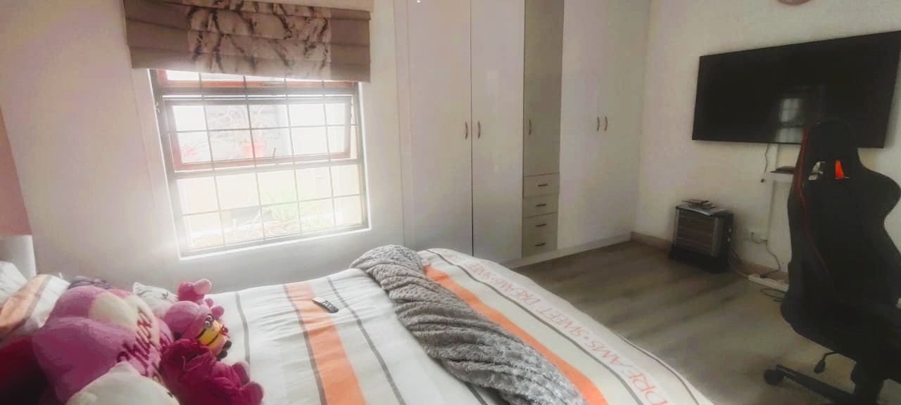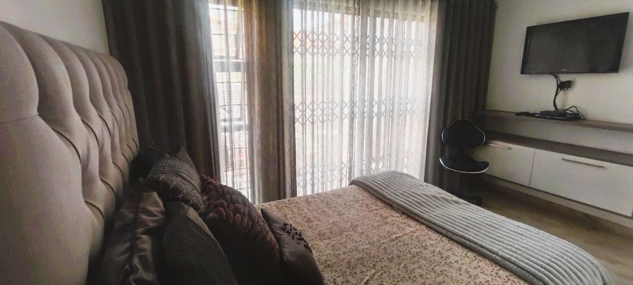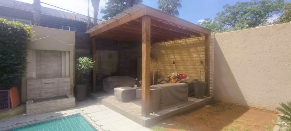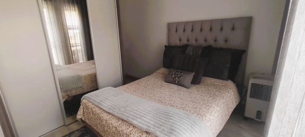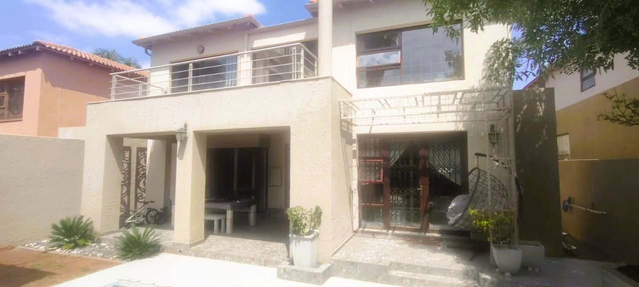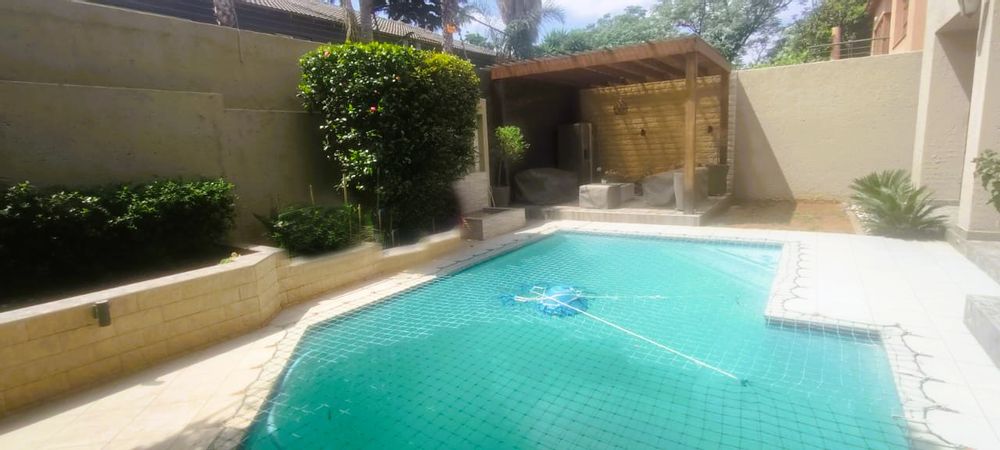 Introducing a sleek and contemporary 4-bedroom cluster home situated in a sought-after estate. This property features an open-plan kitchen and dining area, a cozy TV room, and an elegant formal lounge. The guest room includes a kitchenette and a private bathroom. Enjoy the convenience of a double garage, a sparkling pool, and a built-in braai in a stunning entertainment space. The home boasts three bedrooms, including one with an en-suite bathroom, along with a full family bathroom. Additional highlights include two outdoor balconies and a comfortable pajama lounge.