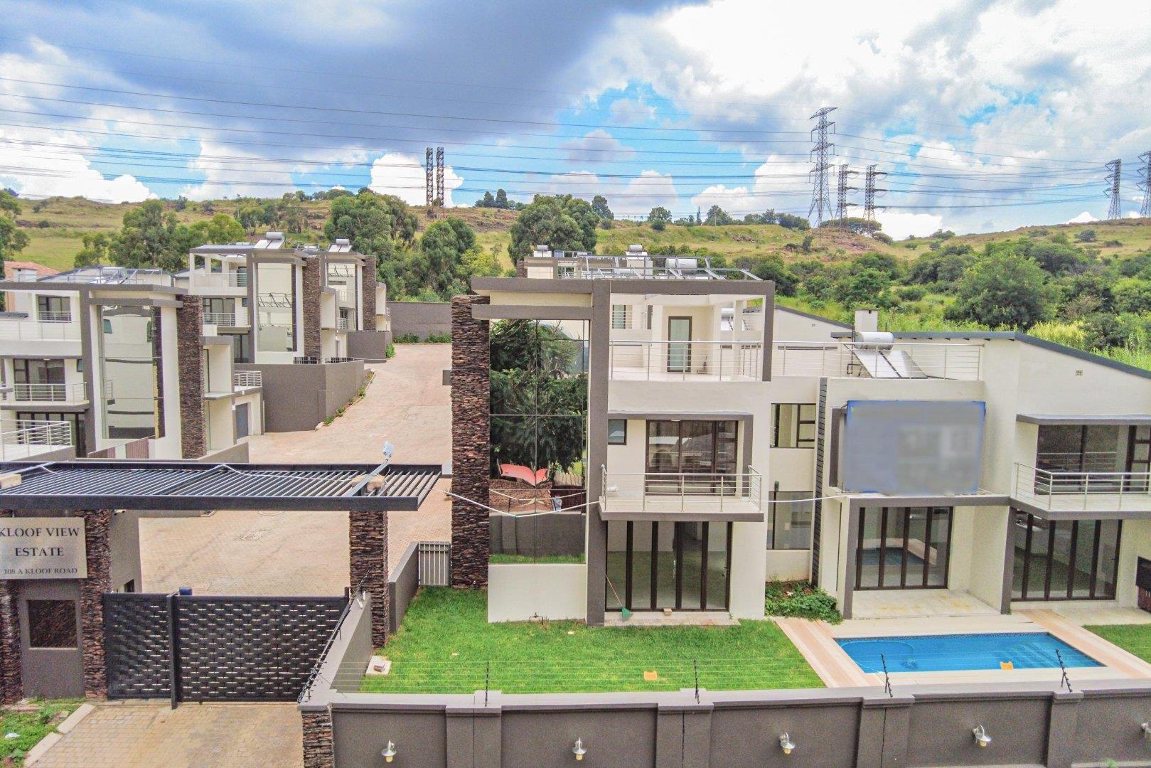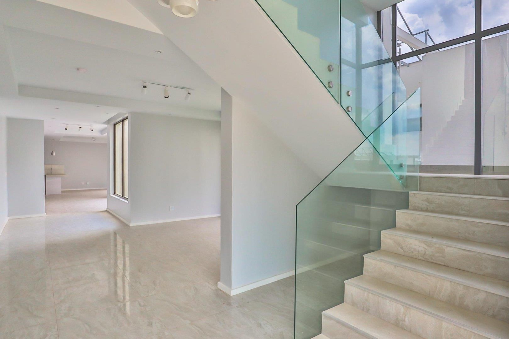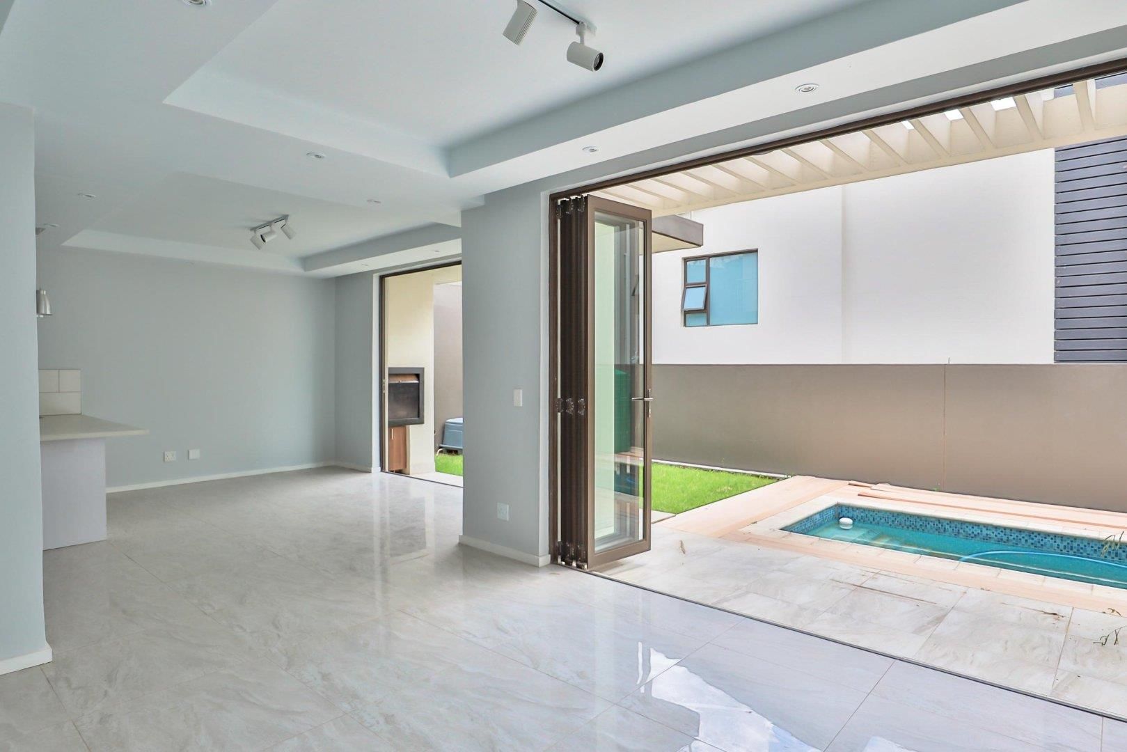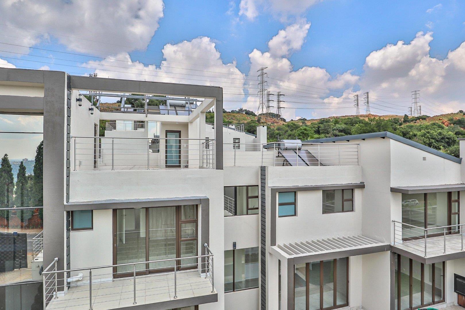 This luxurious cluster is located in a 24-hour secured complex in the heart of Bedfordview. This brand new home comes equipped with the most up-to-date modern finishes from the double volume front entrance all the way up to the 3rd story rooftop terrace. There are 3 reception rooms that lead off from the spacious gourmet kitchen fitted with Caesar stone tops and a breakfast bar/island. The spacious dining room leads onto a beautiful covered patio with a built-in braai, a low-maintenance garden, and a sparkling lap pool. There is also a study downstairs.