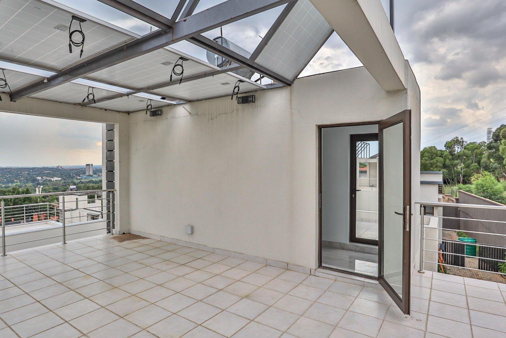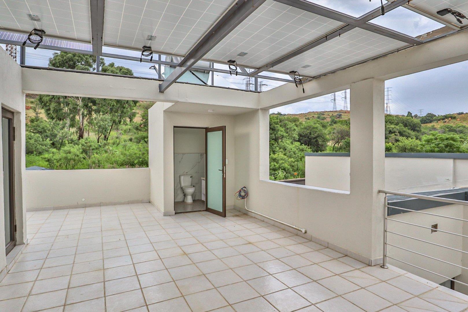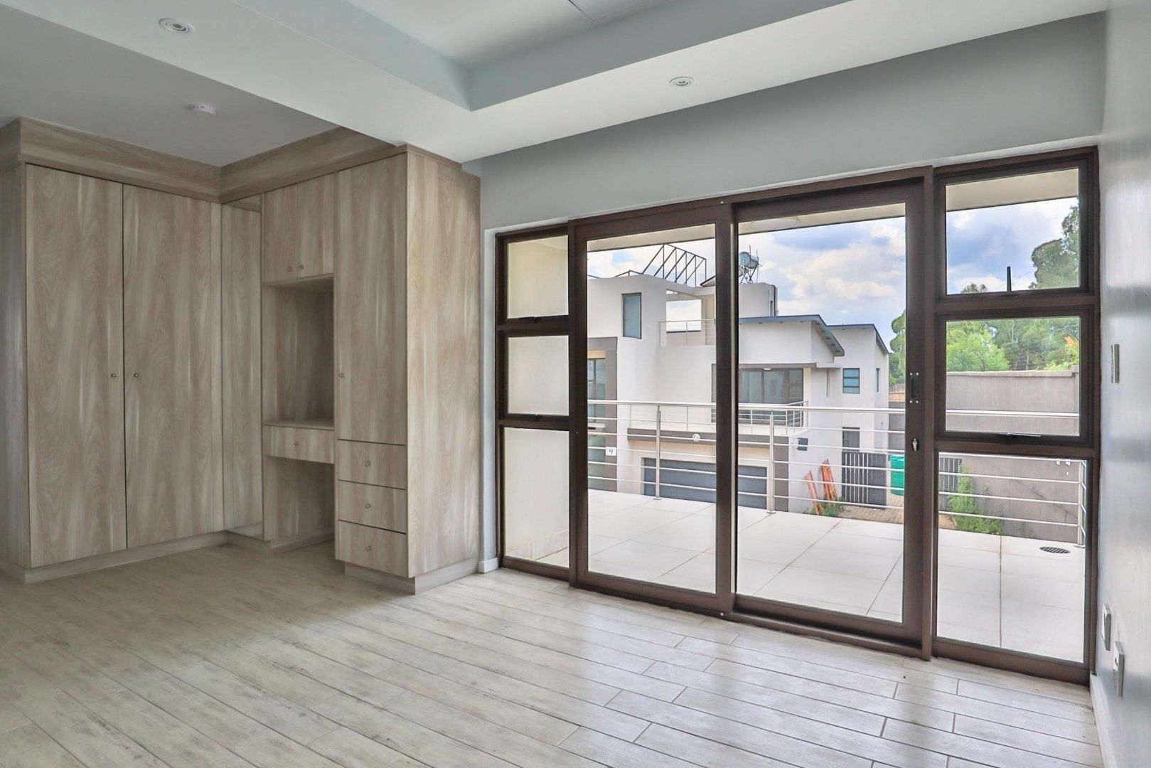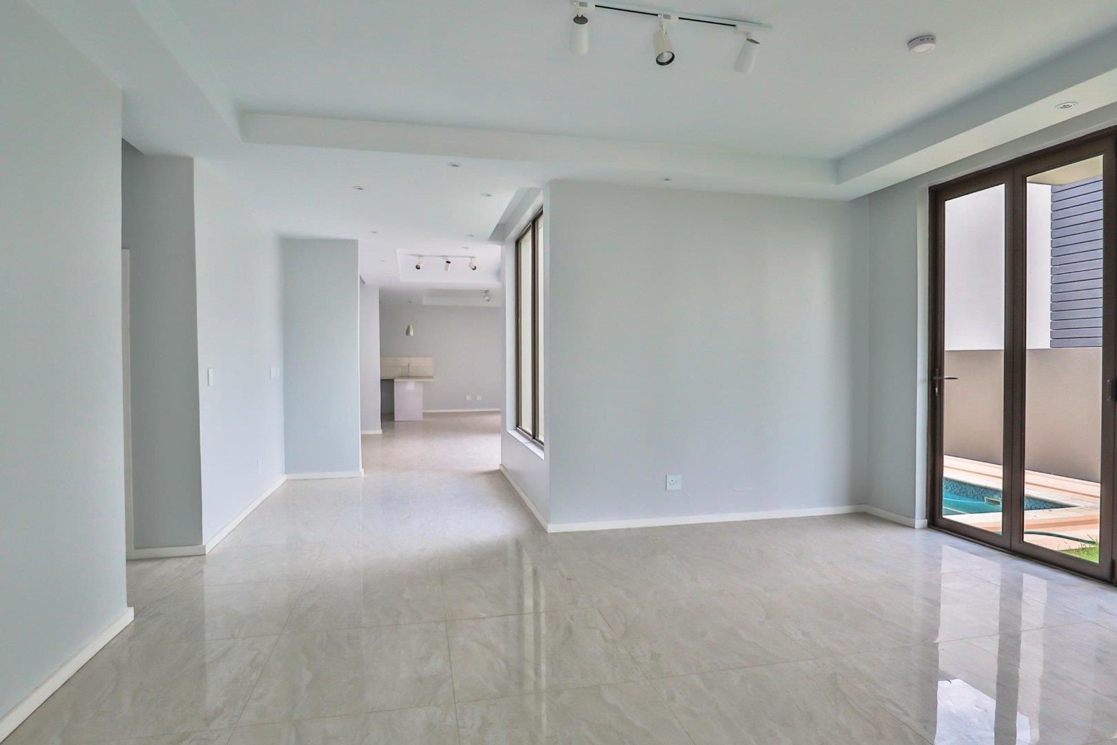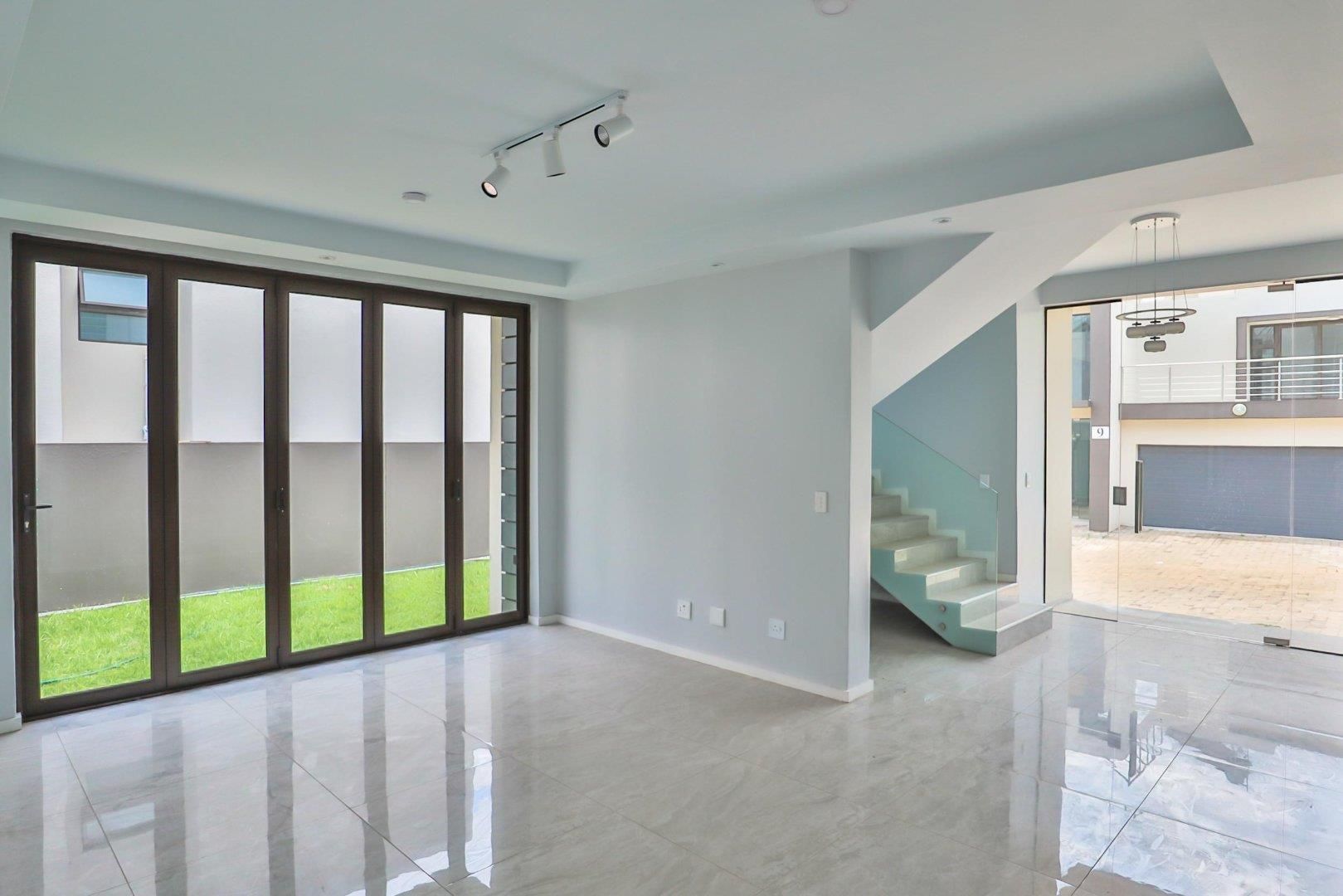 This luxurious cluster is located in a 24-hour secured complex in the heart of Bedfordview. This brand new home comes equipped with the most up-to-date modern finishes from the double volume front entrance all the way up to the 3rd story rooftop terrace. There are 3 reception rooms that lead off from the spacious gourmet kitchen fitted with Caesar stone tops and a breakfast bar/island. The spacious dining room leads onto a beautiful covered patio with a built-in braai, a low-maintenance garden, and a sparkling lap pool. There is also a study downstairs.