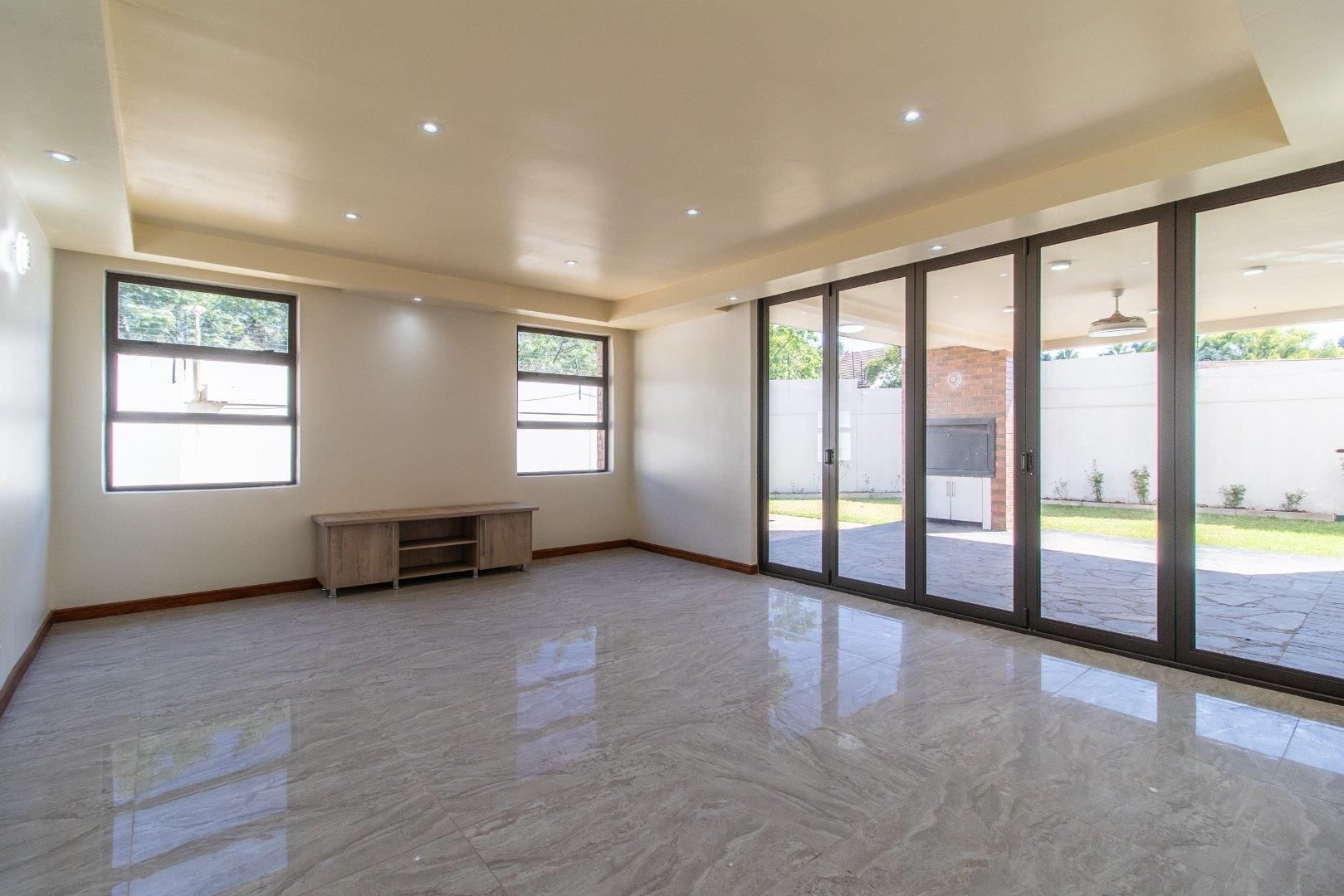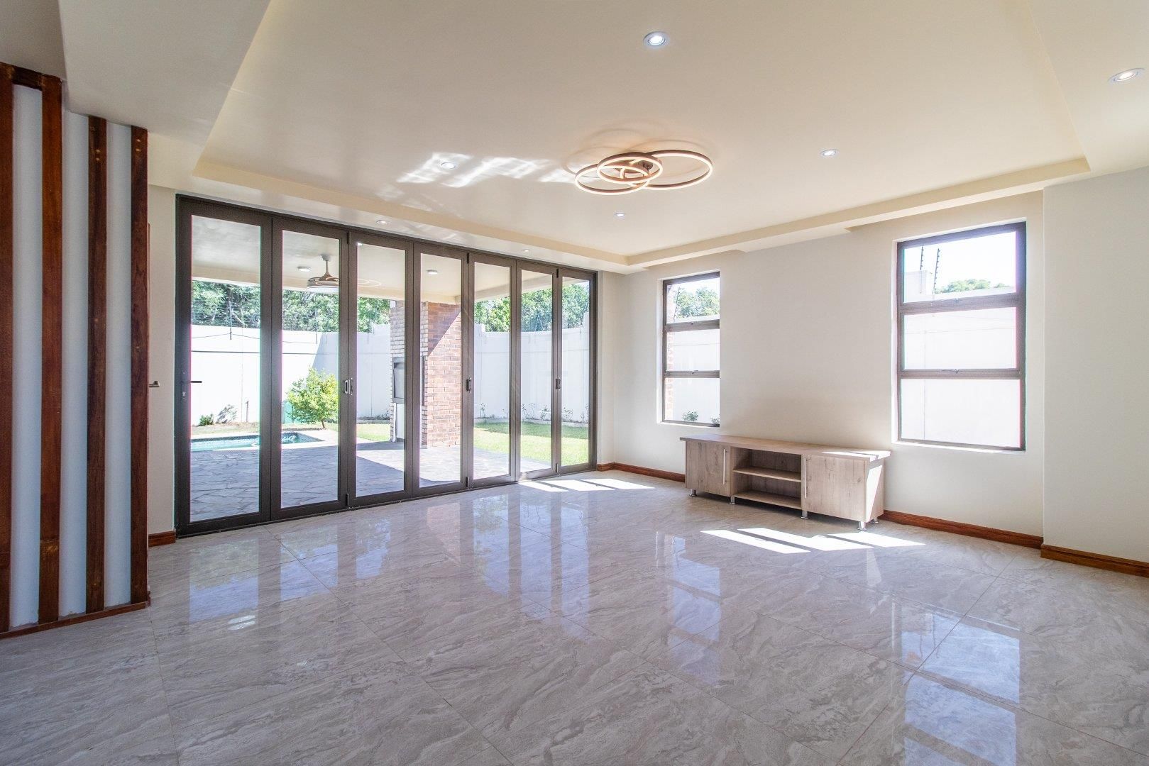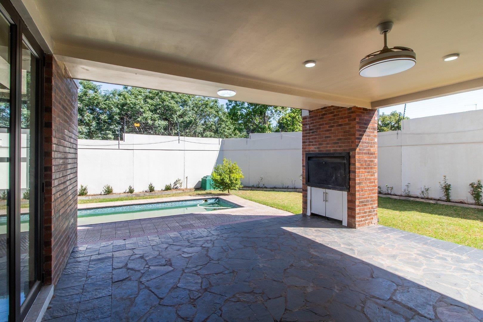 Free flowing to the reception rooms, you have a dining area, family lounge, and formal lounge, all leading onto the covered patio with a built in braai area with a private garden and pool.