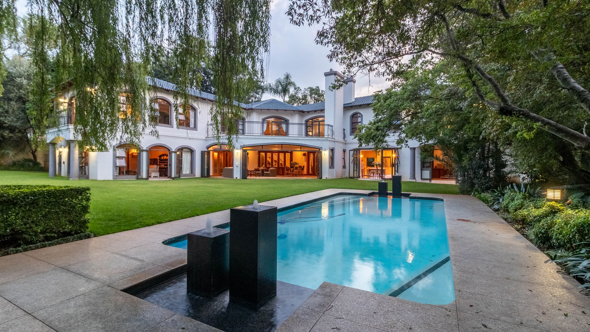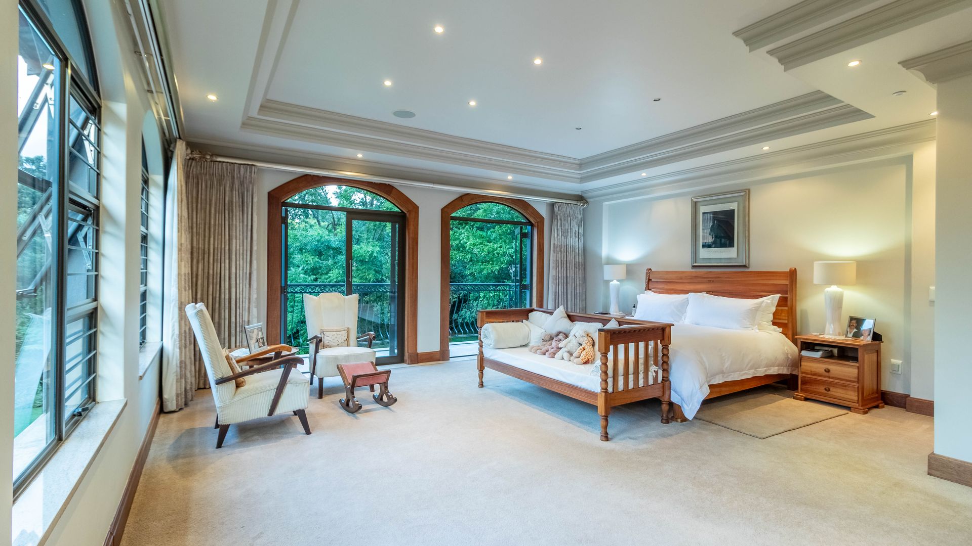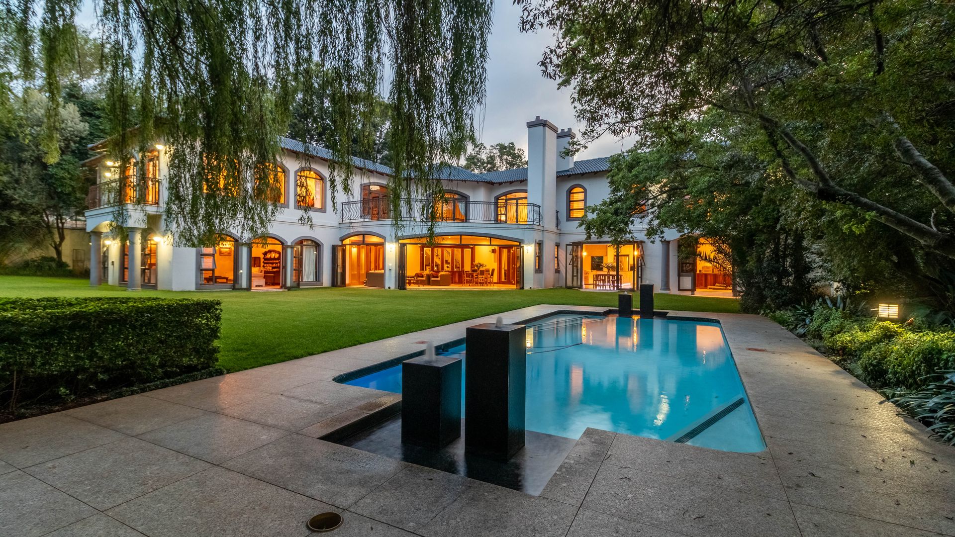 The property includes a spacious entertainment area with a built-in gas braai, overlooking a sparkling pool with water features. The home is equipped with a smart home system, complete with a camera system and smart security features. There’s also underfloor heating throughout.