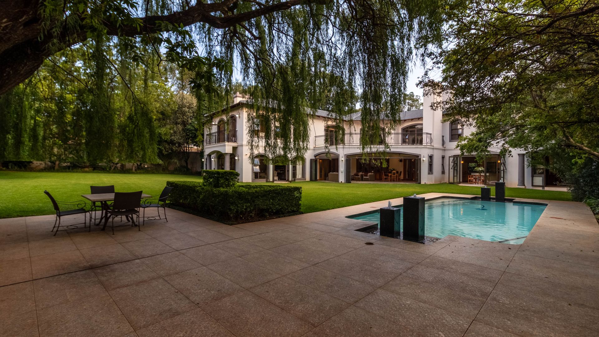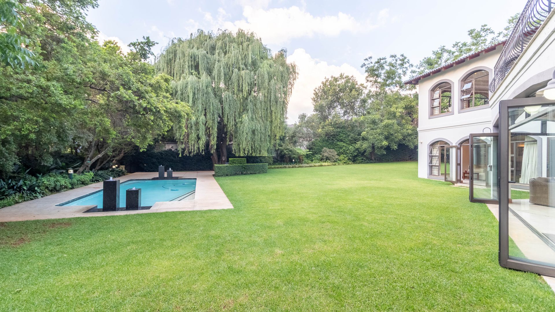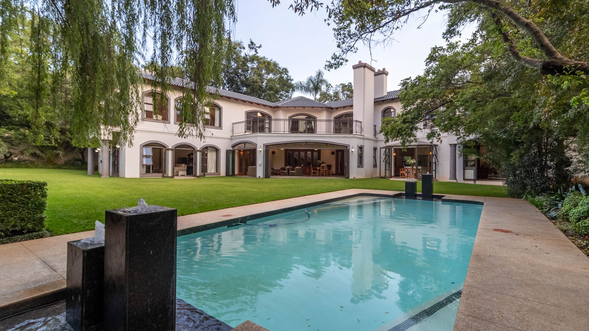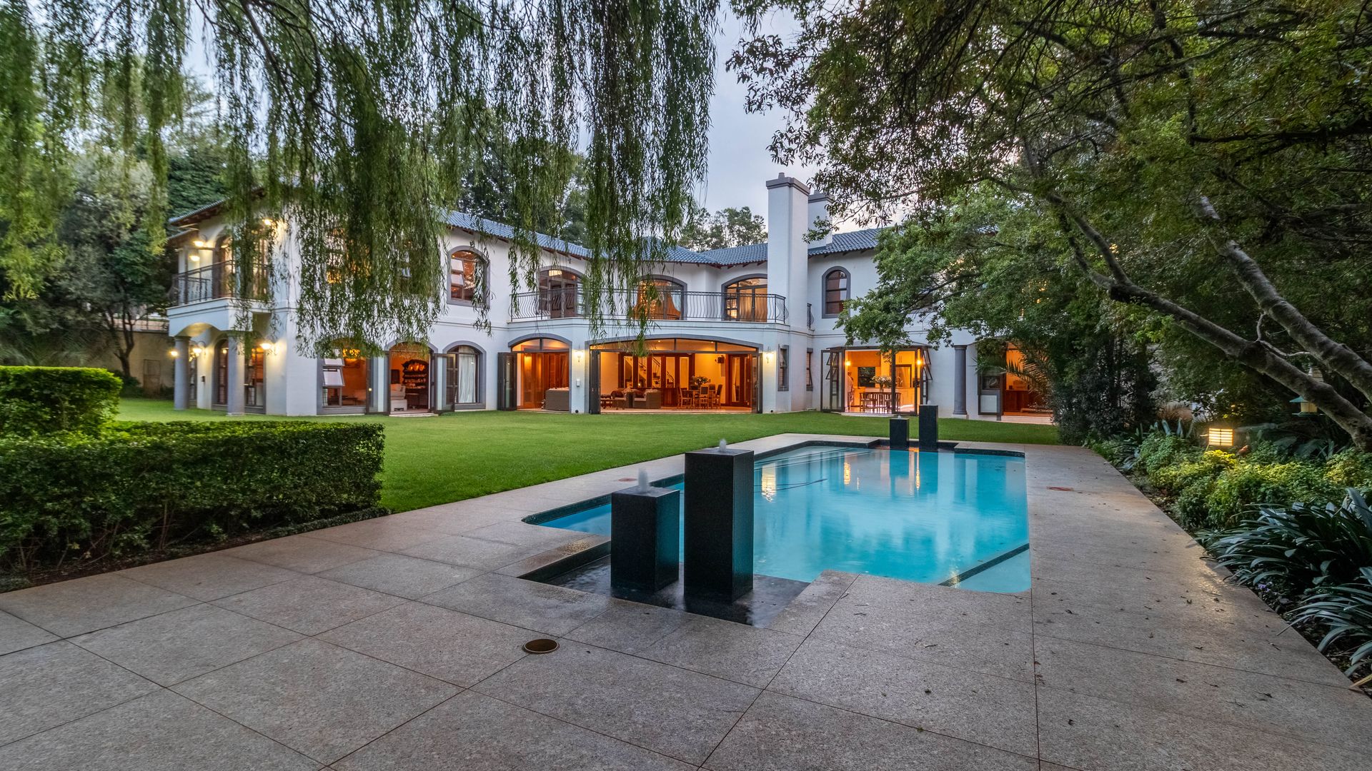 The property includes a spacious entertainment area with a built-in gas braai, overlooking a sparkling pool with water features. The home is equipped with a smart home system, complete with a camera system and smart security features. There’s also underfloor heating throughout.
