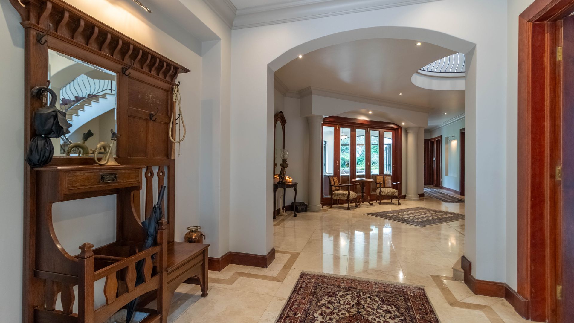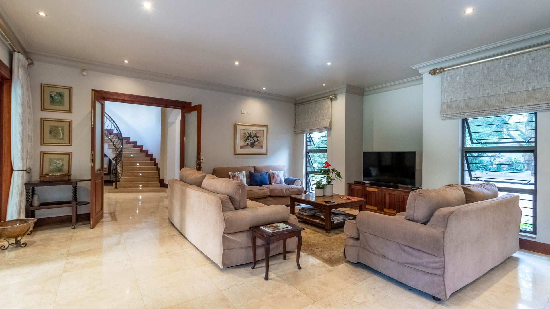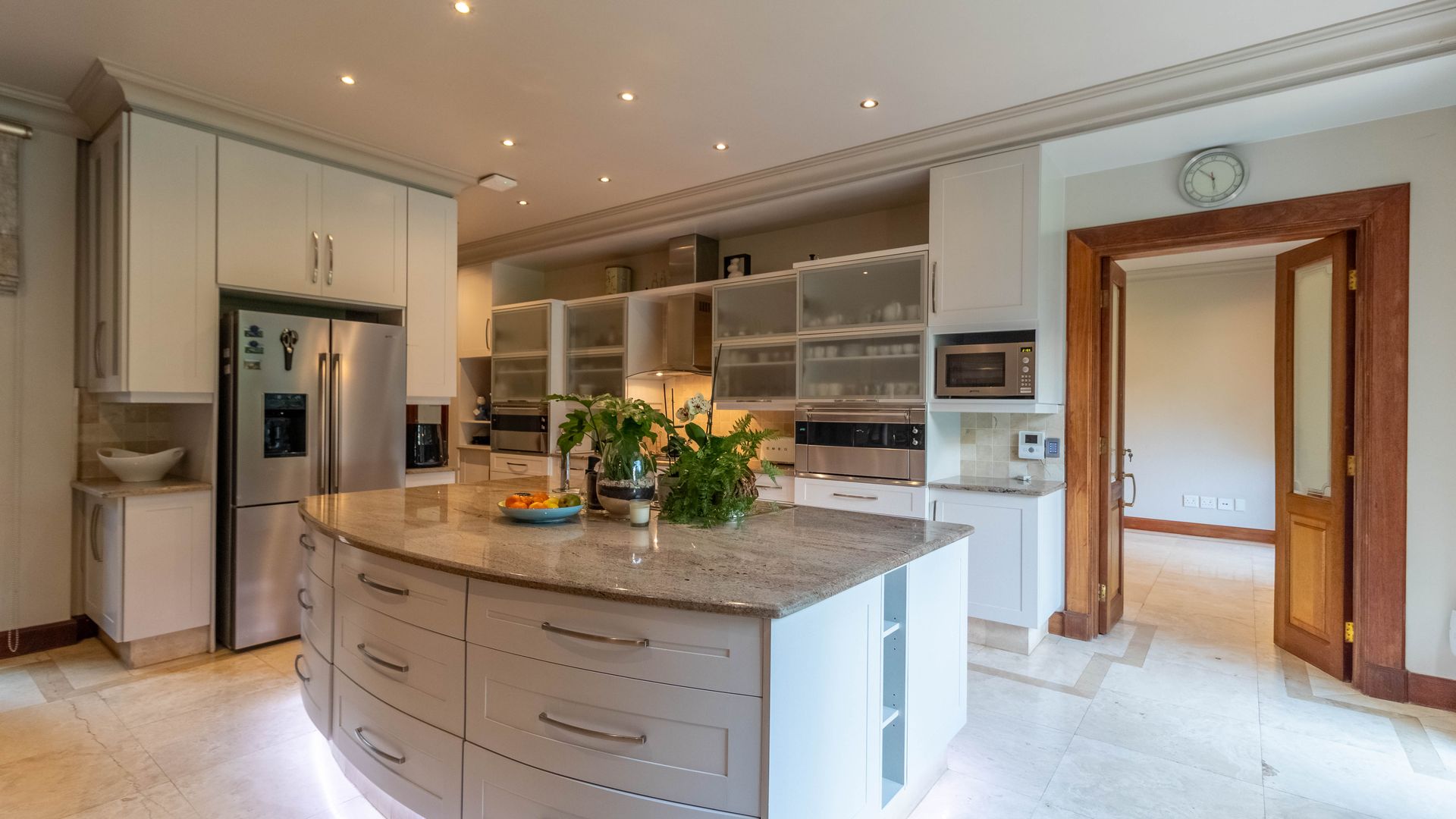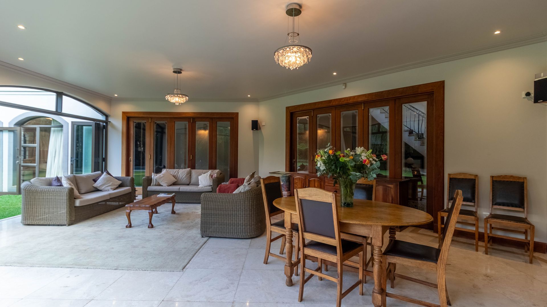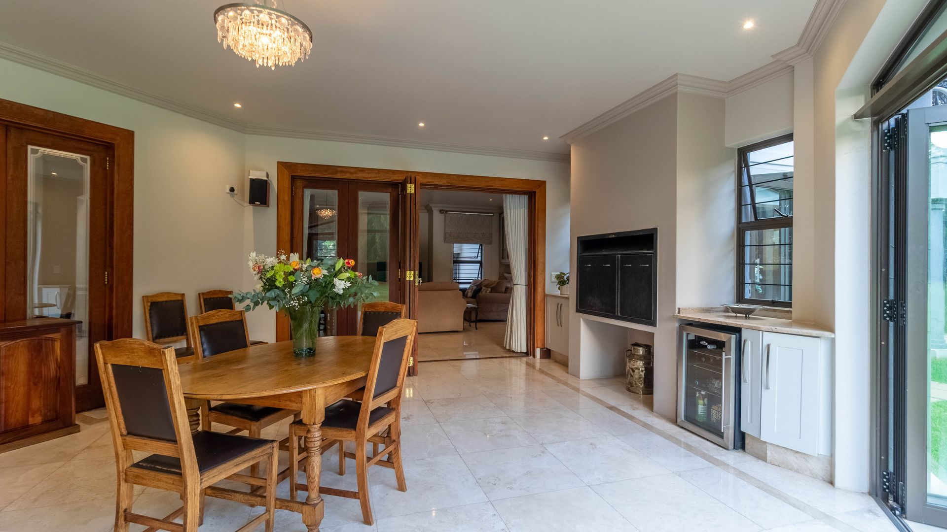 This exquisite house for sale offers luxurious living with exceptional features throughout. The entrance hall welcomes you with a breath taking experience, setting the tone for the stylish interior. The open-plan kitchen, lounge, and dining area are perfect for entertaining, with a center island featuring prep bowls, granite countertops, and top-of-the-line appliances, including two SMEG eye-level ovens and a gas hob. The kitchen comes complete with an imported instant boiling water tap.There’s also a separate scullery and laundry room for added convenience. There is a separate spacious office for working from home, and for the wine connoisseur a few steps down you have a large wine cellar