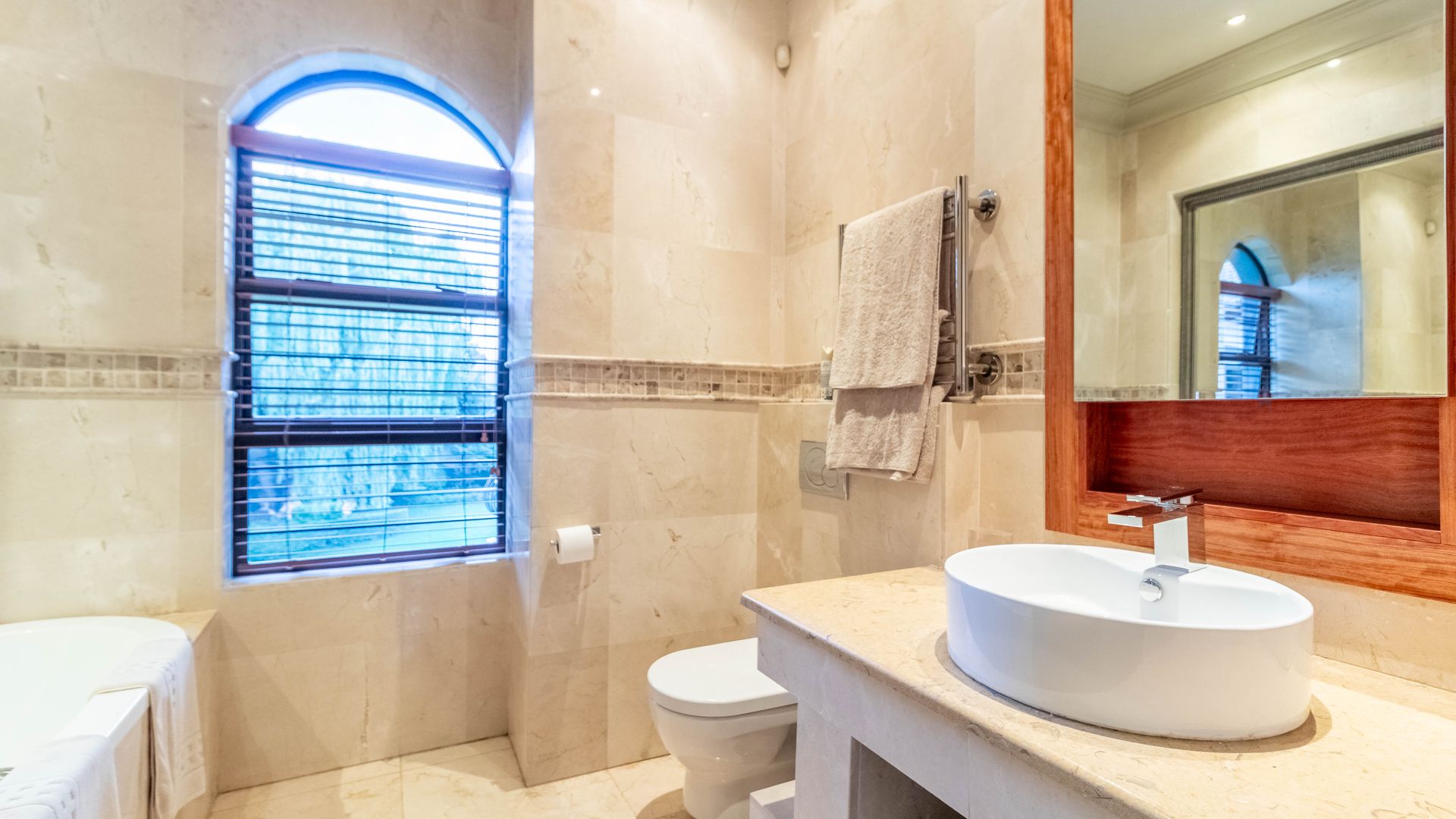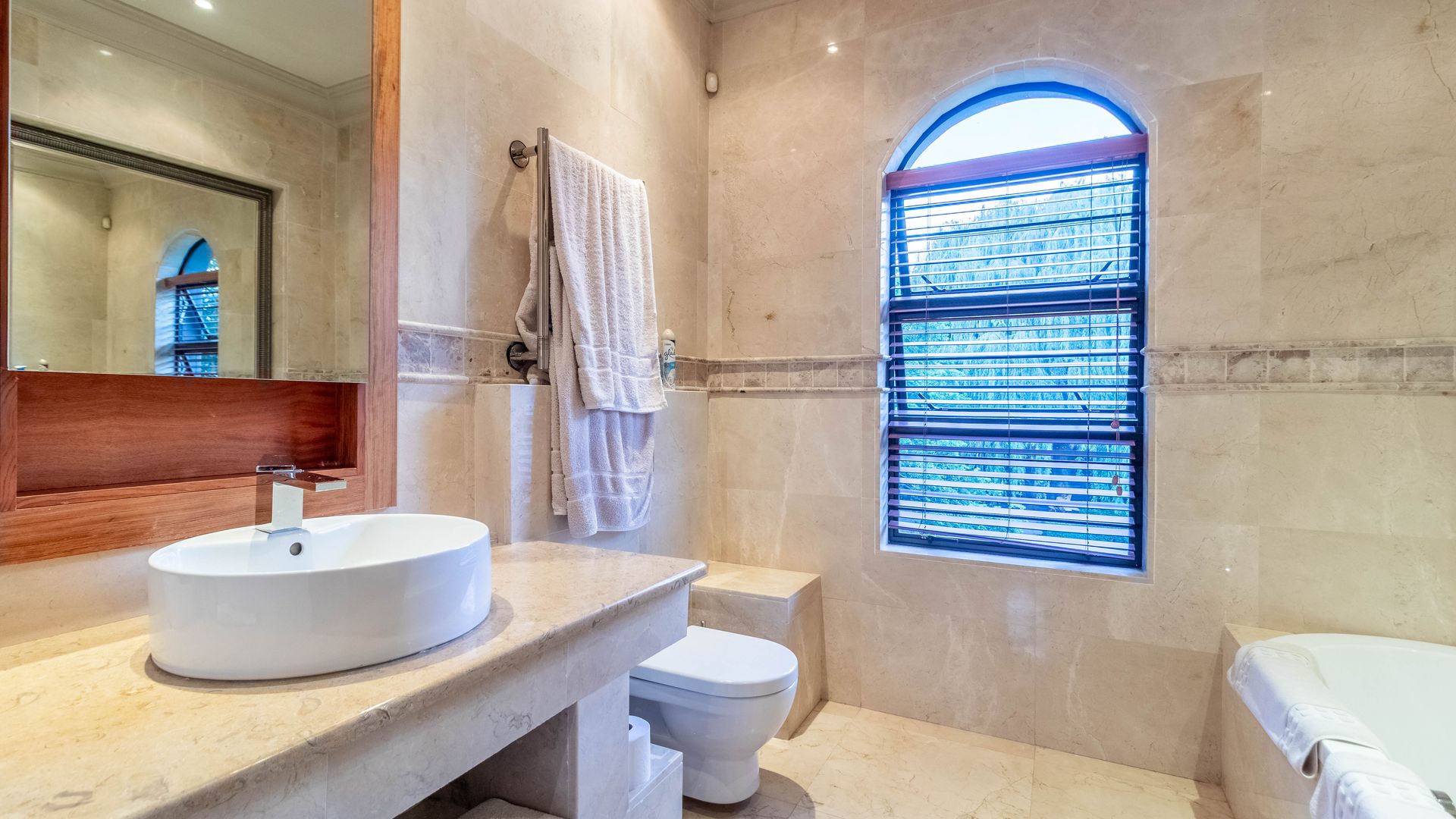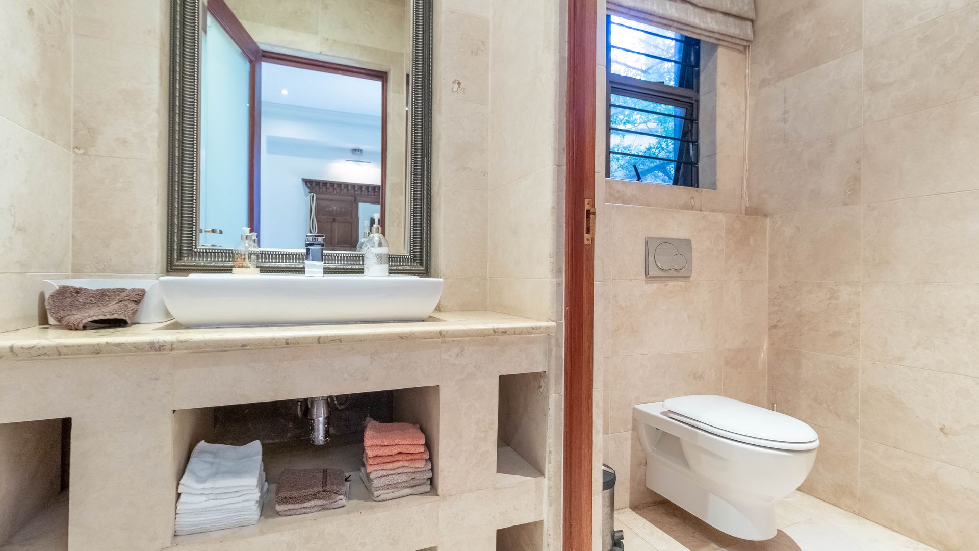 With 5 en-suite bedrooms, all featuring travertine flooring and luxury carpets, the house is a true retreat. The master bedroom offers an air conditioning unit, a full bathroom with a double shower, a full dressing room, and double vanity, plus an additional vanity in the toilet. Every bedroom has its own private balcony.