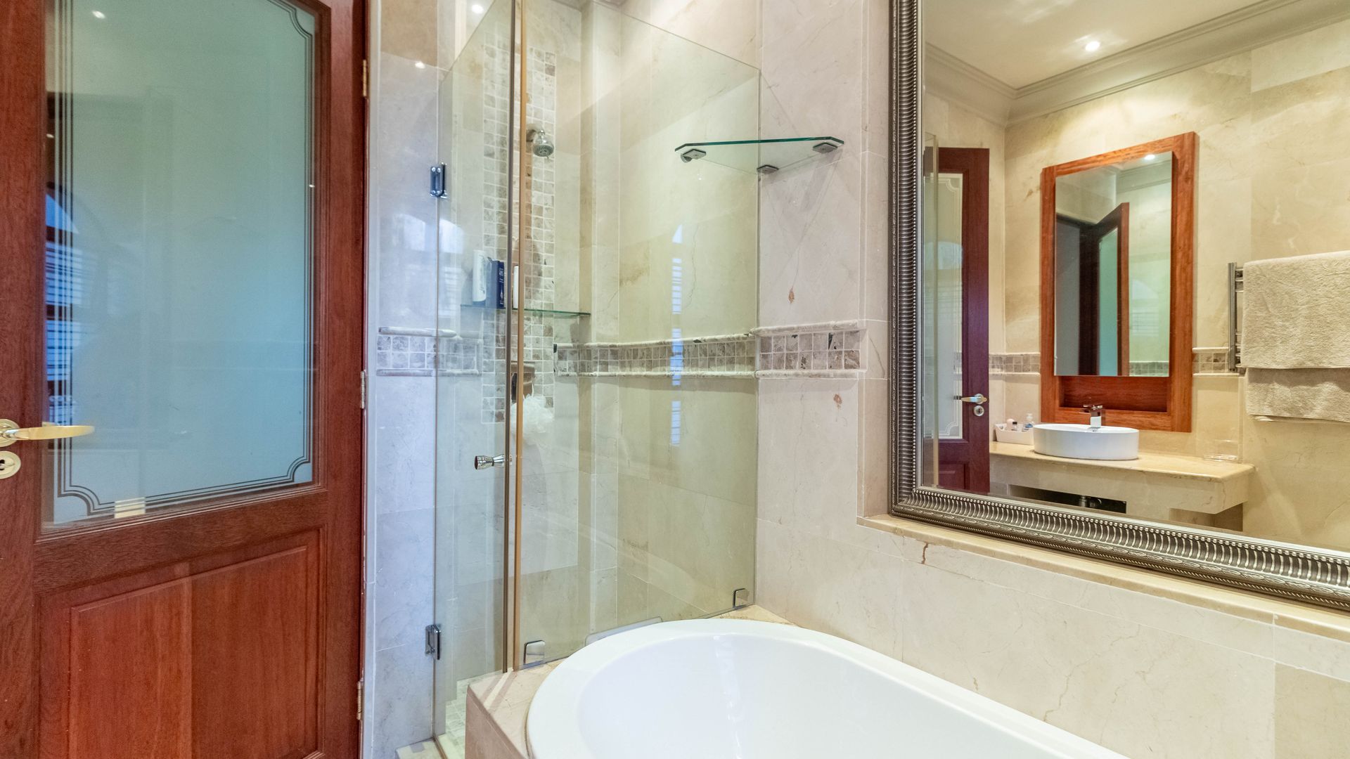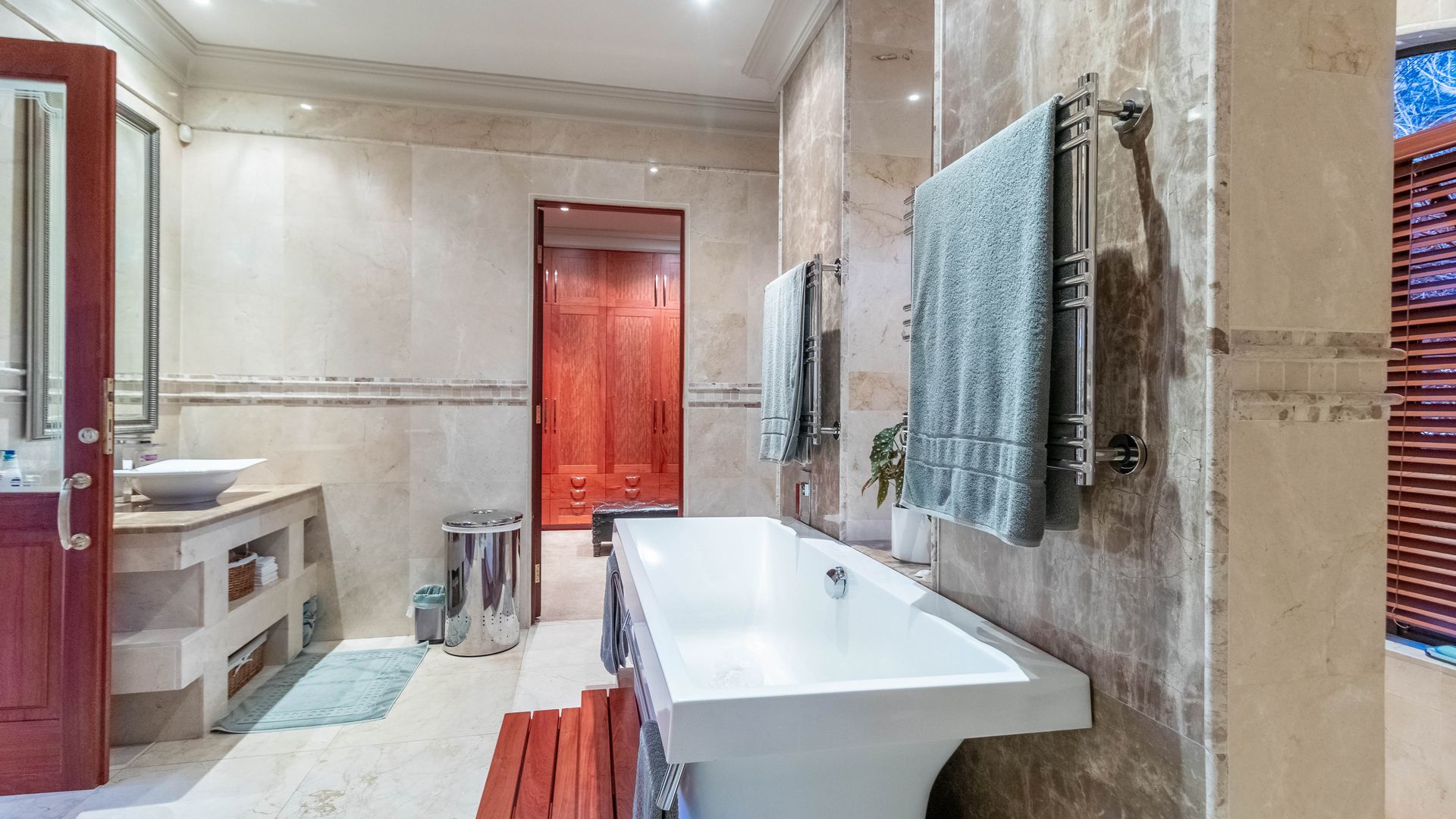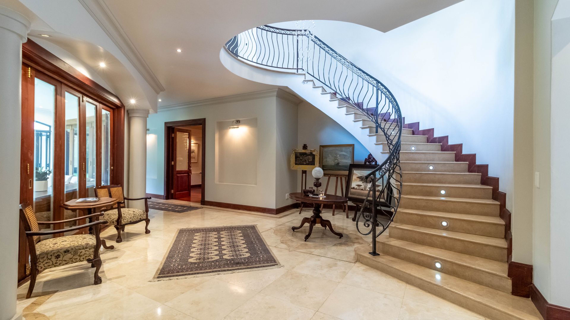 With 5 en-suite bedrooms, all featuring travertine flooring and luxury carpets, the house is a true retreat. The master bedroom offers an air conditioning unit, a full bathroom with a double shower, a full dressing room, and double vanity, plus an additional vanity in the toilet. Every bedroom has its own private balcony.