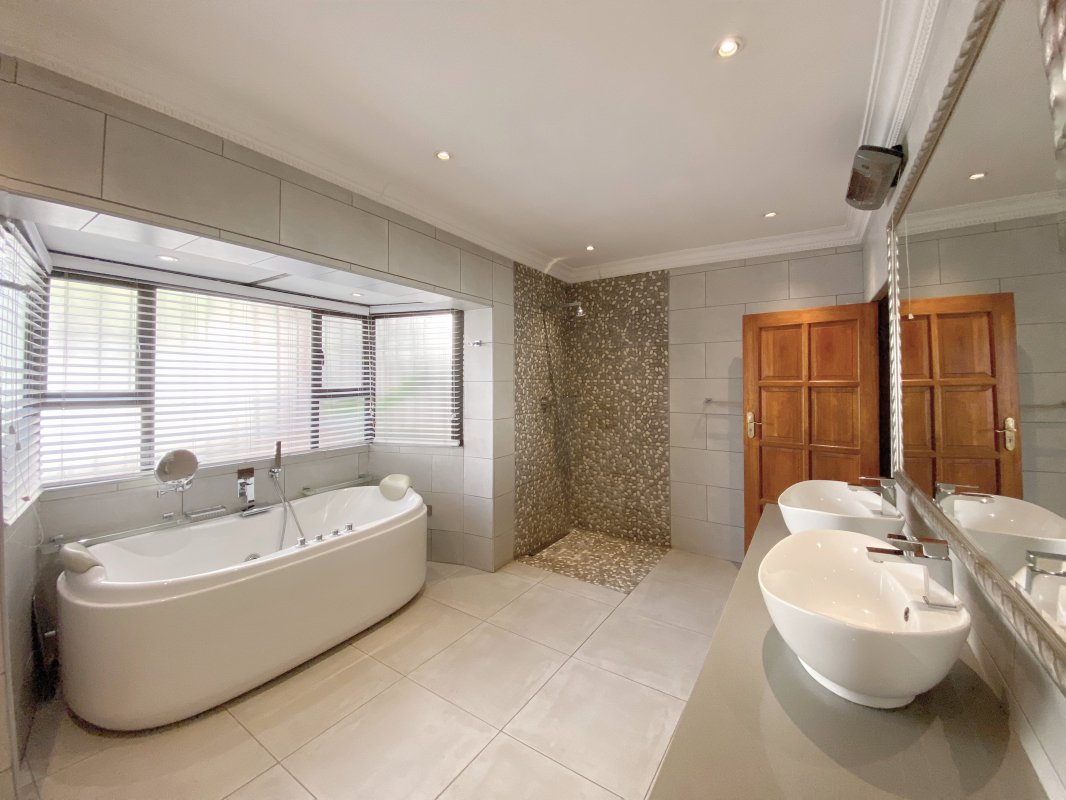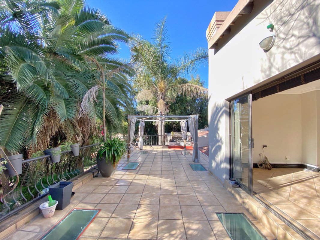 A tropical garden boasting an array of palm trees gives it that resort-like feel with a sparkling pool and neat lawns. Adding to its charm, this residence also provides automated double garages, extra covered parking, and even a borehole to keep the garden looking pristine. With the added peace of mind from being situated in a secure access-controlled area, this home invites you to enjoy every moment—from quiet family dinners to lively outdoor gatherings.