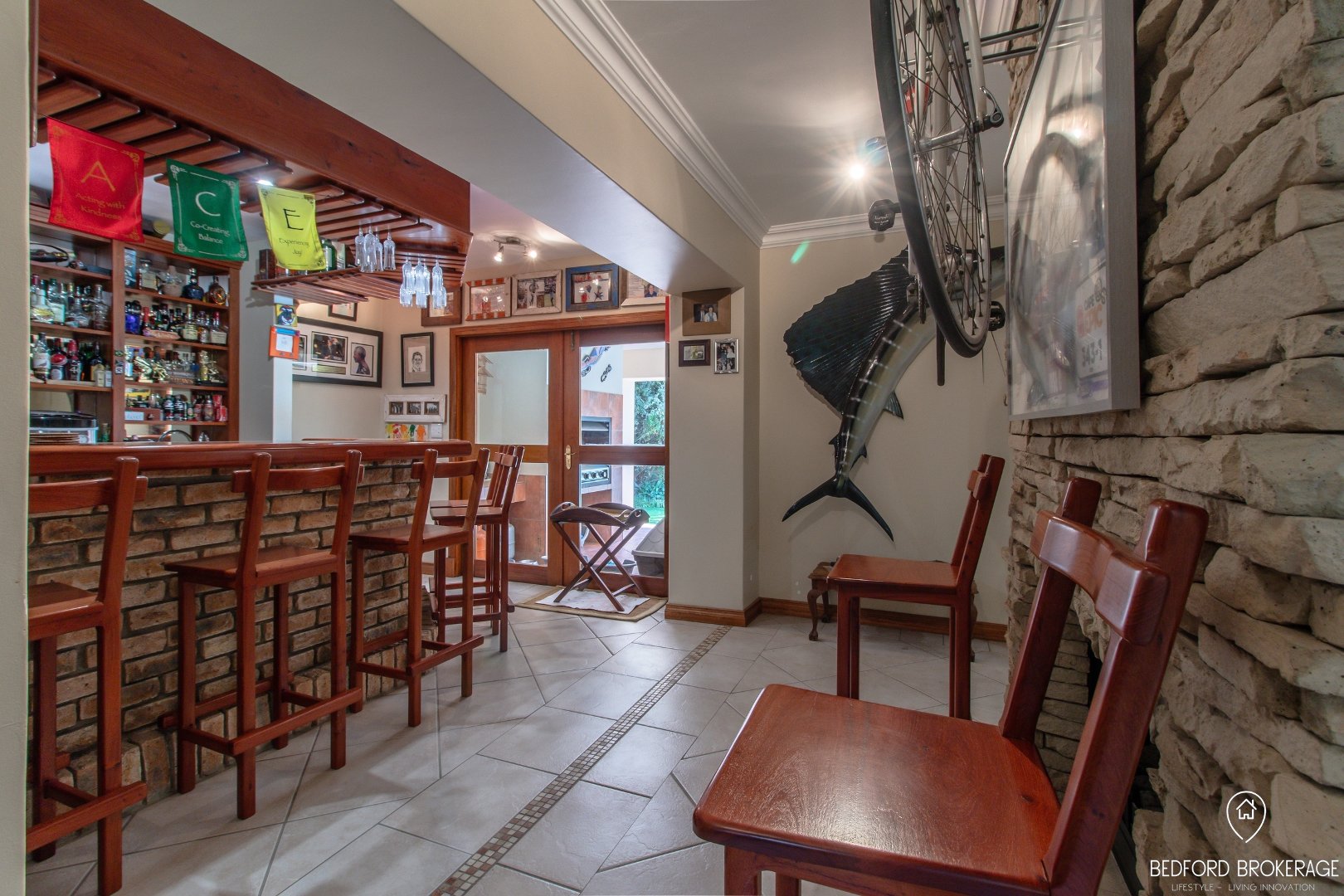 The double-volume dining room is filled with natural light and sets the tone for the rest of the home. It leads into an inviting lounge with a gas fireplace and a fitted bar that opens onto a generous covered patio. The built-in gas braai, sparkling pool and manicured garden create an enviable outdoor entertainment space that works beautifully for both quiet weekends and large gatherings.