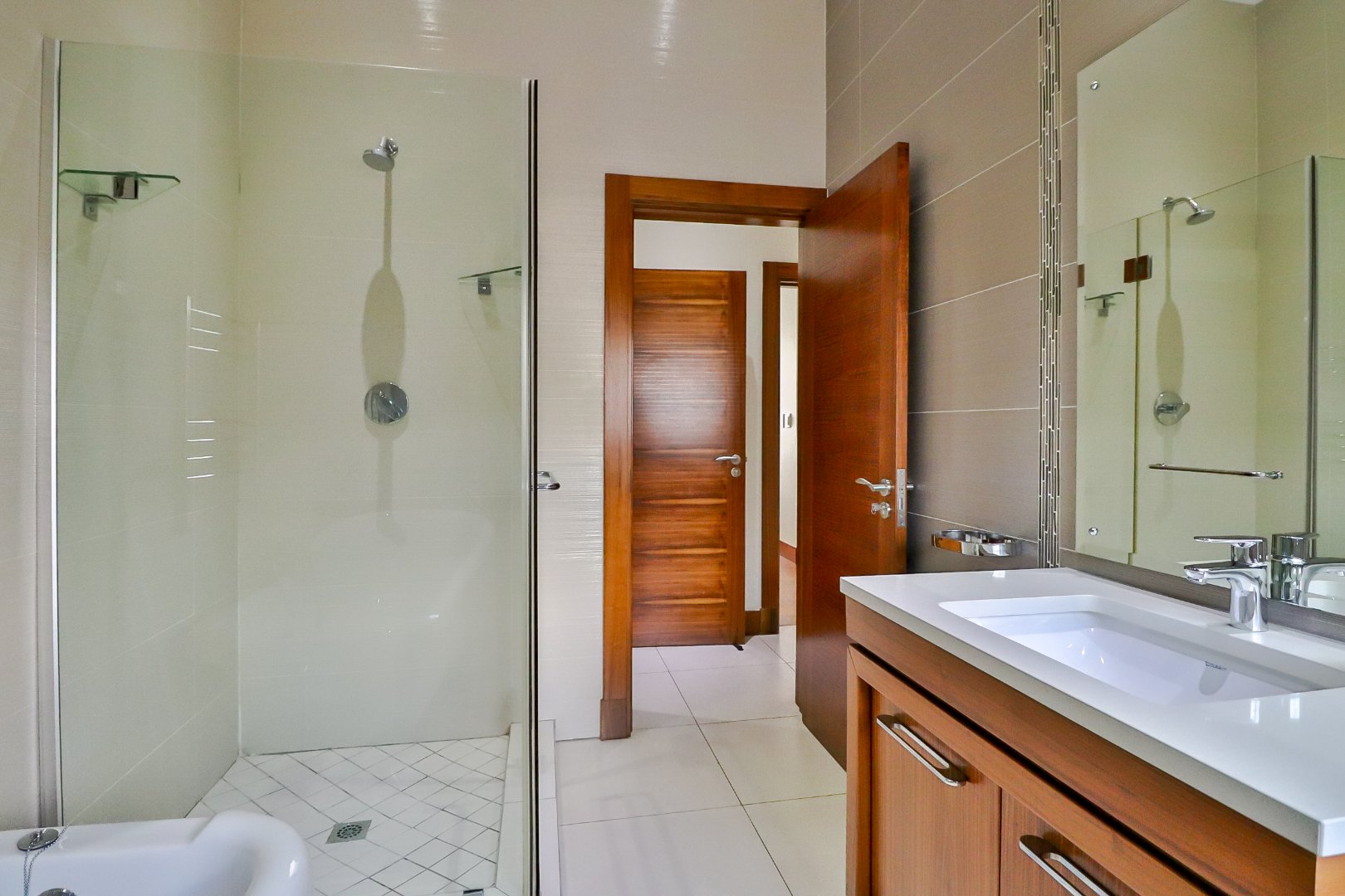 Also located on this level are three spacious bedrooms, a full shared bathroom, and a guest toilet. One bedroom features a luxurious his-and-hers en-suite bathroom, while a large study provides an ideal work-from-home environment.