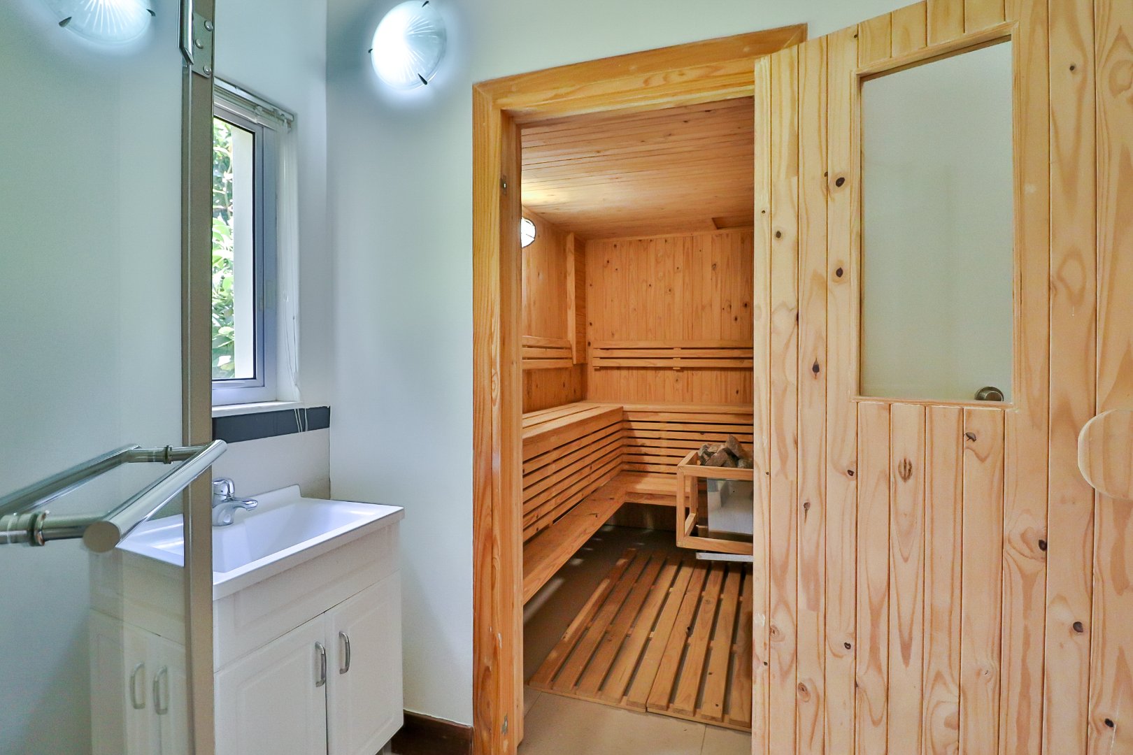 The lower level of the home is designed for leisure and entertainment, offering an extra-large lounge suitable for a gym or games room, a sauna, and a jacuzzi. This space opens onto a patio that leads to a sparkling swimming pool and beautifully landscaped, established garden.