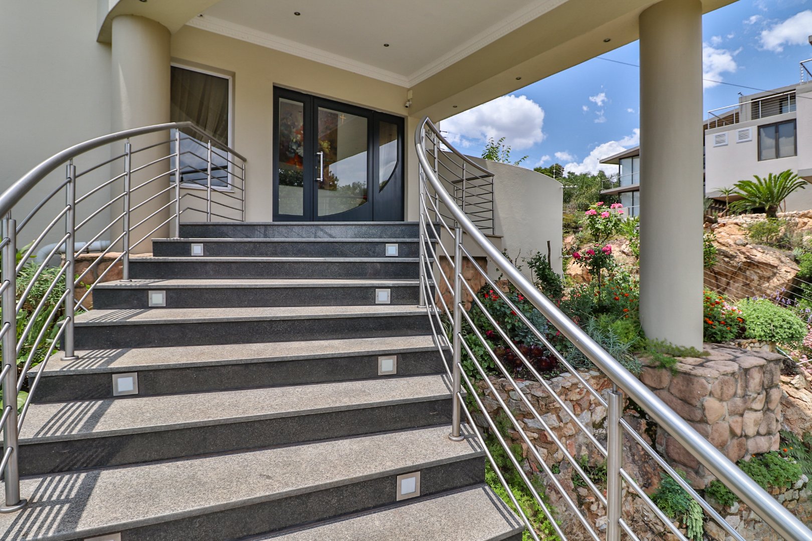 High-quality fixtures and finishes are evident throughout. Stacking doors open onto an expansive covered patio with built-in braai, overlooking a lush, well-established garden that enhances the home’s sense of privacy and tranquility.