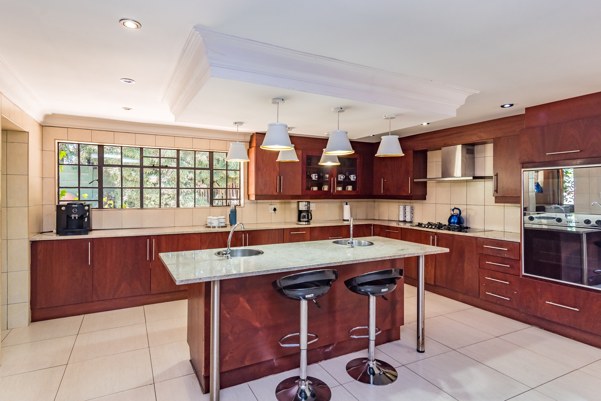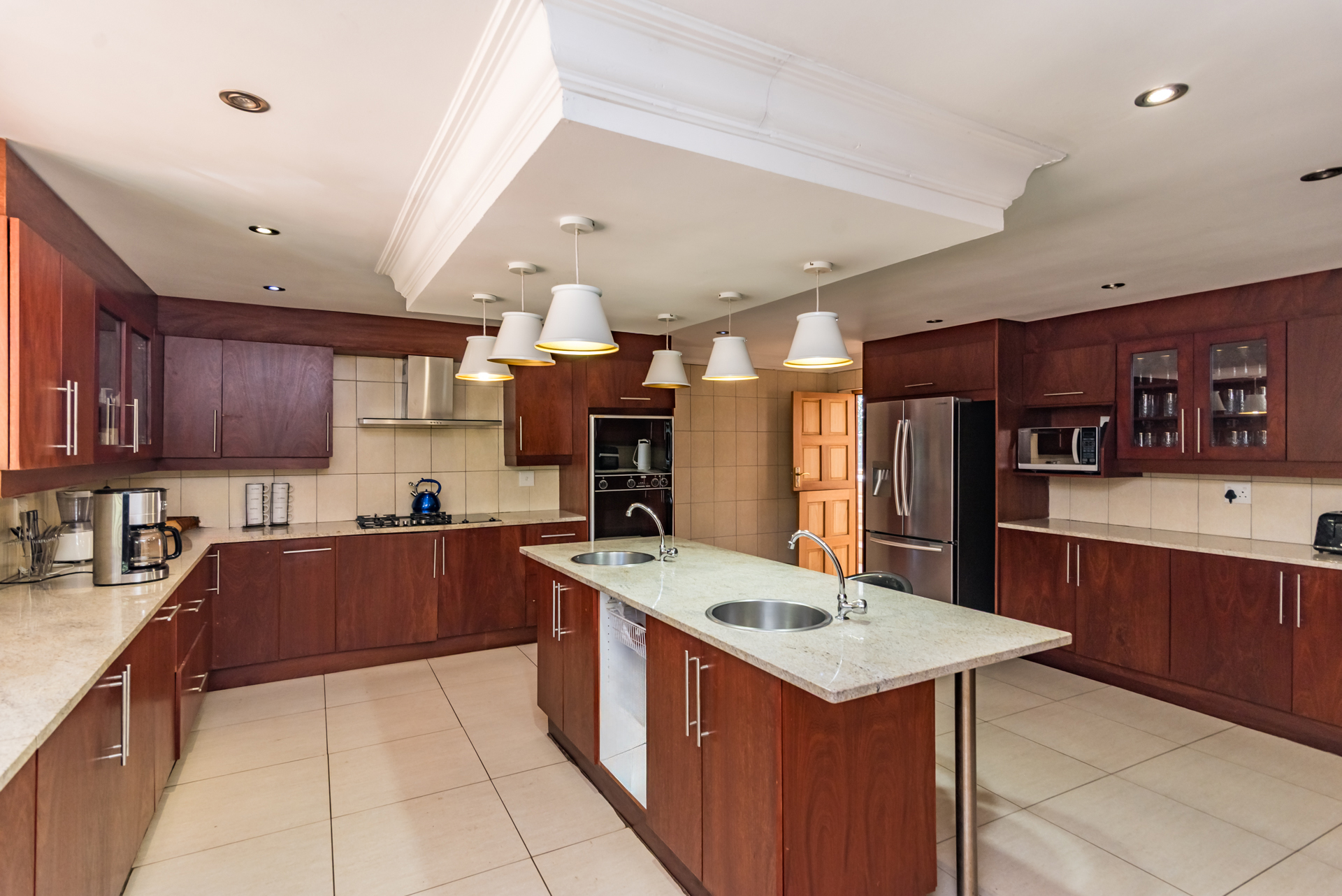 The expansive open-plan gourmet kitchen is fitted with an abundance of wrap-around cabinetry, granite countertops, a breakfast nook, a center island, an electric eye-level oven, a gas hob, and space for three under-counter appliances, along with a pantry and separate scullery.