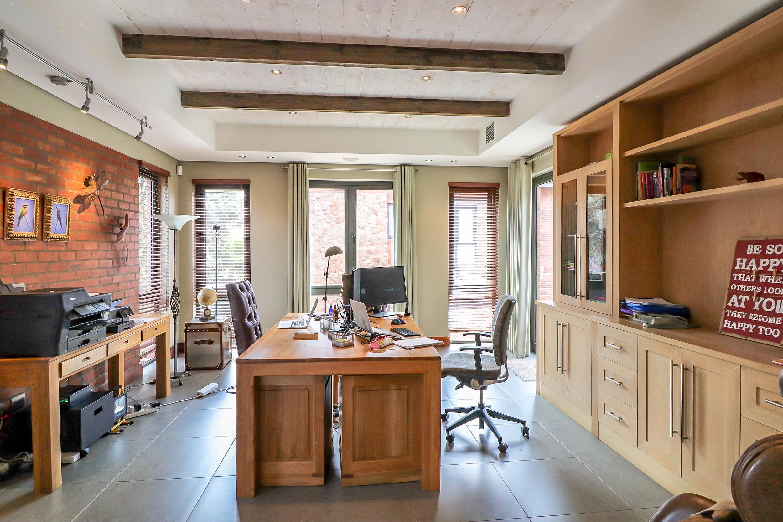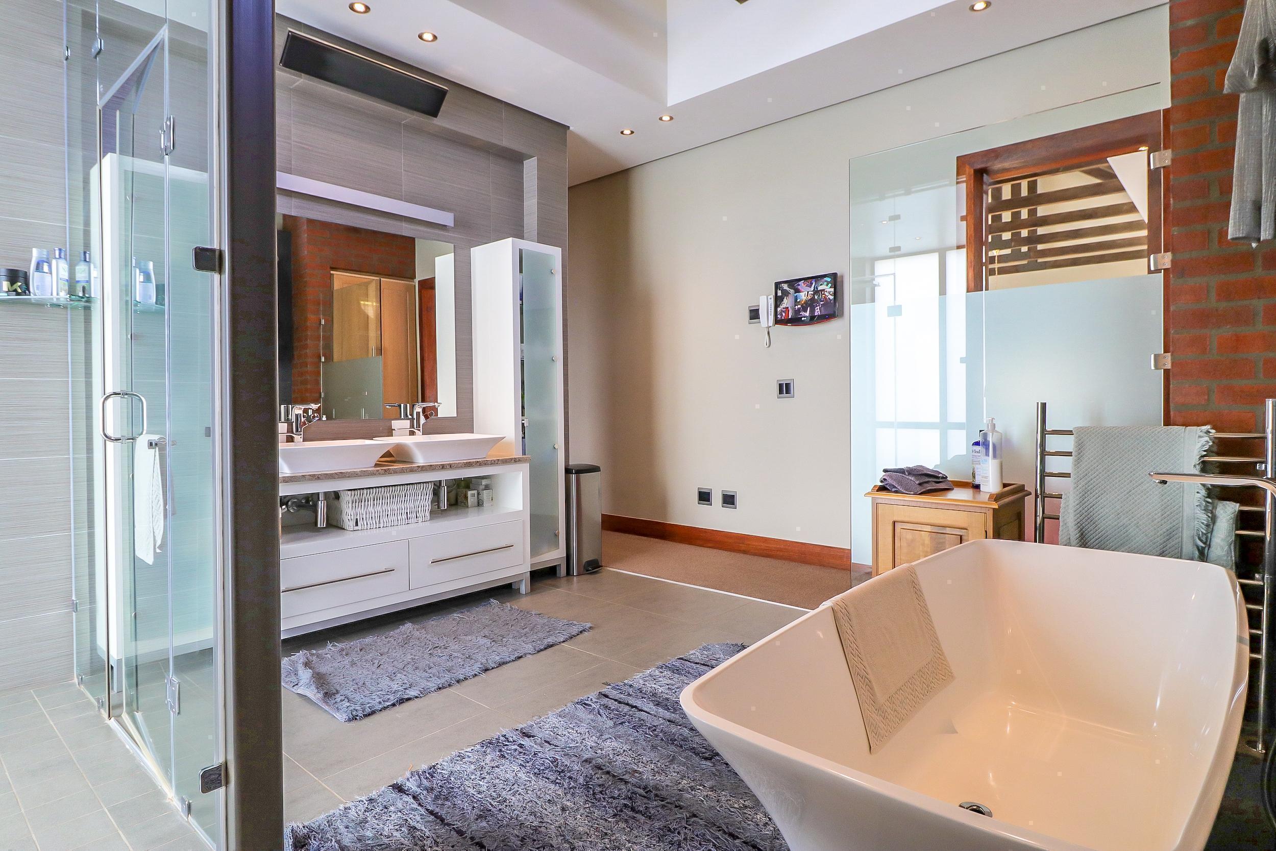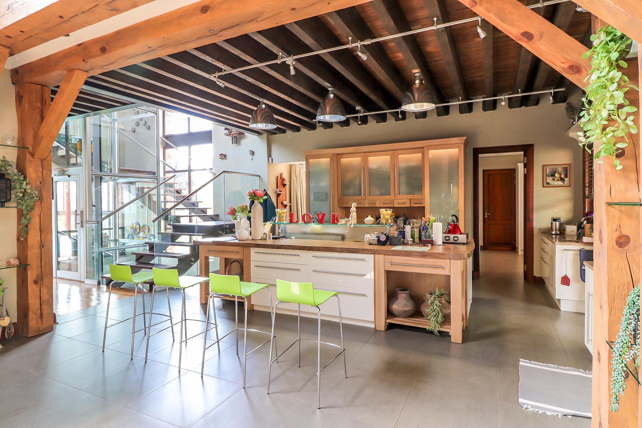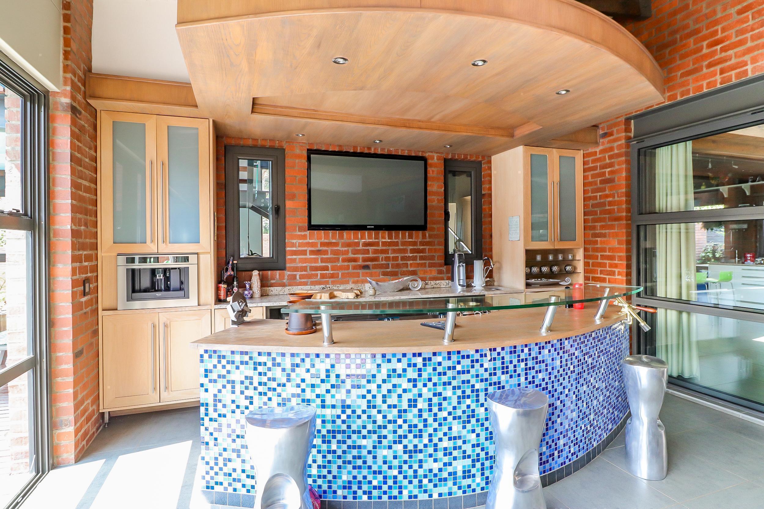 The ground floor is an entertainers delight and includes a gourmet kitchen (with imported AGA stove), scullery and pantry, double volume barn style living room with Morso fireplace, indoor BBQ room with fitted gas BBQ and drinks station (under counter fridges and ice machine), solar heated pool (partially indoor with an automated cover), a winter and summer veranda, a guest suite and awesome hobby room.